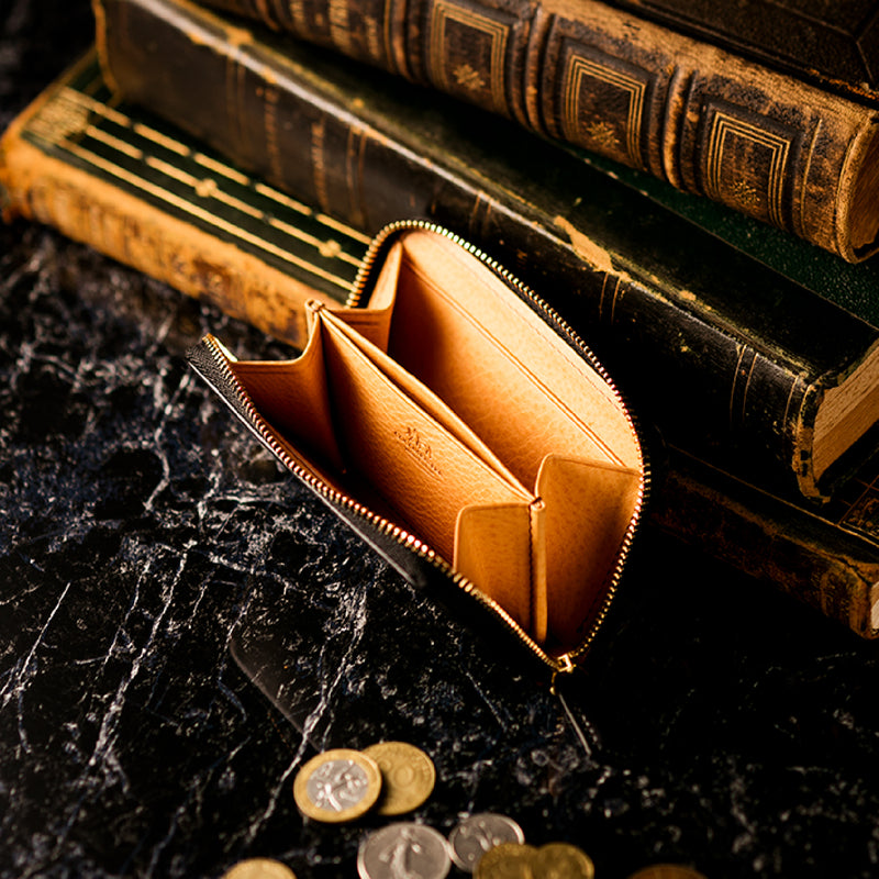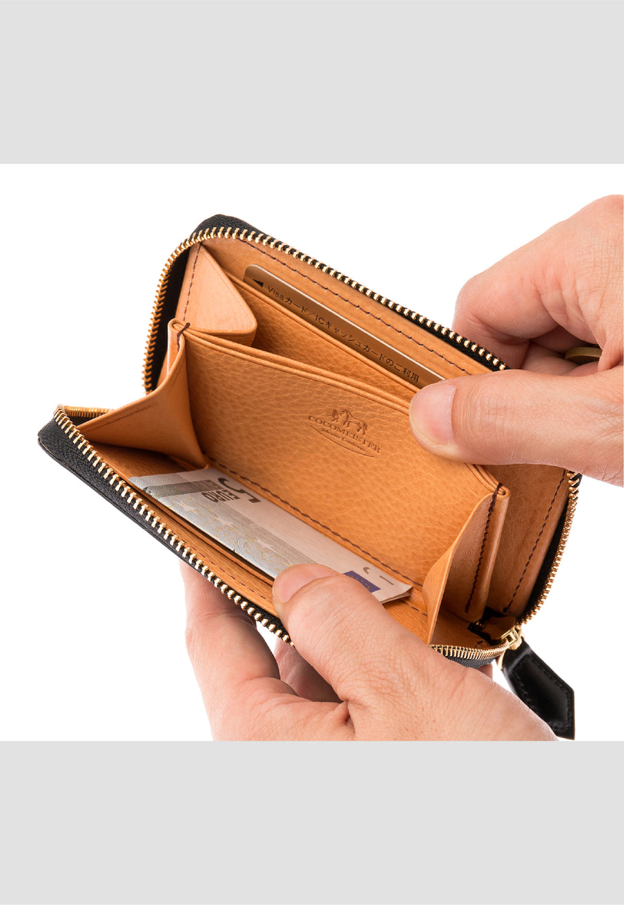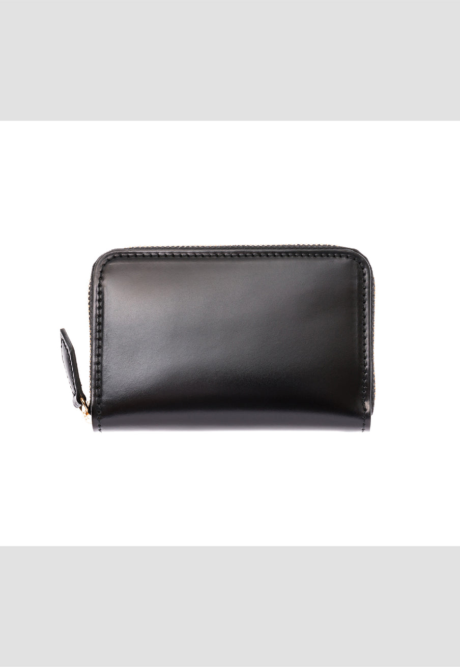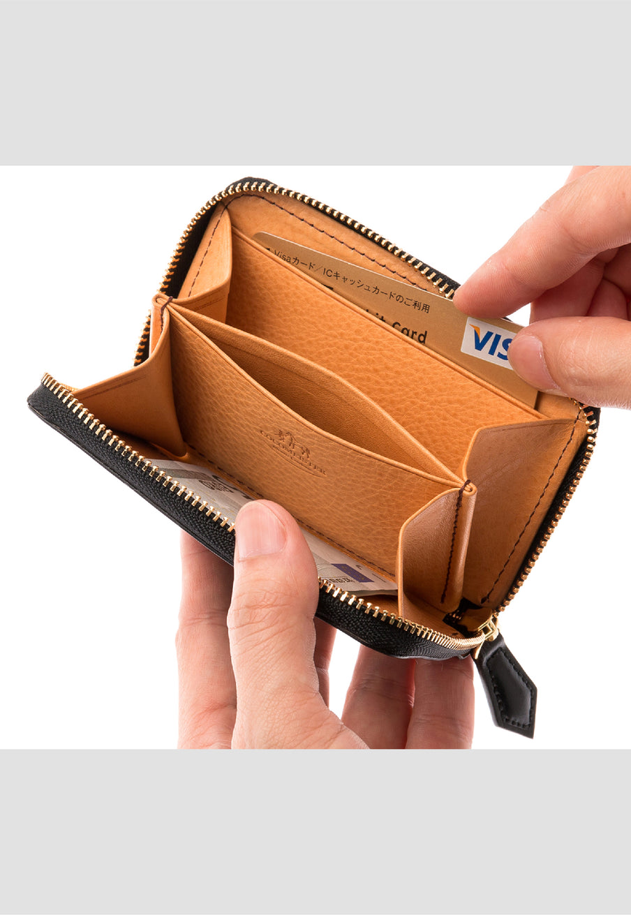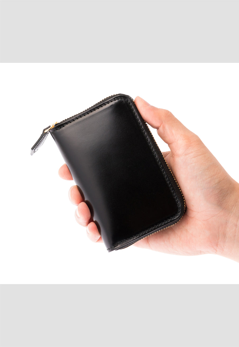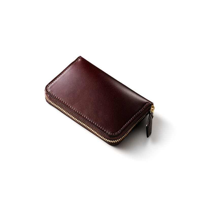 水染めコードバンをシンプルに美しく、そして上品に作り上げたマイスターコードバンコレクション。内装にはイタリアンレザーで革の風合いと経年変化を楽しむ事ができます。ラウンドジップ長財布を小さくしたコインパースです。ラウンドジップと同じ製法で作る、小さいながらも手の込んだ作りが魅力です。車移動にも最適な財布です。| 外寸 | 縦7.6cm×横11.8cm×厚さ1.8cm |