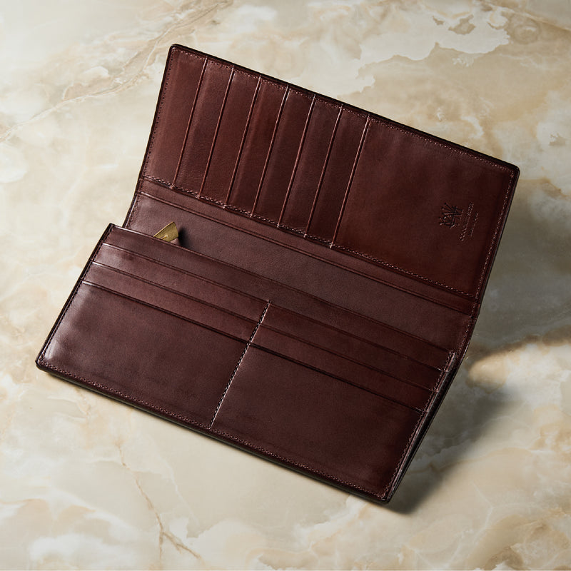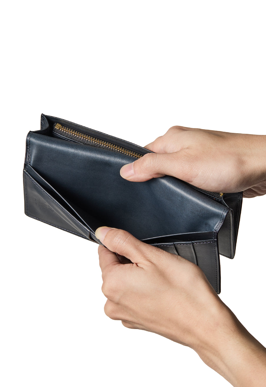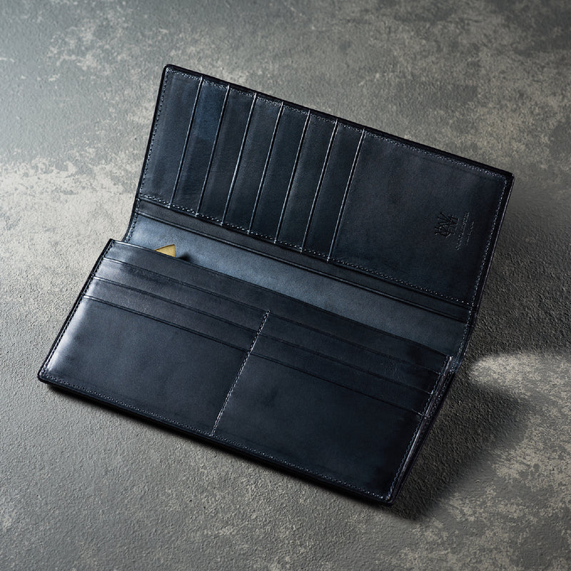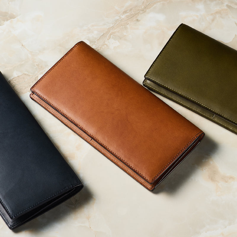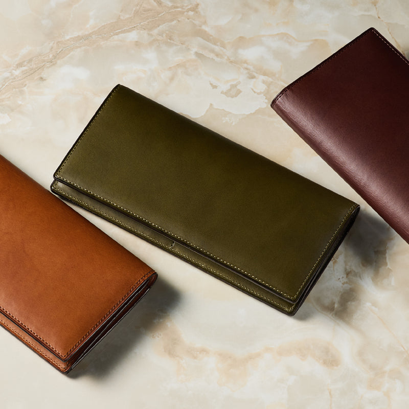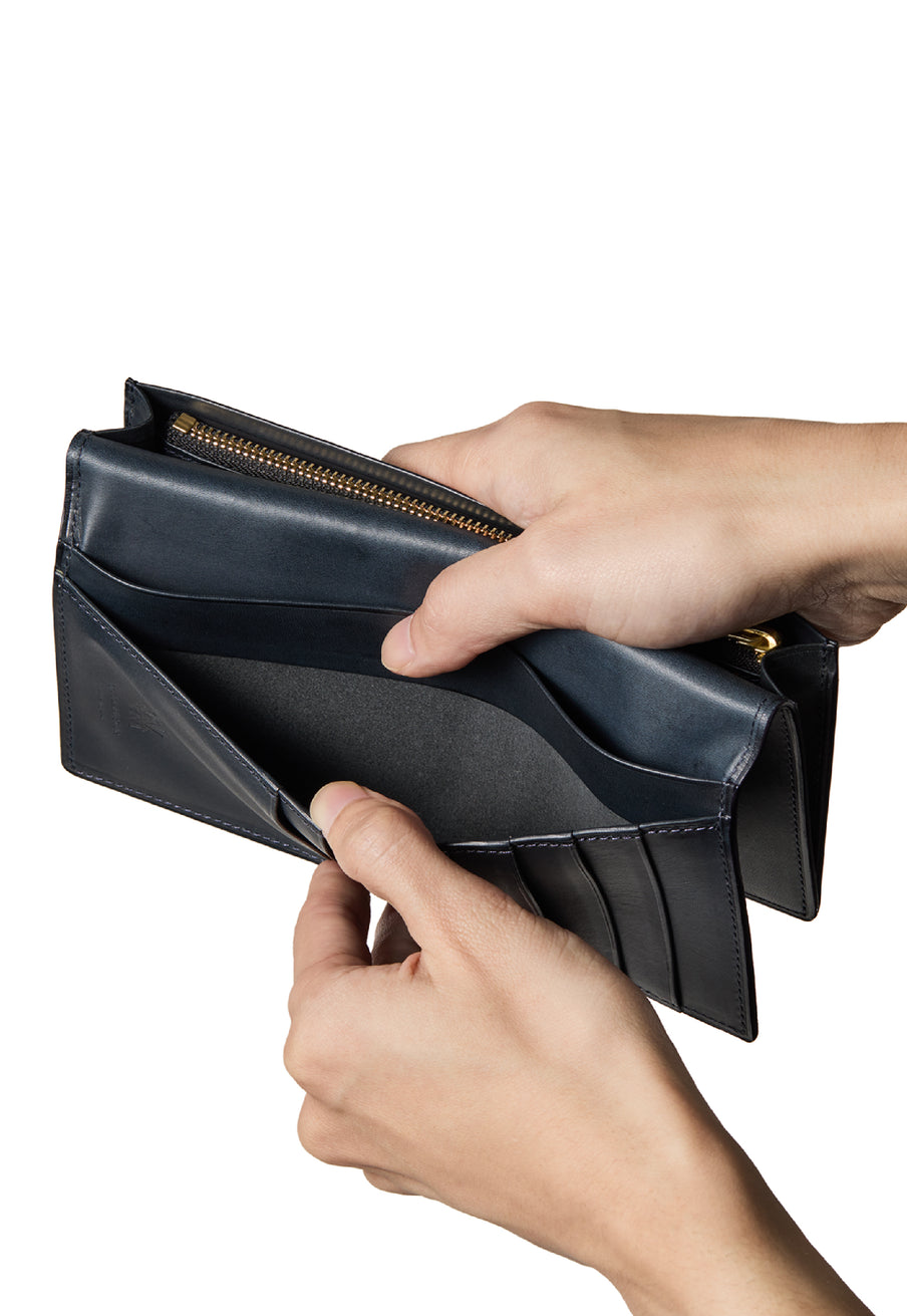 V字マチ(ササマチ)を採用し、開いた際の視認性と使いやすさを両立。スマートなシルエットを保ちながら、スムーズな取り出しをサポート。革の美しさを活かした構造が、洗練された印象を与えます。