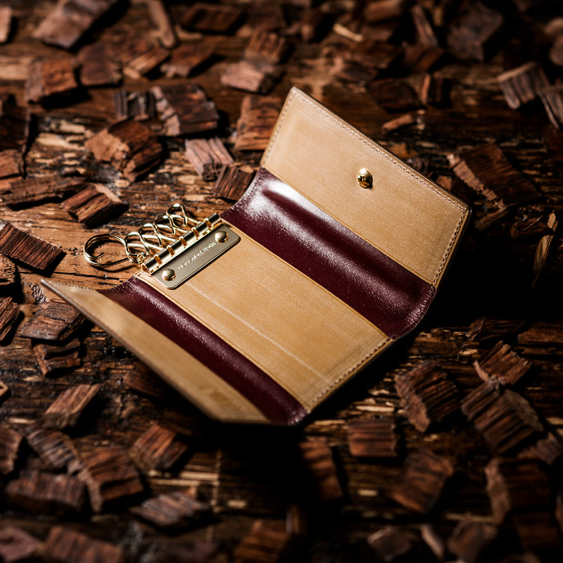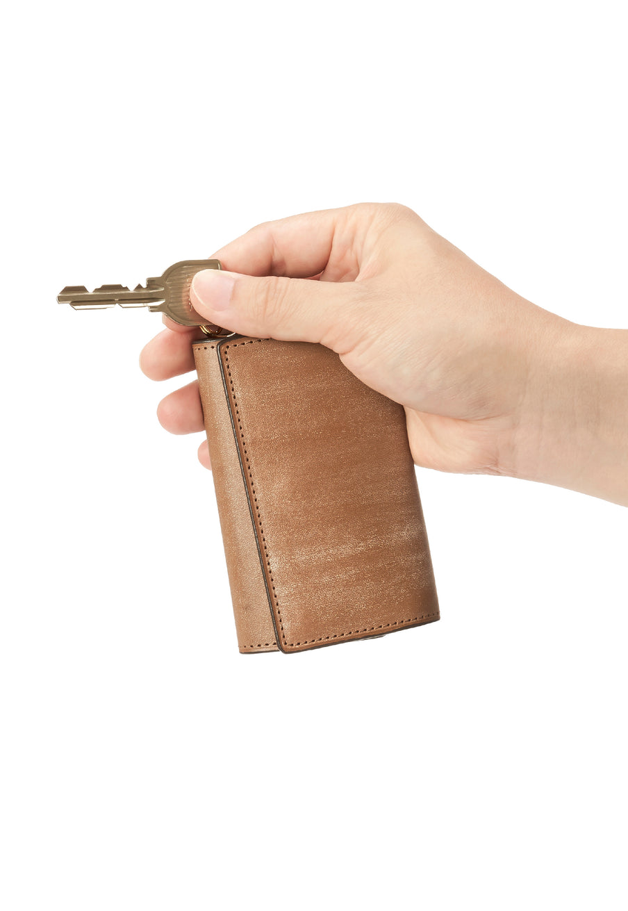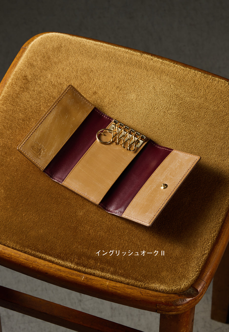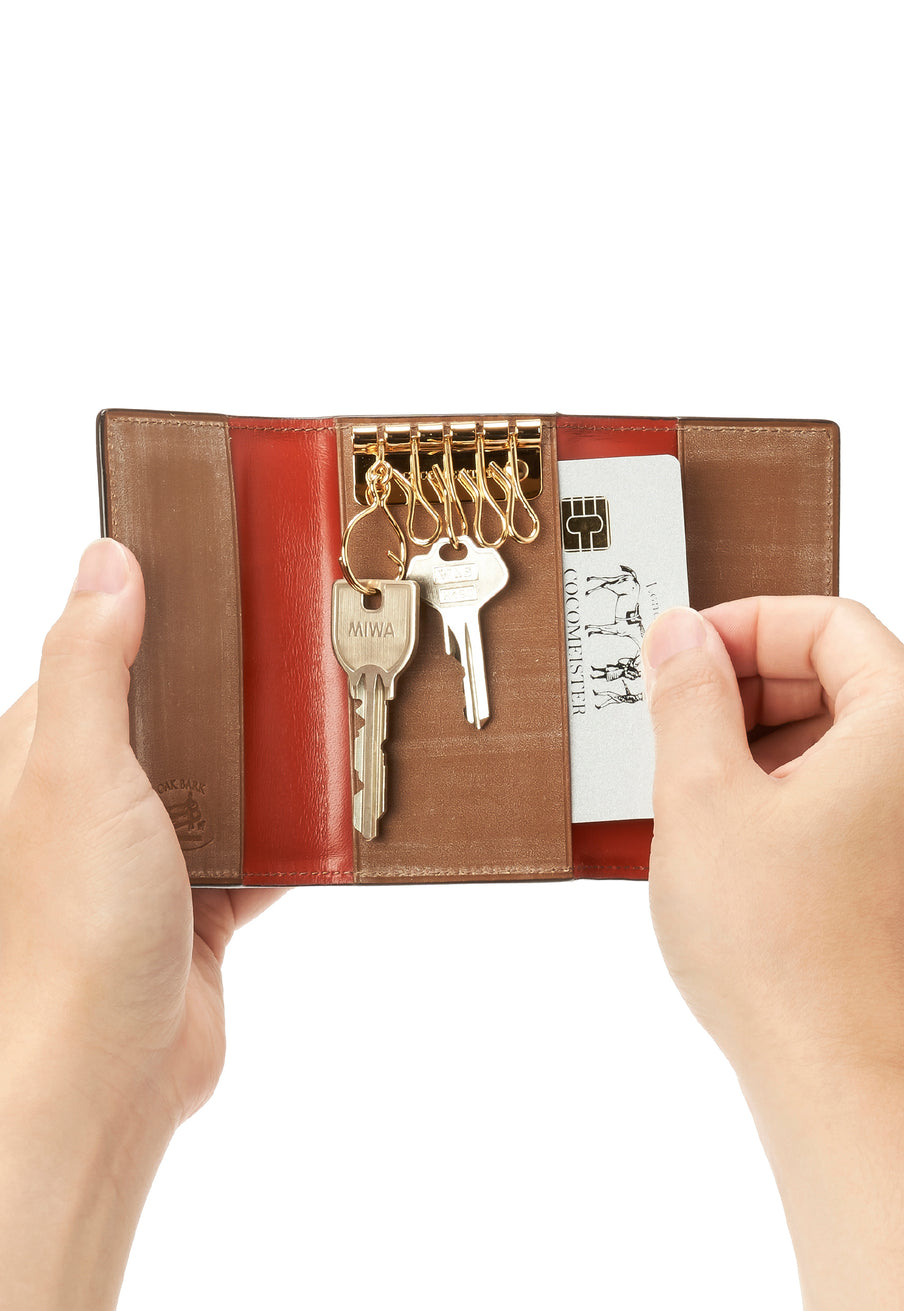 紀元前の製法をそのまま再現したオークバークレザーを使用したシリーズ。ヴィンテージ感溢れる表情は、まさに紀元前の皮革そのもの。しなやかな弾力性を持ち、高い耐久性も高い。新品時から熟成されたエイジングを感じさせる濃厚な風合いが魅力です。革を折りたたむクラシカルかつシンプルなキーケースです。背面にもカードポケットがあり、カード類も収納できます。| 外寸 | 縦11.1cm×横7.2cm×厚さ1.8cm |