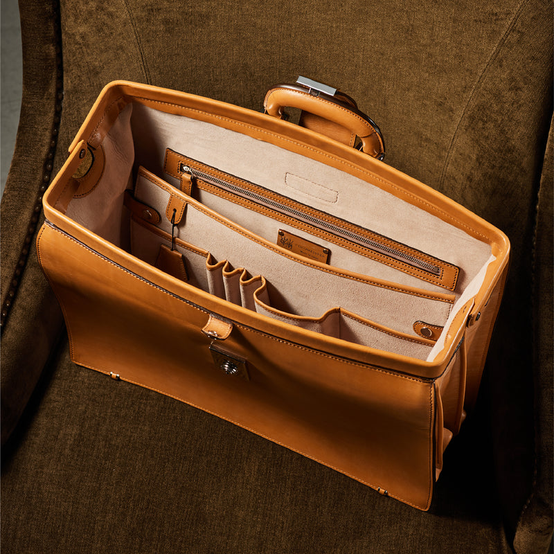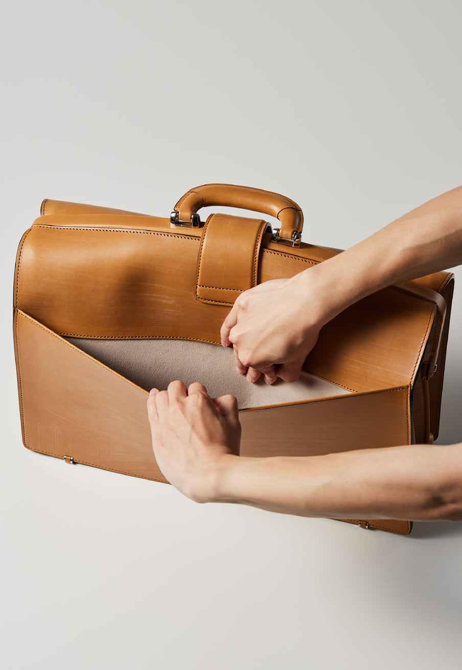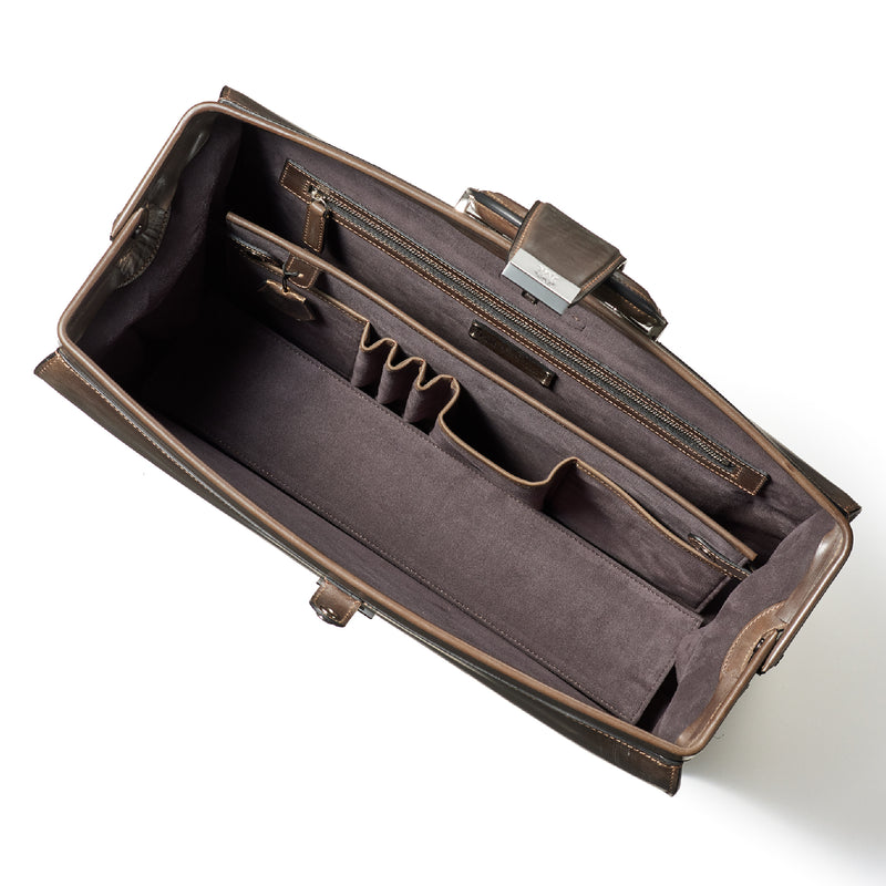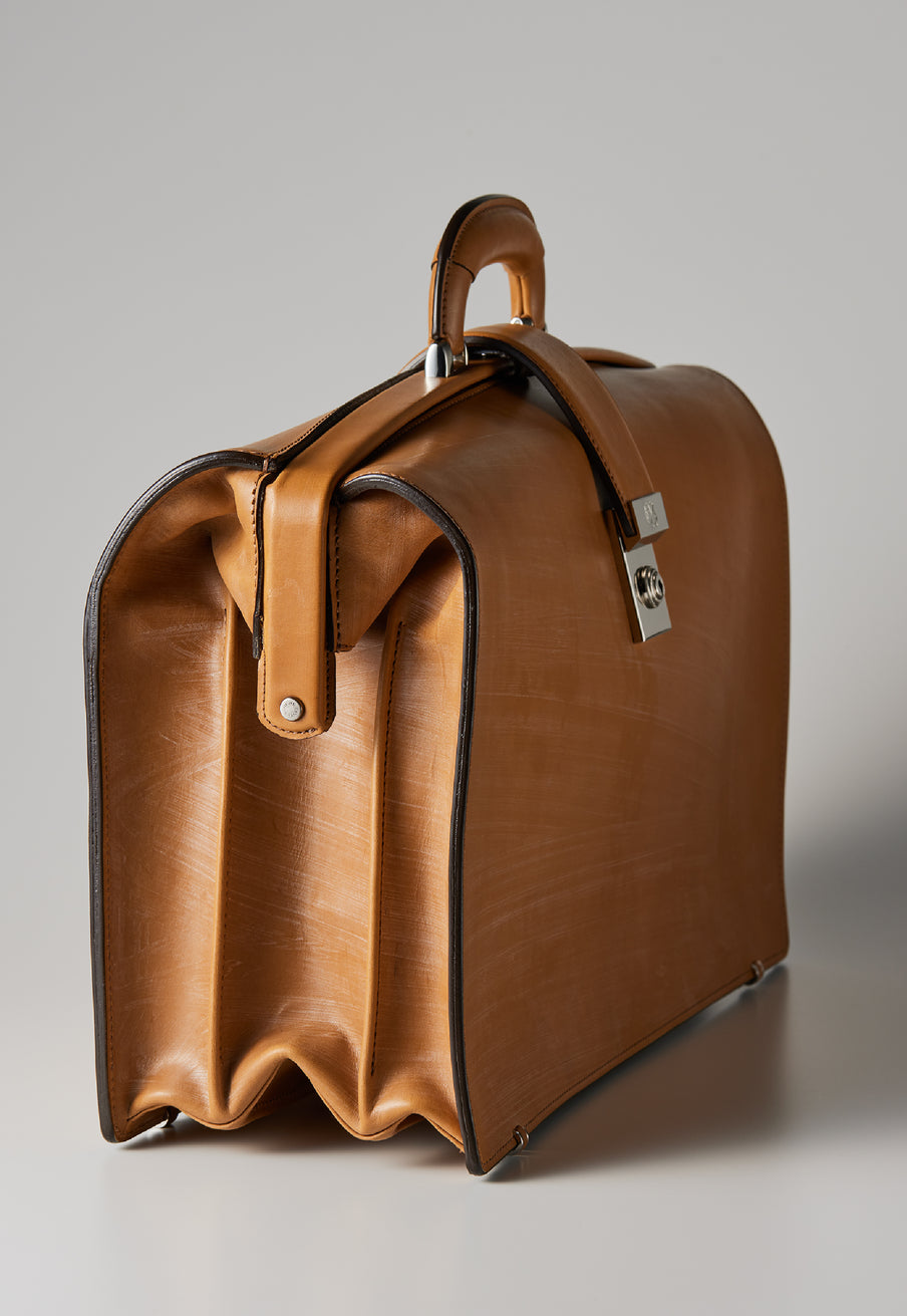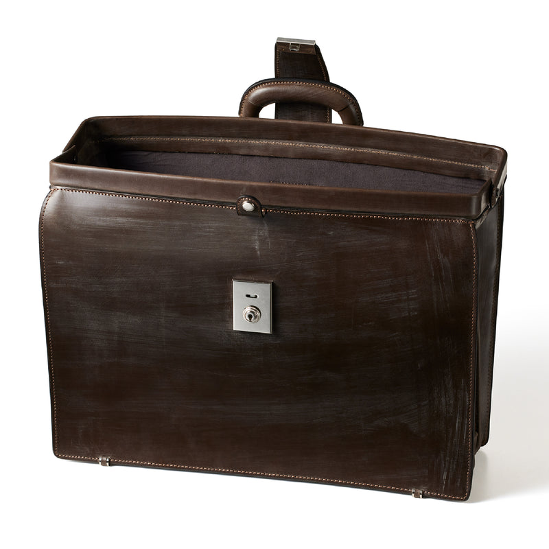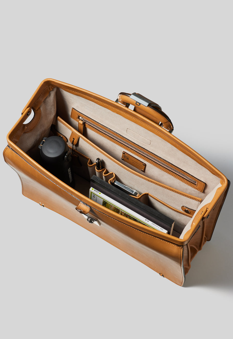 重厚なオークバークレザーが、クラシカルな鞄に圧倒的な存在感を与えます。