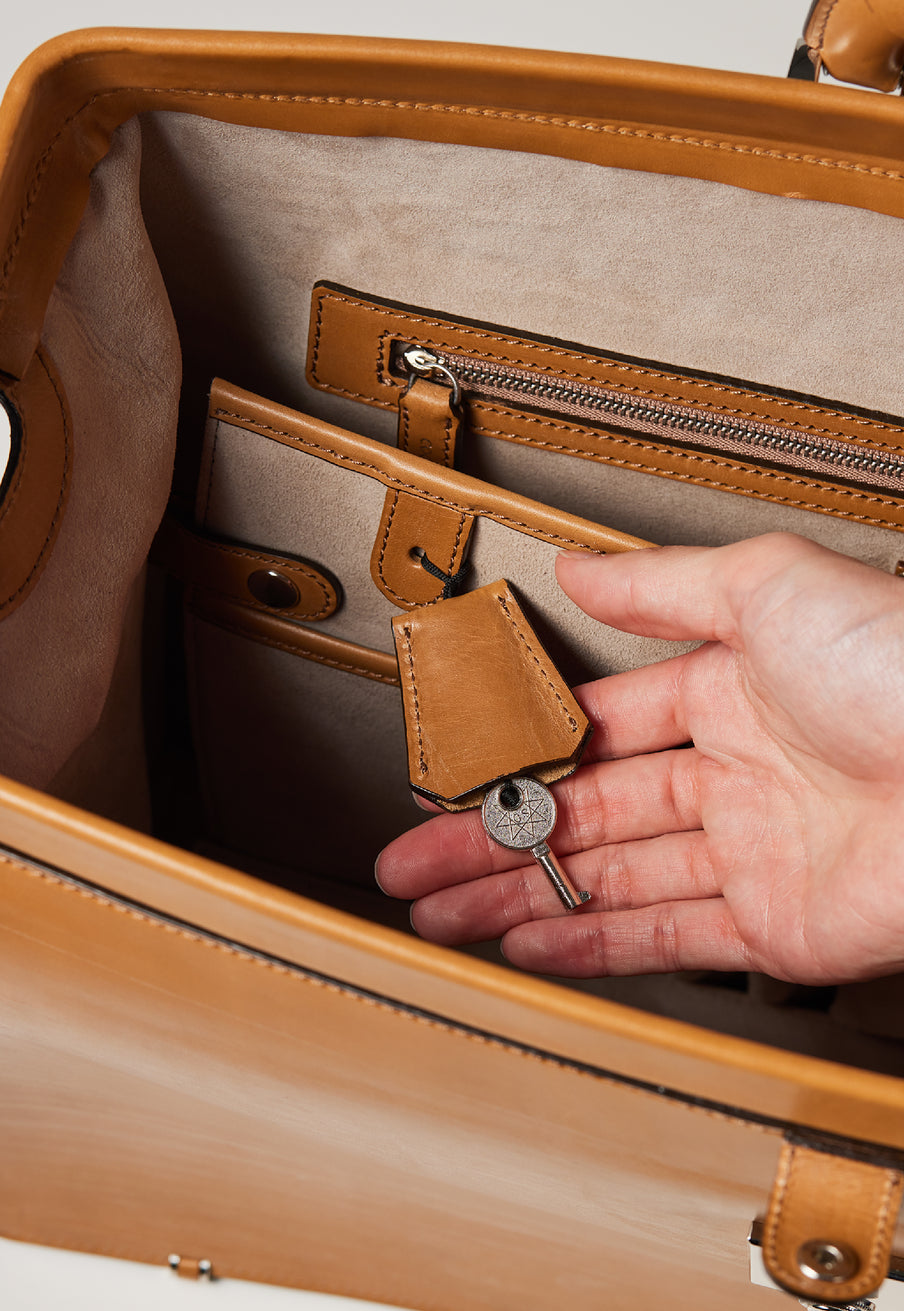 錠前の鍵は革のケースに収納しており、内装に紐で取り付けられています。