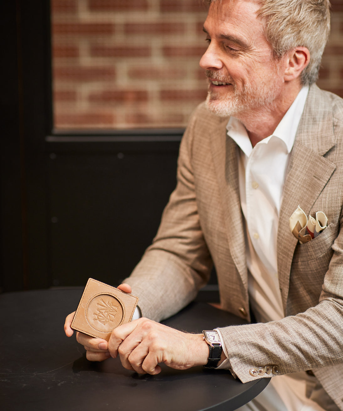 革とステッチのコントラストがとても洗練された表情を見せてくれます。中央にはココマイスターのロゴが素押しで押されています。