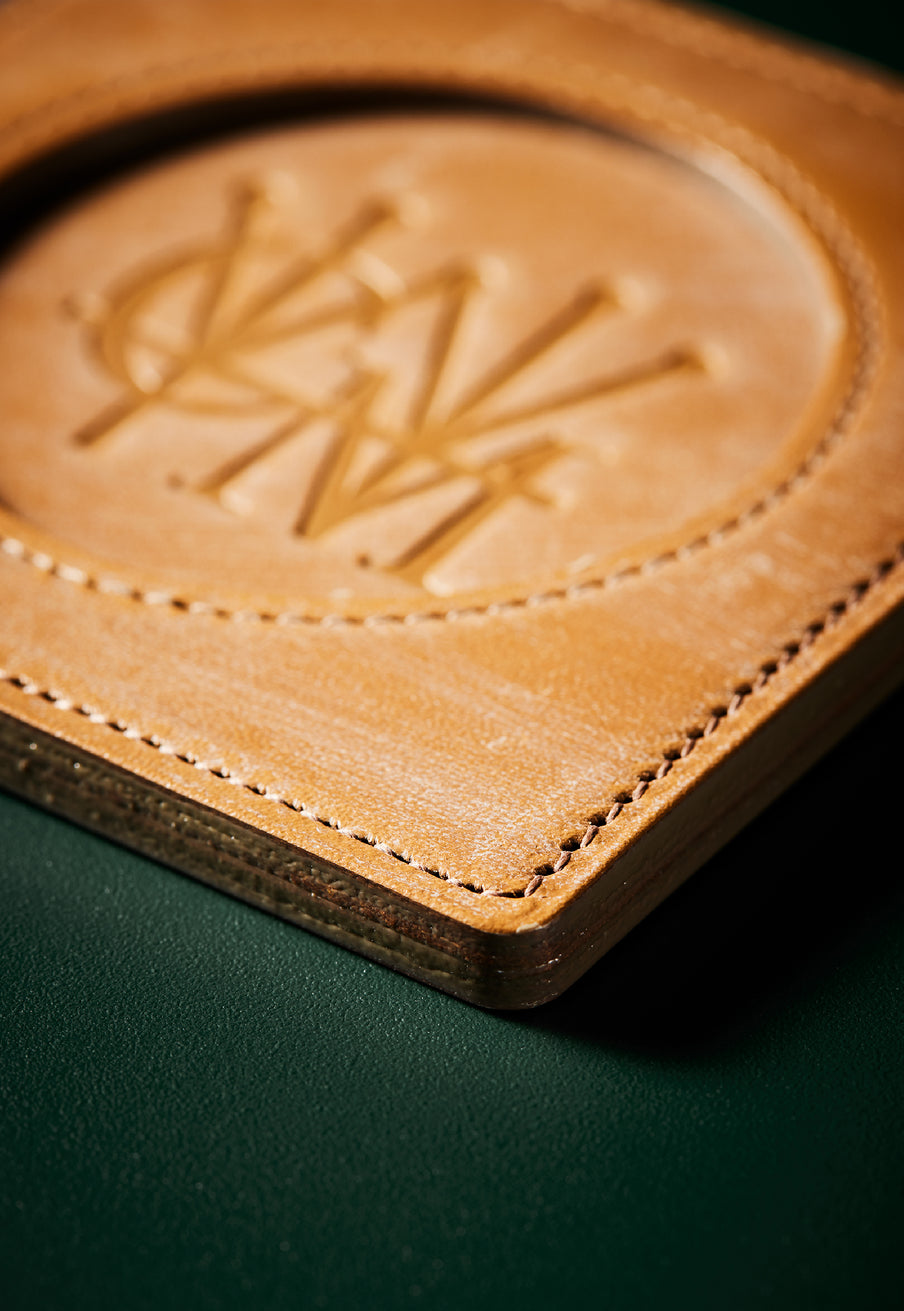 オークバークレザーを複数枚重ねることで仕立てています。財布小物を製作する職人が仕立てていますので、いつものオークバークコレクションのクオリティをインテリアでお楽しみいただけます。