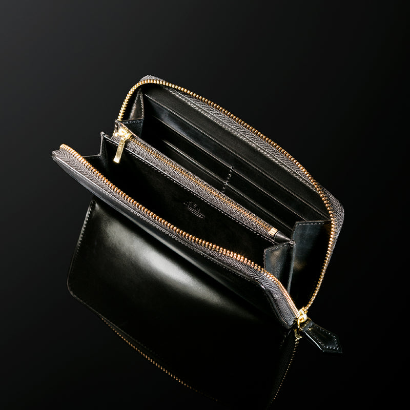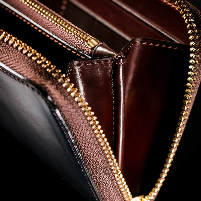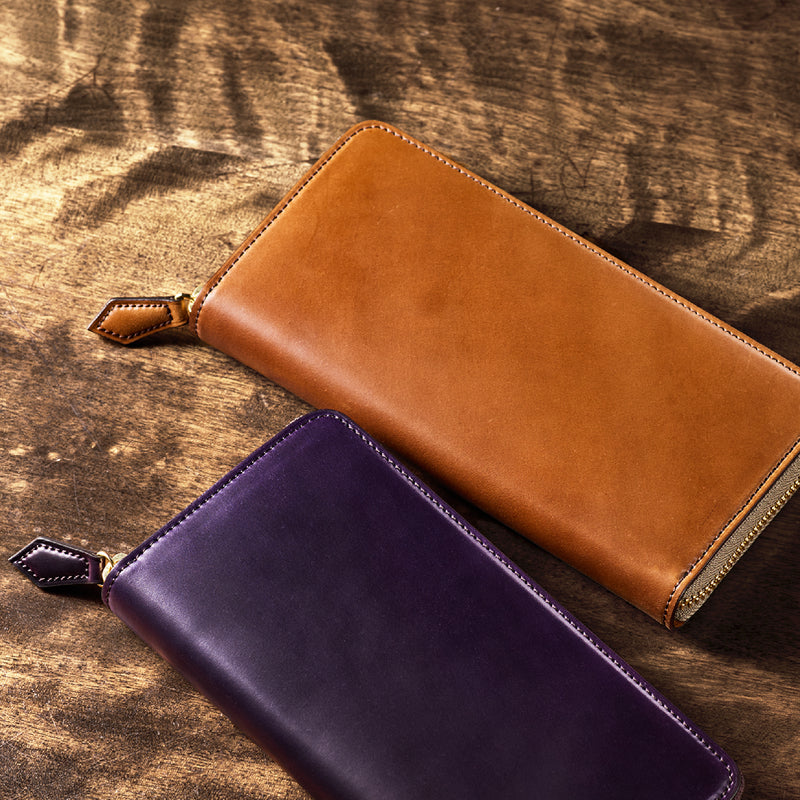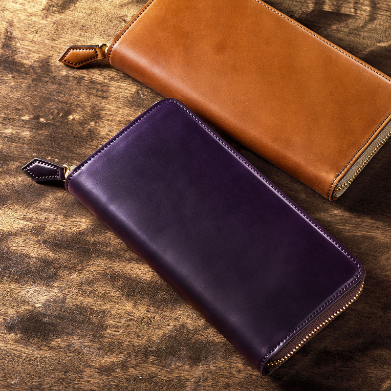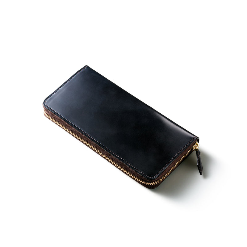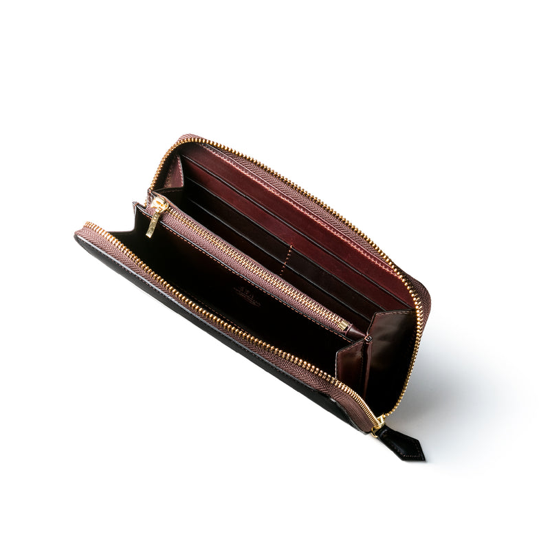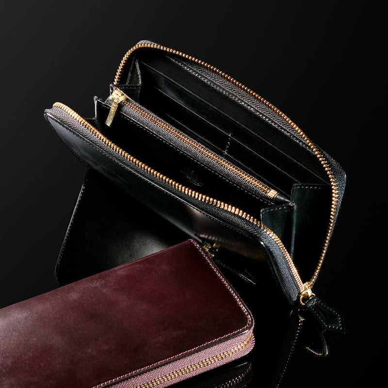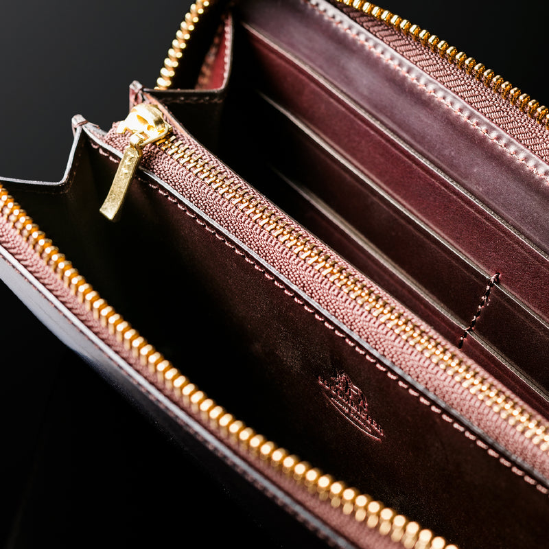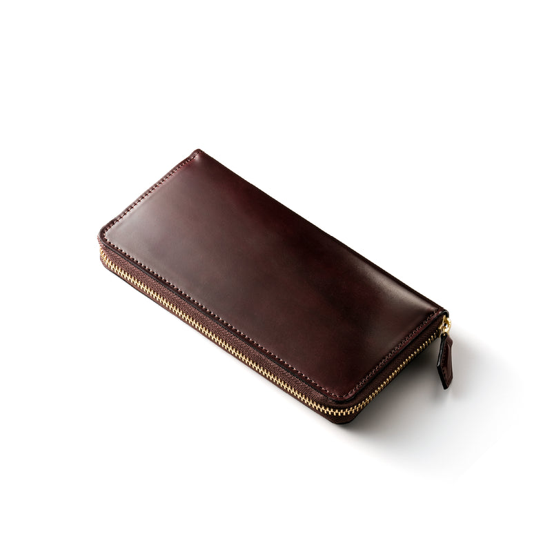 自然の風合いを極限まで残したシェルコードバンを使用したコレクションです。このシェルコードバンは米国産でホーウィン社というタンナーが製造した皮革。経年変化が魅力で、マットな風合いから艶やかで鈍い光沢を放つまで変化します。ラウンドジップ型の長財布は、重厚なデザインが魅力です。カード、お札、小銭を中に収納でき散らばらないので、鞄に入れて持ち運ぶのにも便利な形です。| 外寸 | 縦9.5cm×横19.2cm×厚み2cm |