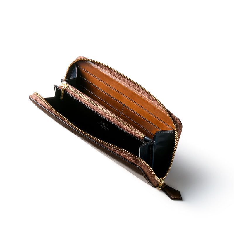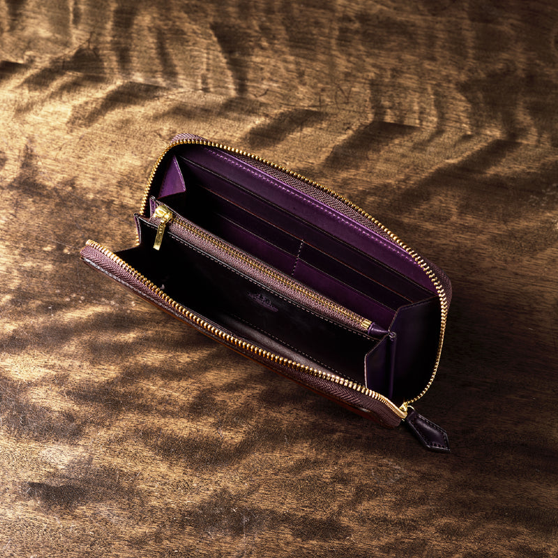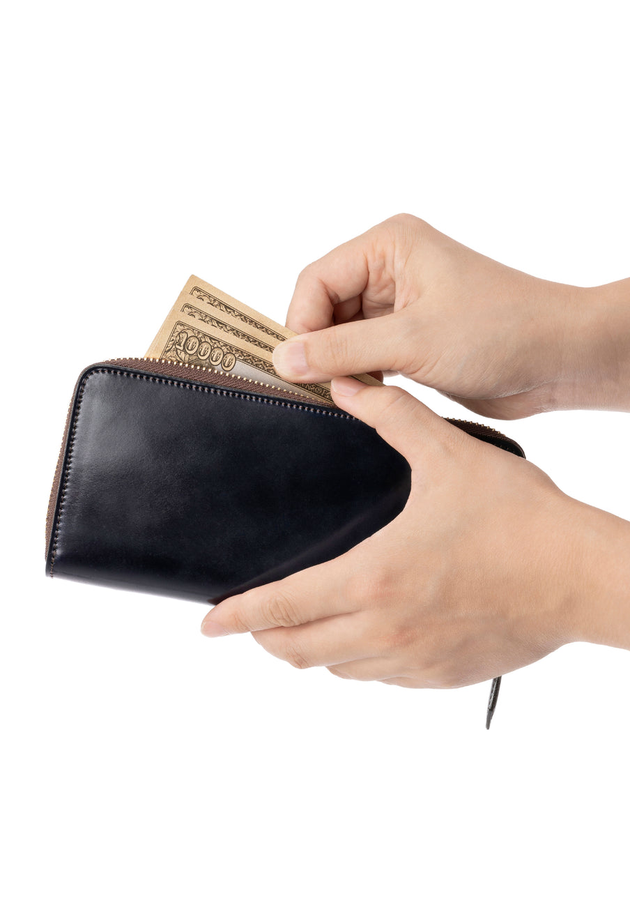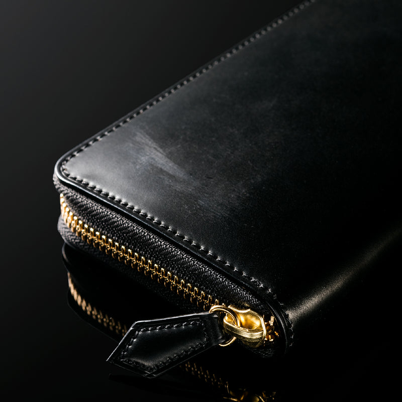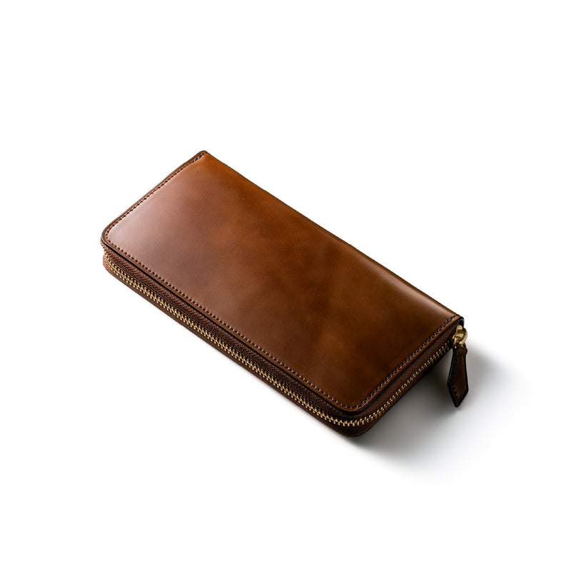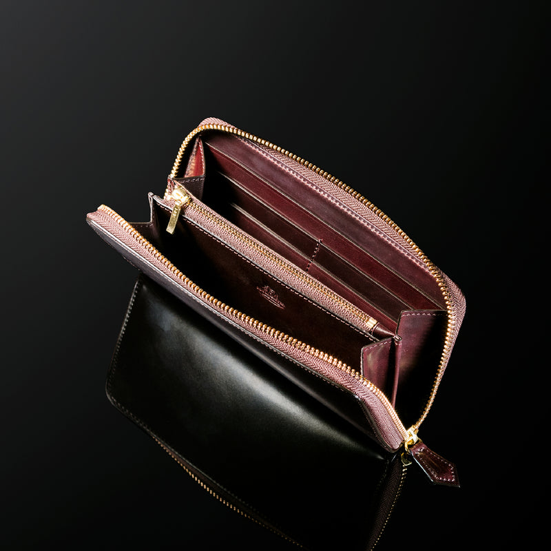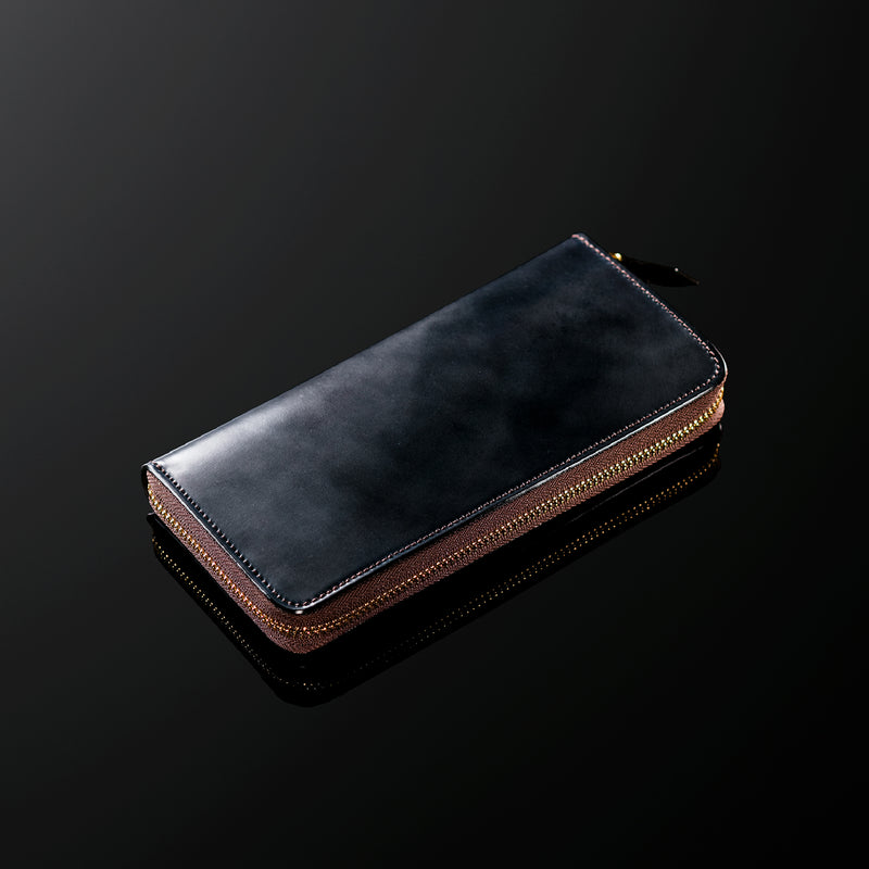 自然の風合いを極限まで残したシェルコードバンを使用したコレクションです。このシェルコードバンは米国産でホーウィン社というタンナーが製造した皮革。経年変化が魅力で、マットな風合いから艶やかで鈍い光沢を放つまで変化します。ラウンドジップ型の長財布は、重厚なデザインが魅力です。カード、お札、小銭を中に収納でき散らばらないので、鞄に入れて持ち運ぶのにも便利な形です。| 外寸 | 縦9.5cm×横19.2cm×厚み2cm |