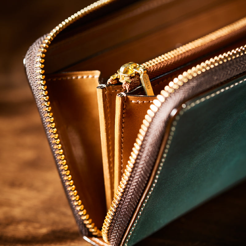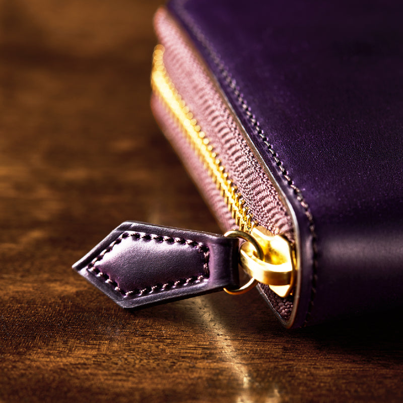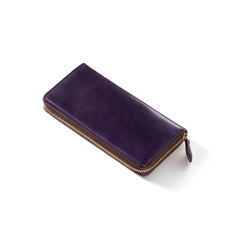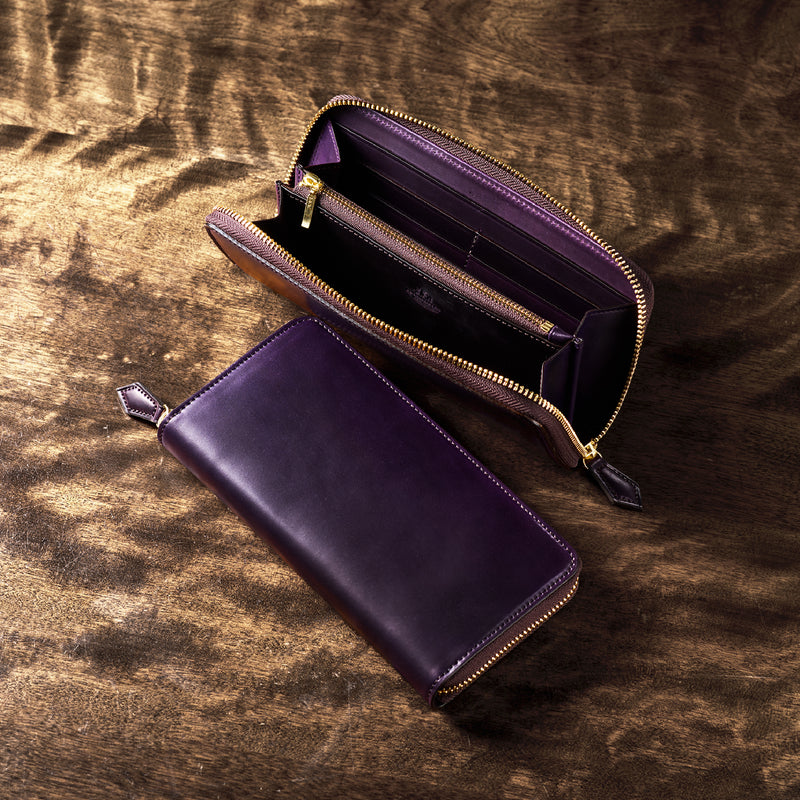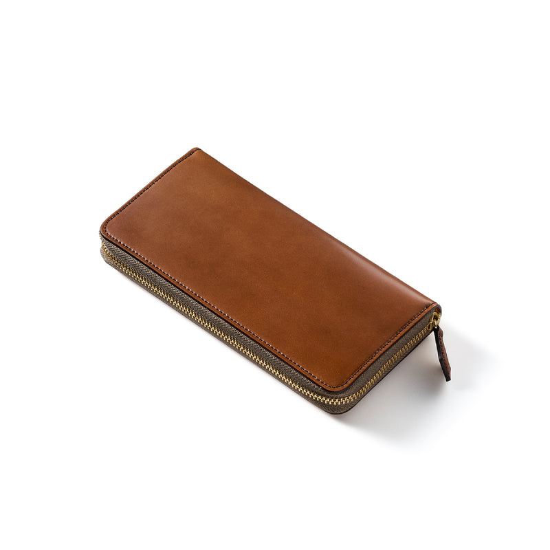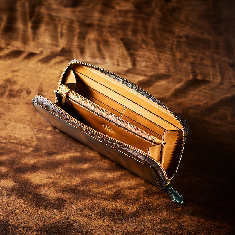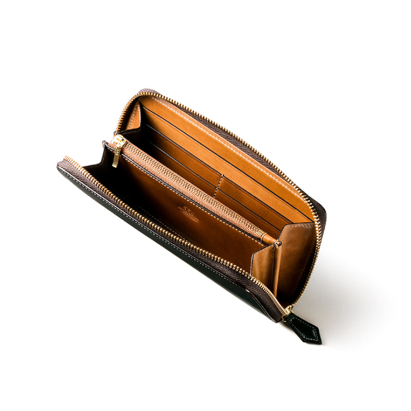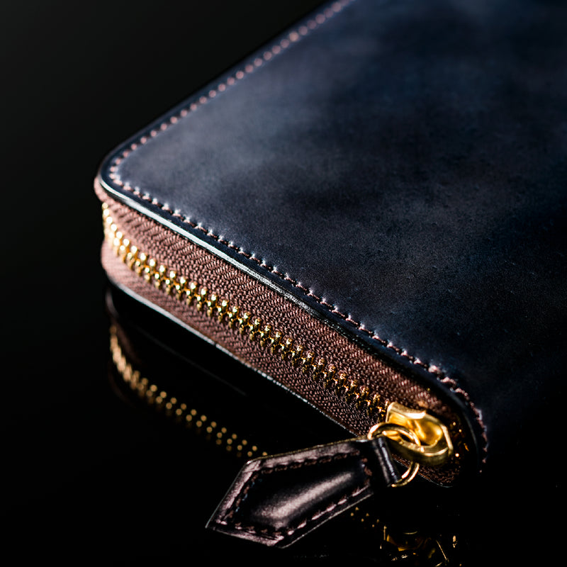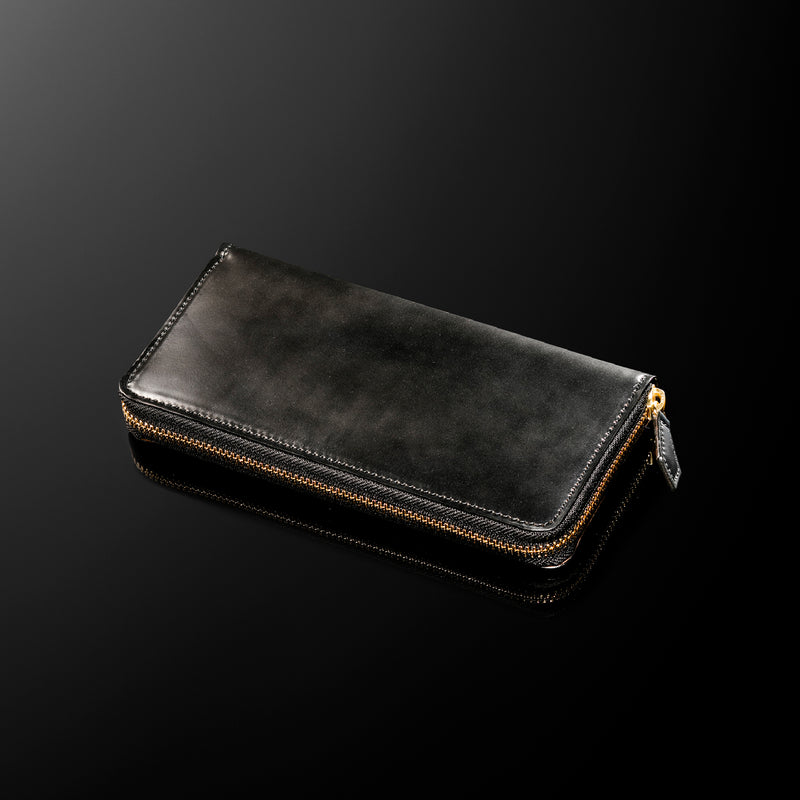 自然の風合いを極限まで残したシェルコードバンを使用したコレクションです。このシェルコードバンは米国産でホーウィン社というタンナーが製造した皮革。経年変化が魅力で、マットな風合いから艶やかで鈍い光沢を放つまで変化します。ラウンドジップ型の長財布は、重厚なデザインが魅力です。カード、お札、小銭を中に収納でき散らばらないので、鞄に入れて持ち運ぶのにも便利な形です。| 外寸 | 縦9.5cm×横19.2cm×厚み2cm |
