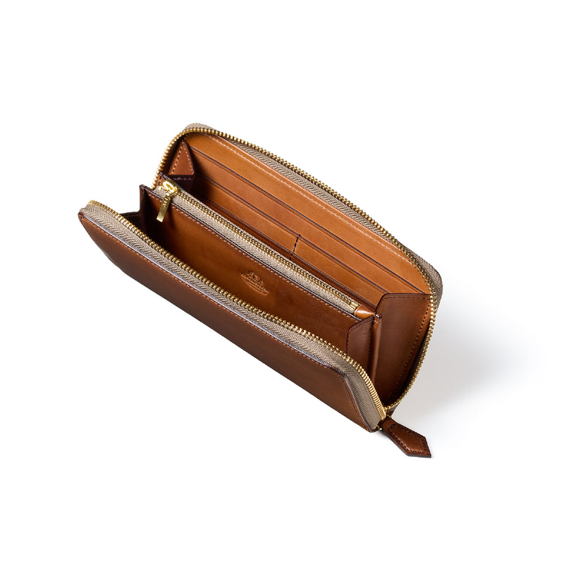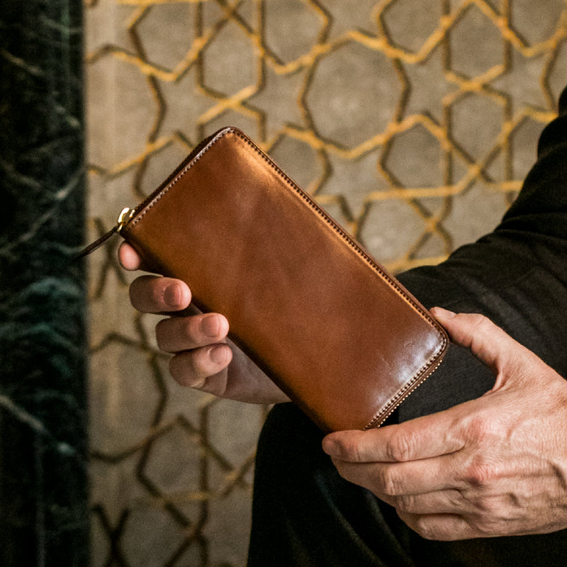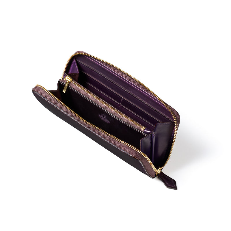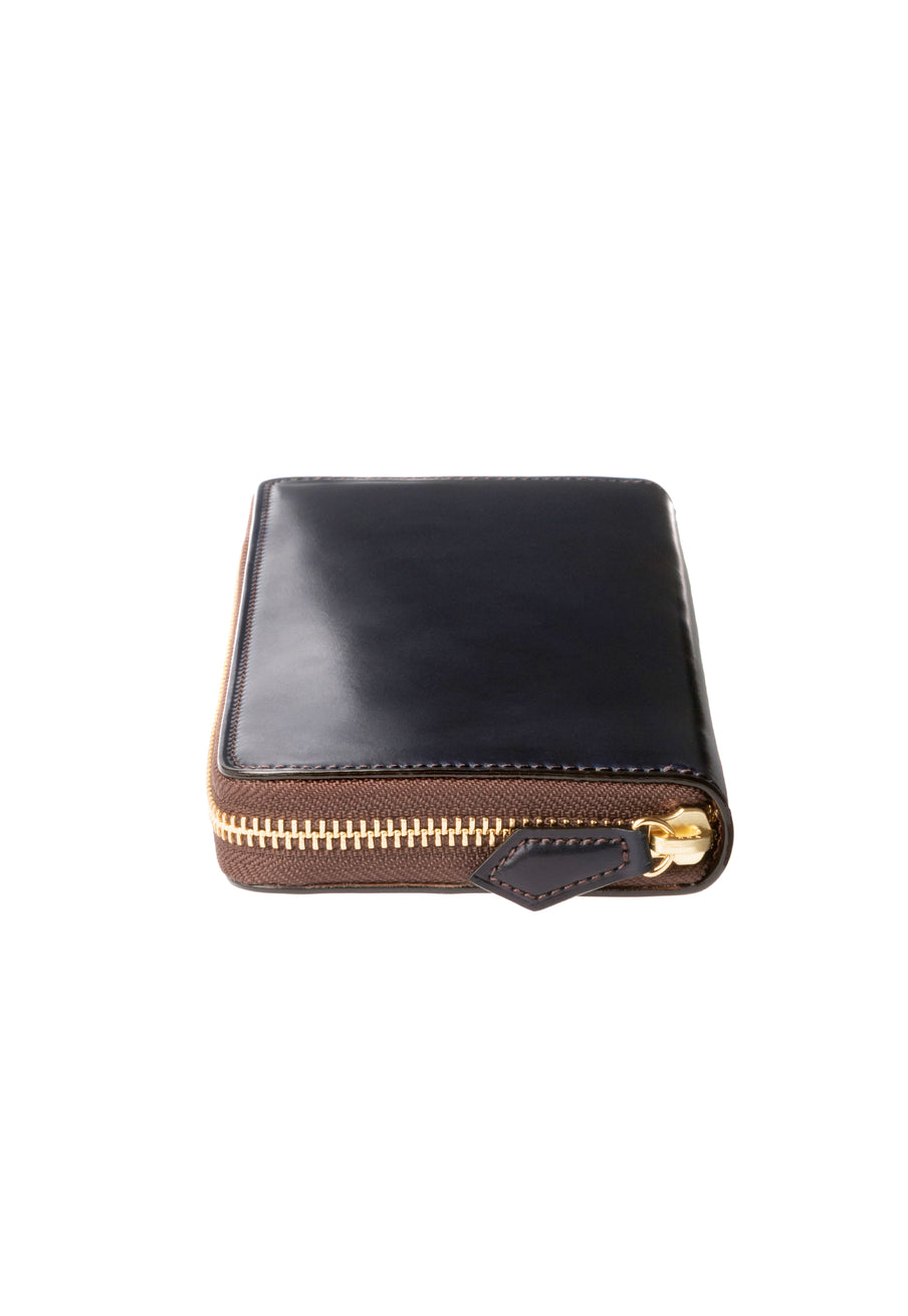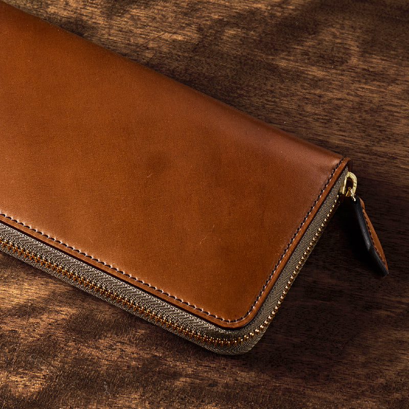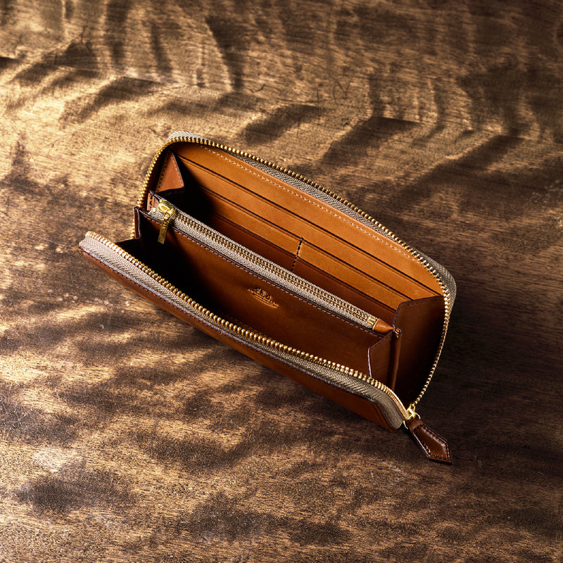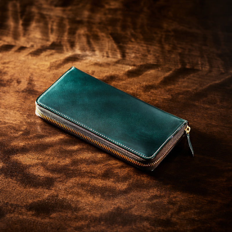 自然の風合いを極限まで残したシェルコードバンを使用したコレクションです。このシェルコードバンは米国産でホーウィン社というタンナーが製造した皮革。経年変化が魅力で、マットな風合いから艶やかで鈍い光沢を放つまで変化します。ラウンドジップ型の長財布は、重厚なデザインが魅力です。カード、お札、小銭を中に収納でき散らばらないので、鞄に入れて持ち運ぶのにも便利な形です。| 外寸 | 縦9.5cm×横19.2cm×厚み2cm |