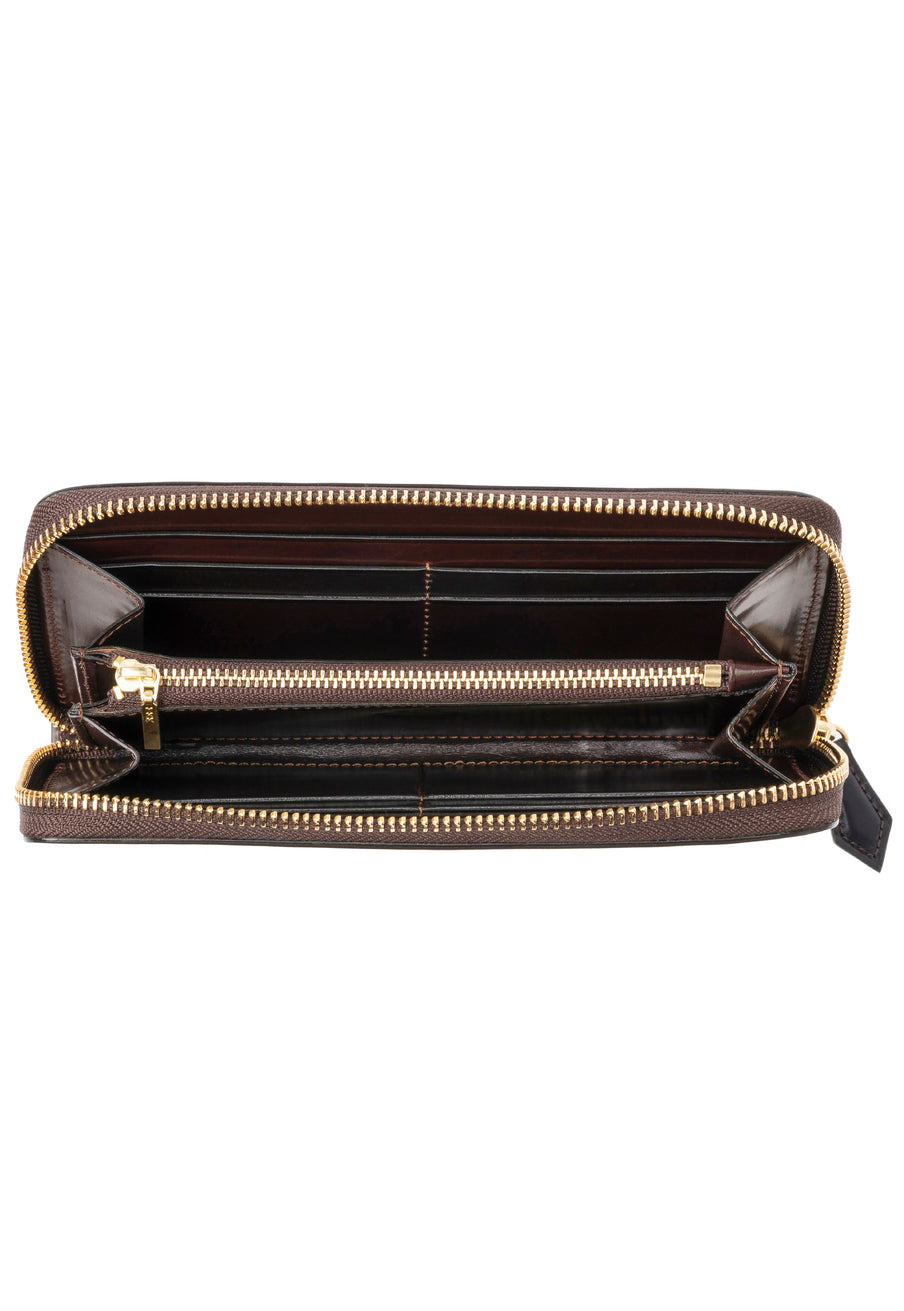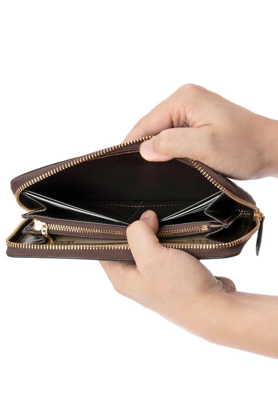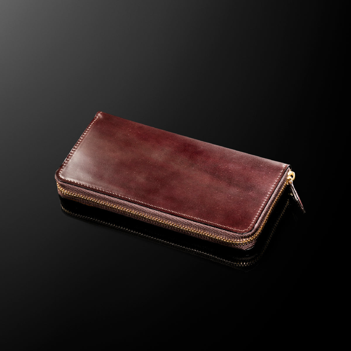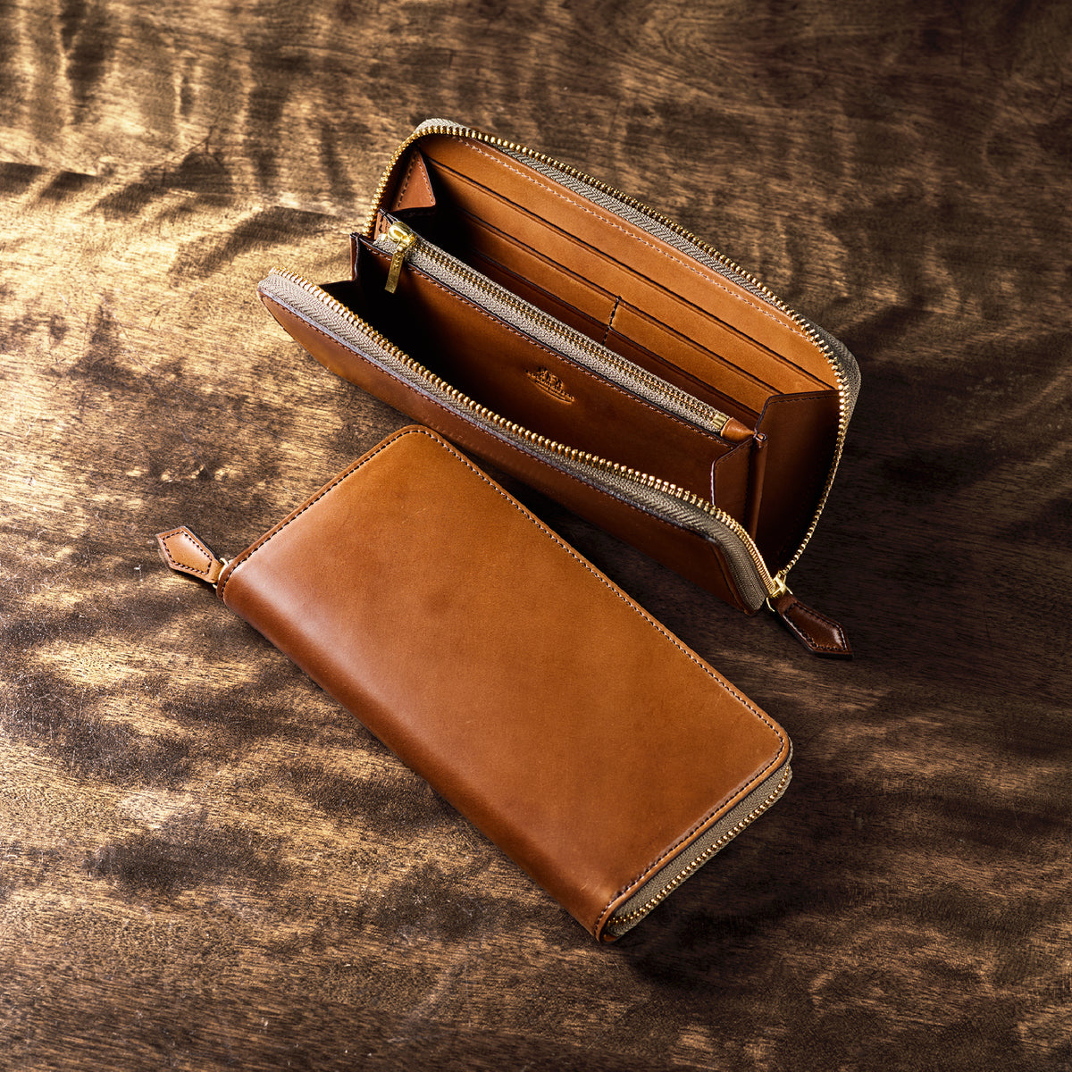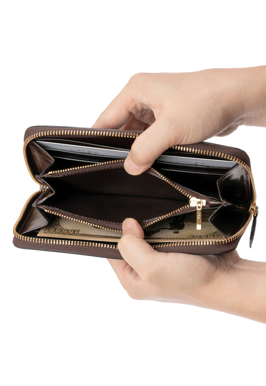 自然の風合いを極限まで残したシェルコードバンを使用したコレクションです。このシェルコードバンは米国産でホーウィン社というタンナーが製造した皮革。経年変化が魅力で、マットな風合いから艶やかで鈍い光沢を放つまで変化します。ラウンドジップ型の長財布は、重厚なデザインが魅力です。カード、お札、小銭を中に収納でき散らばらないので、鞄に入れて持ち運ぶのにも便利な形です。| 外寸 | 縦9.5cm×横19.2cm×厚み2cm |