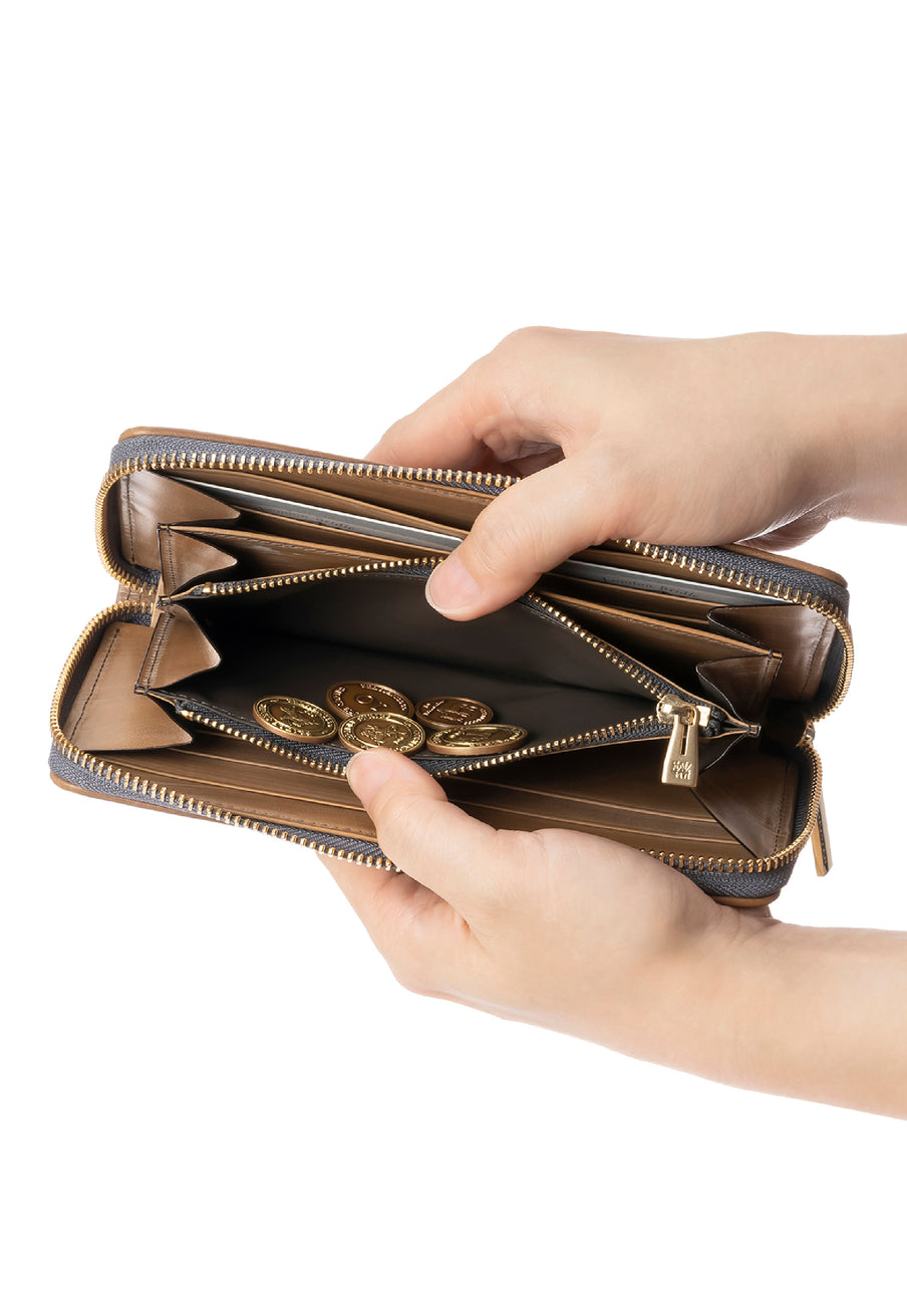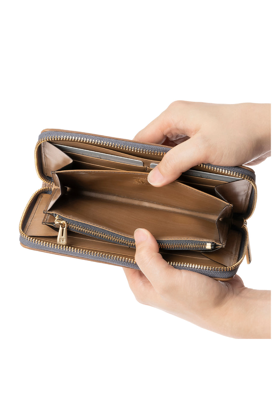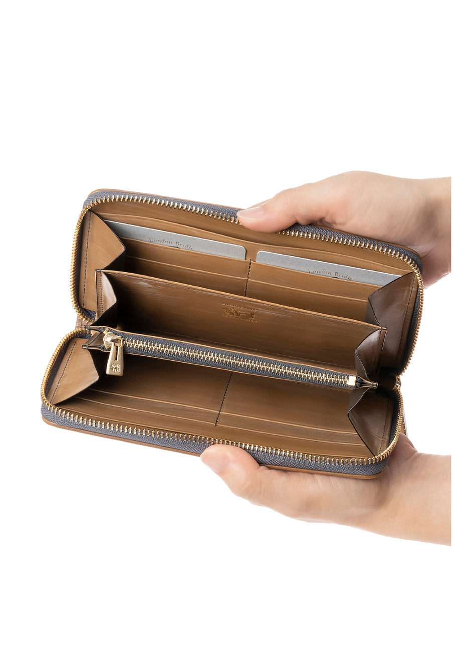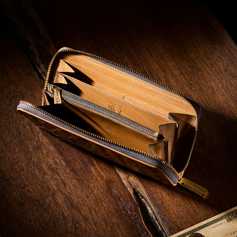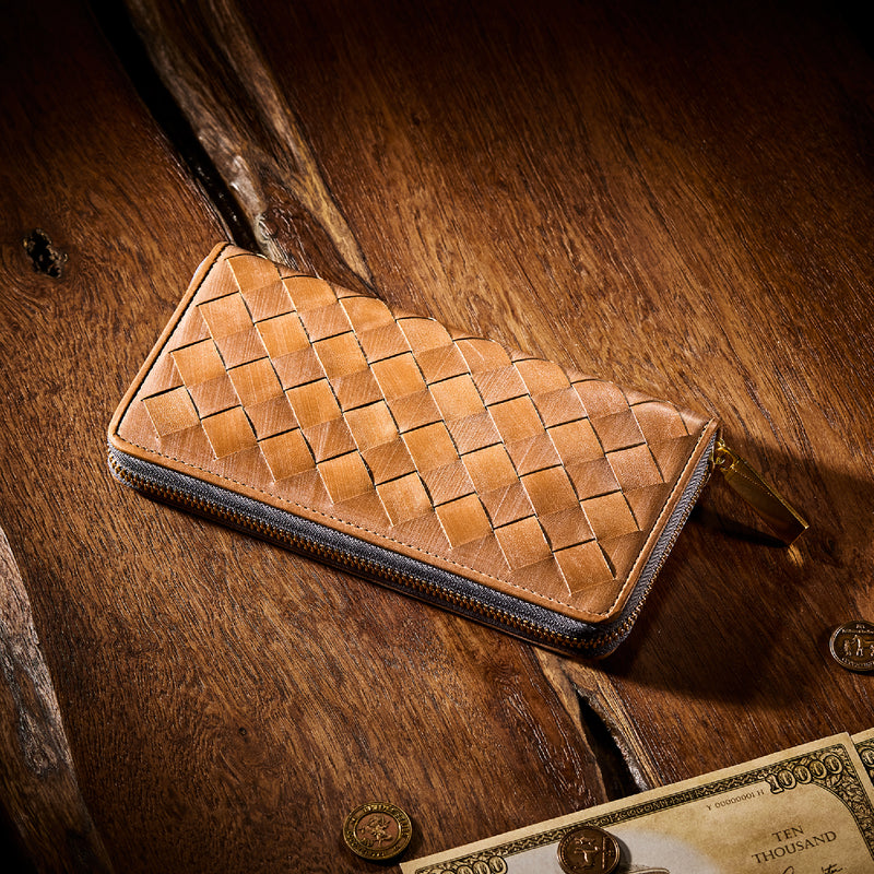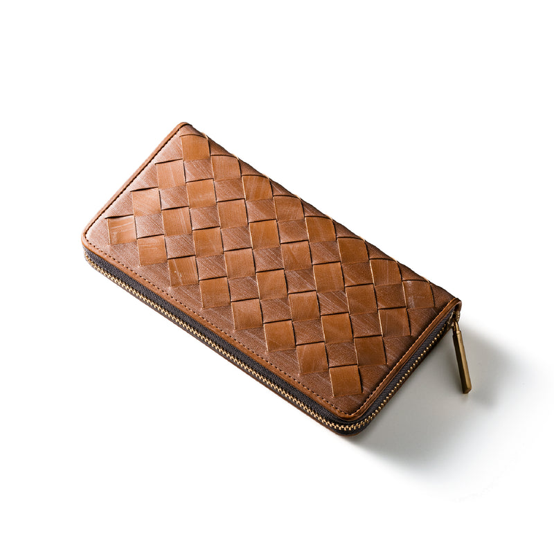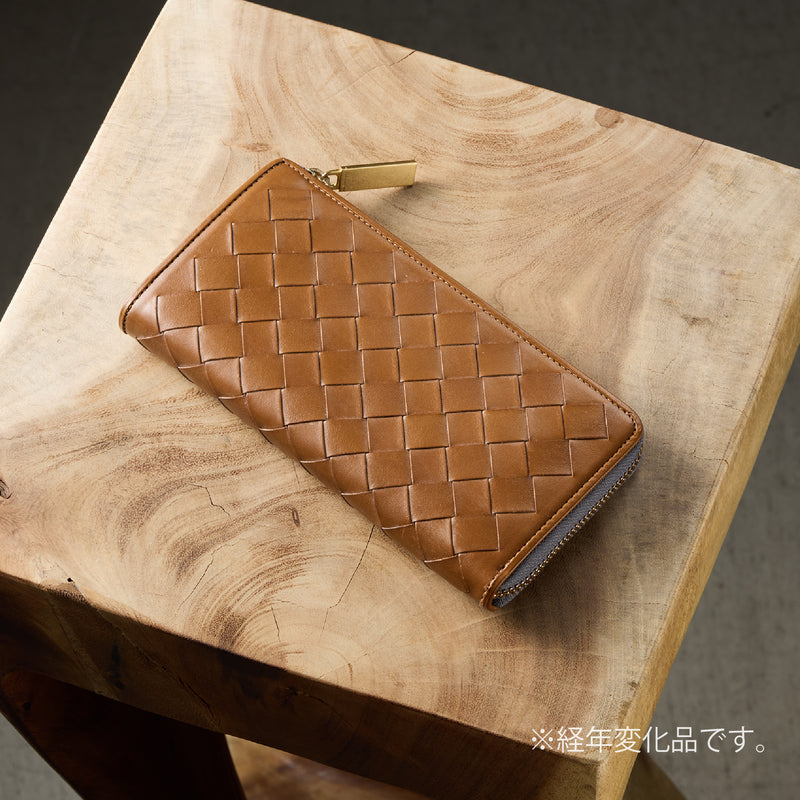 世界の海図をイメージしたオークバークレザーのイントレチャートです。日本の伝統工芸をベースとした技を使い、極太編み込みにデザイン、経年変化のグラデーションを楽しむことができます。ラウンドジップ型の長財布で、容量が大きめで使い勝手が良いのが特徴です。中身を落とす心配もなく、天然皮革の良さを楽しめるのがこの長財布の魅力です。| 外寸 | 縦10.1cm×横19.4cm×厚み2.6cm |