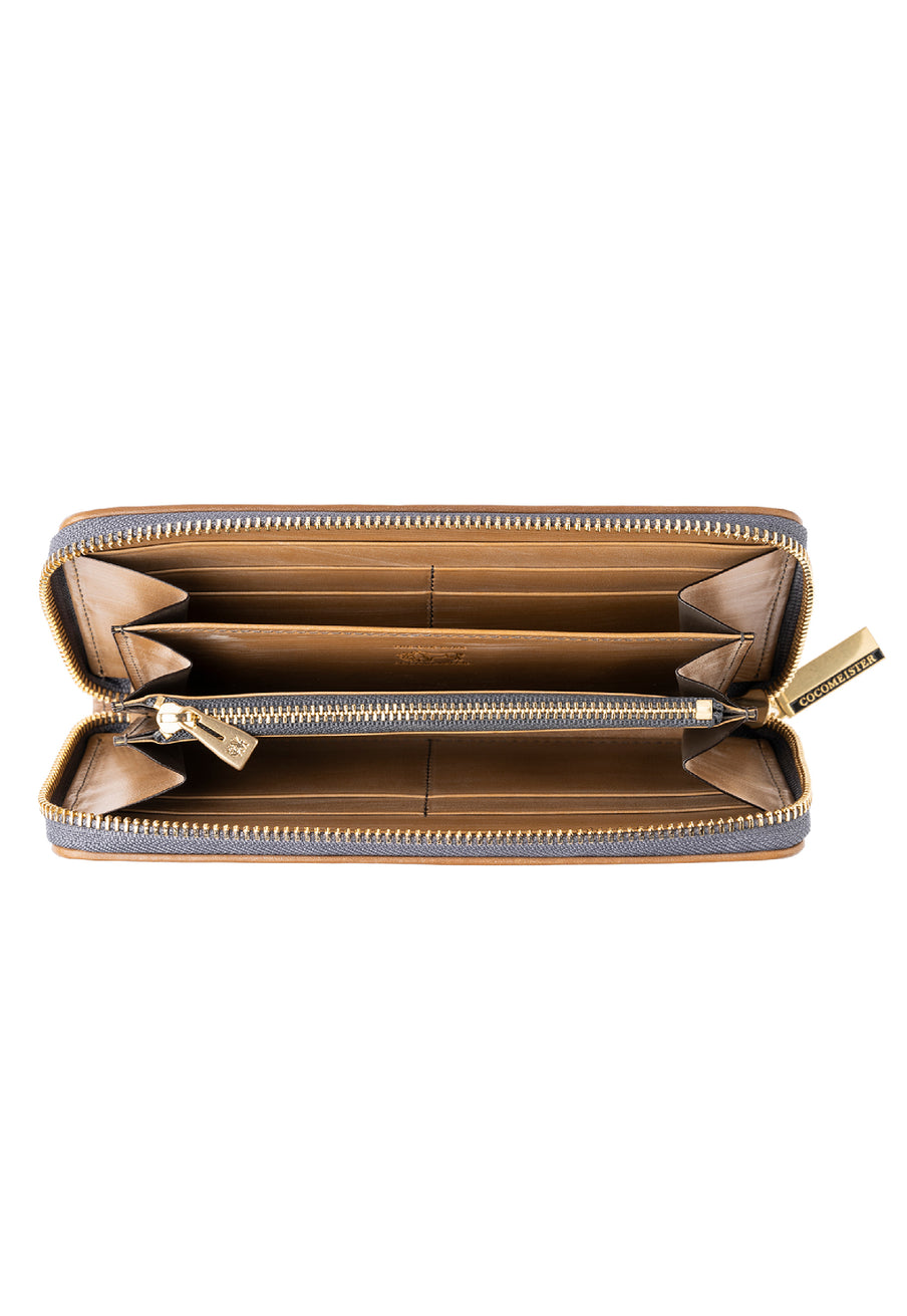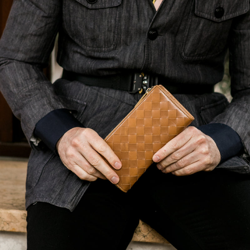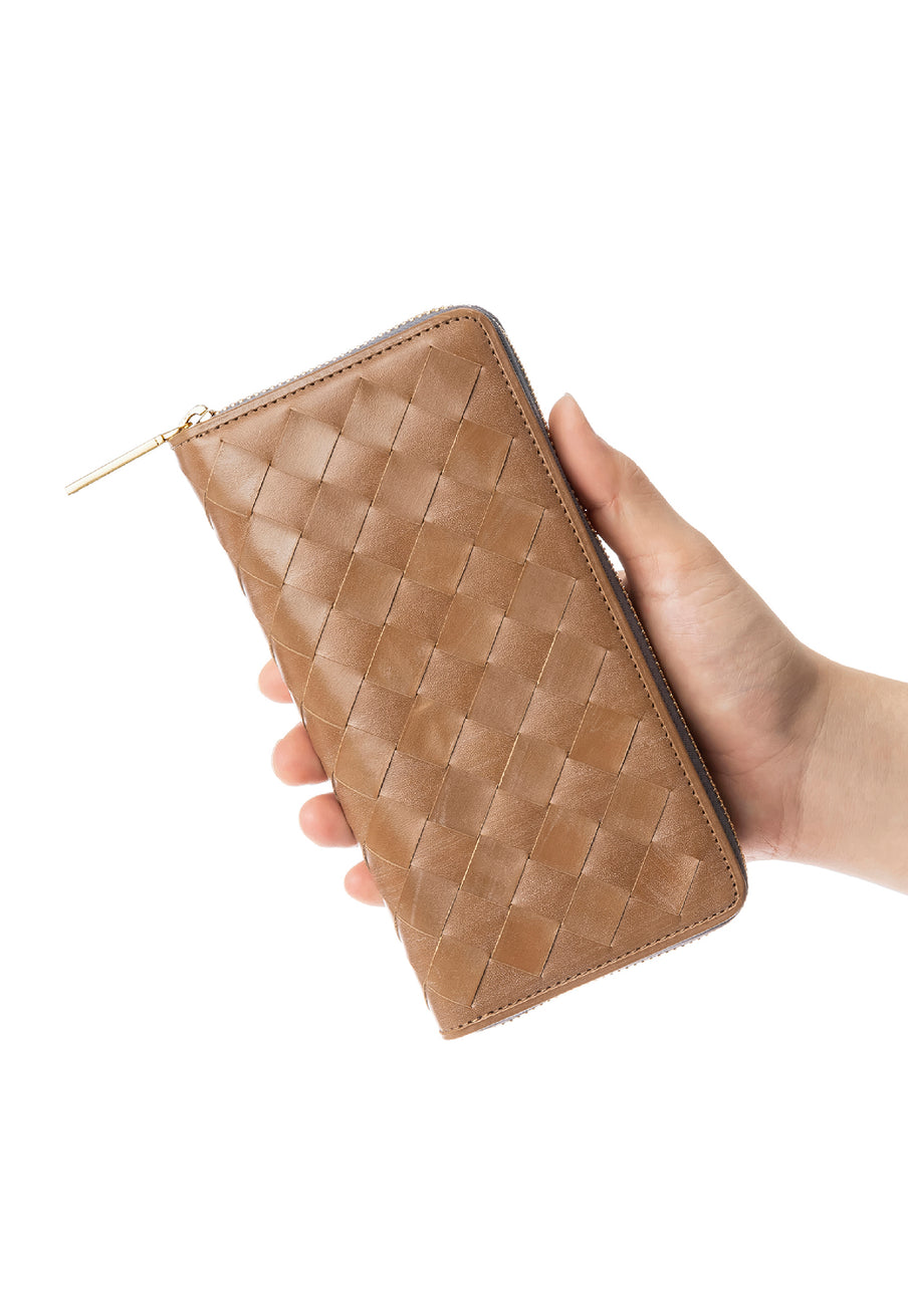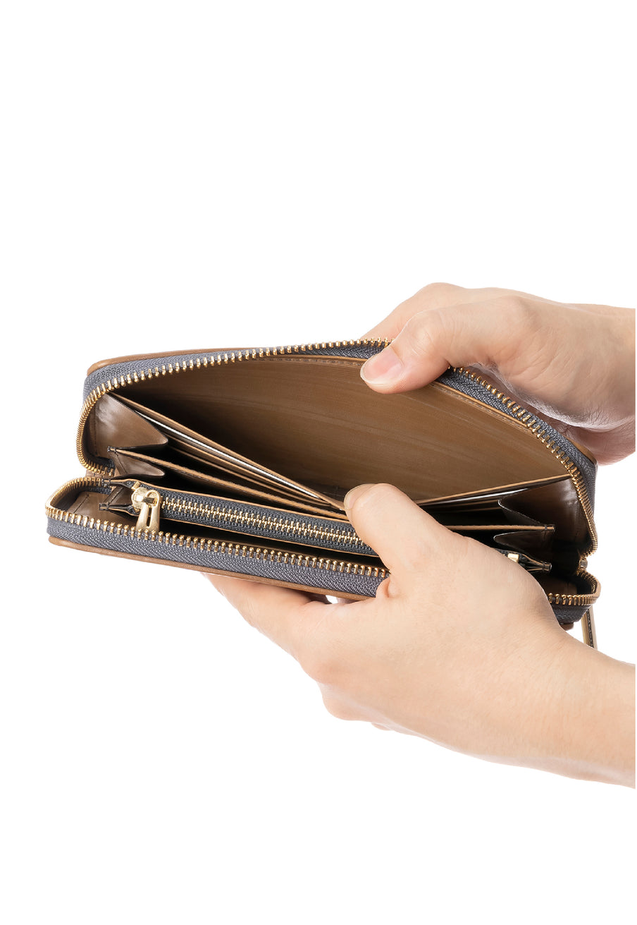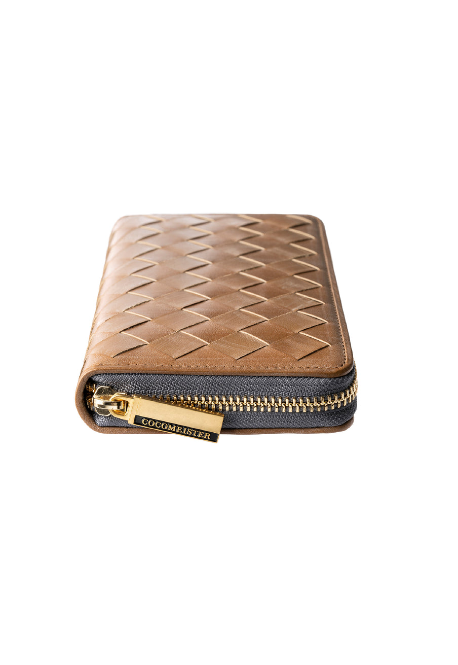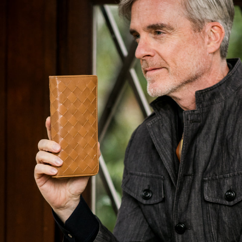 世界の海図をイメージしたオークバークレザーのイントレチャートです。日本の伝統工芸をベースとした技を使い、極太編み込みにデザイン、経年変化のグラデーションを楽しむことができます。ラウンドジップ型の長財布で、容量が大きめで使い勝手が良いのが特徴です。中身を落とす心配もなく、天然皮革の良さを楽しめるのがこの長財布の魅力です。| 外寸 | 縦10.1cm×横19.4cm×厚み2.6cm |