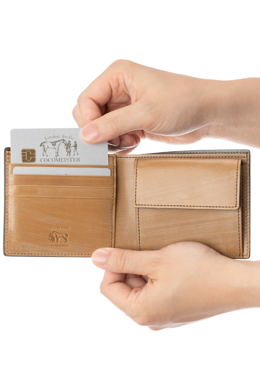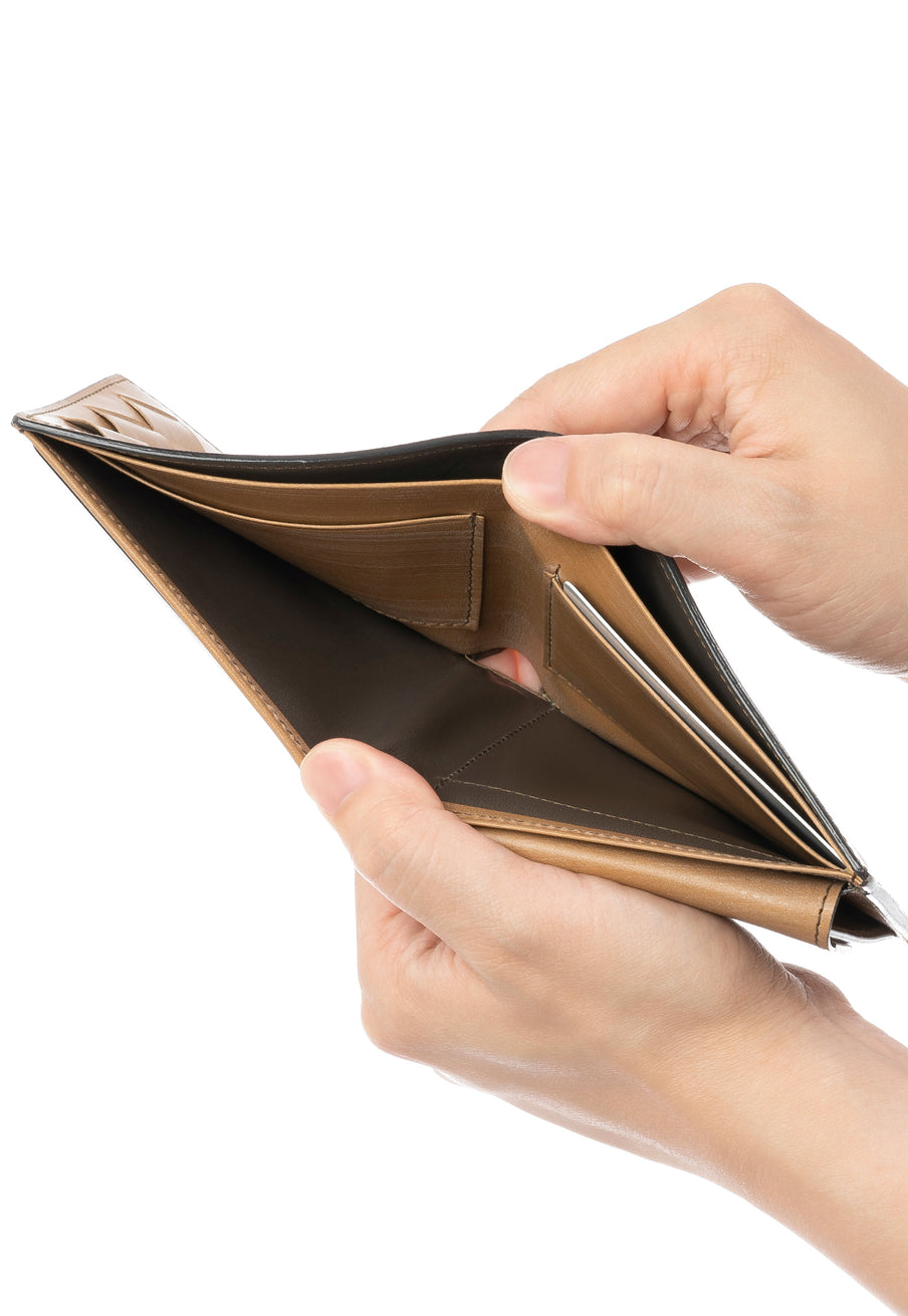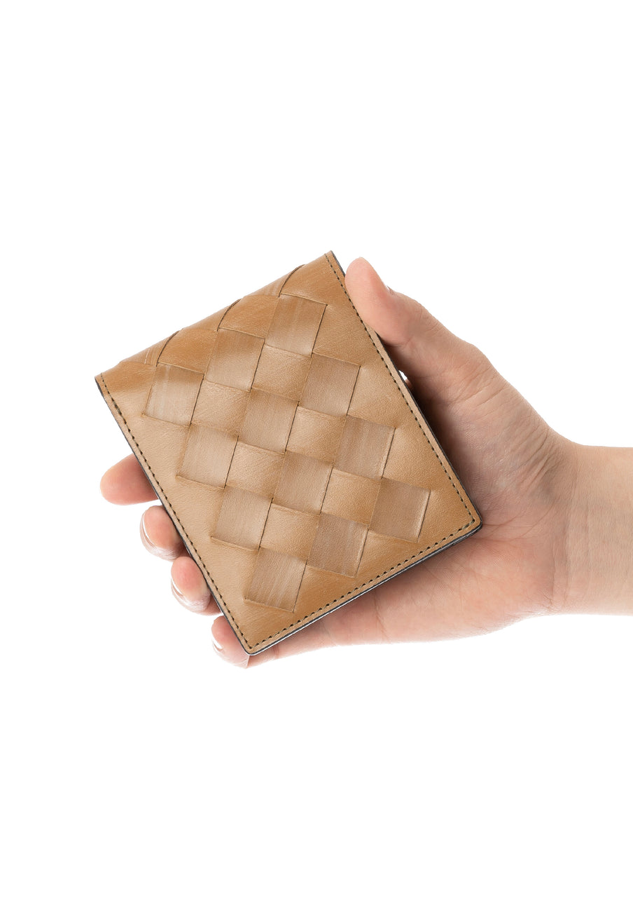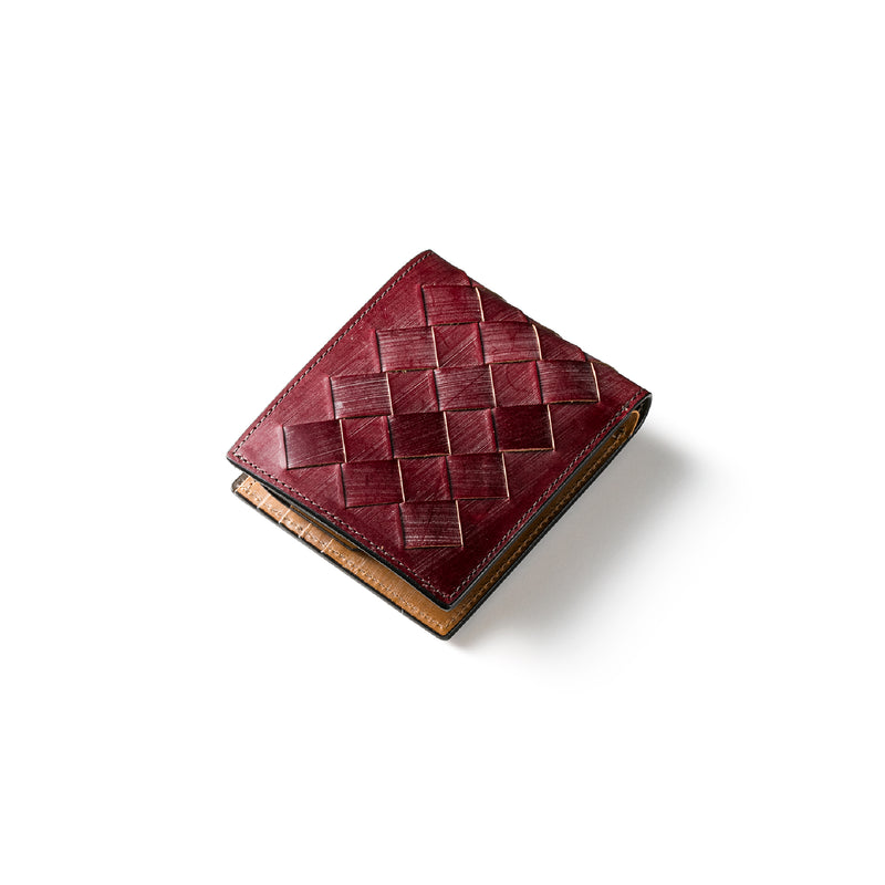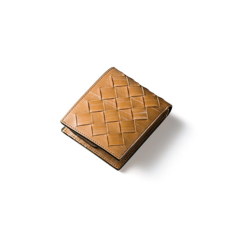 世界の海図をイメージしたオークバークレザーのイントレチャートです。日本の伝統工芸をベースとした技を使い、極太編み込みにデザイン、経年変化のグラデーションを楽しむことができます。2つ折り財布はコンパクトで使い勝手が良いバランスの取れた財布です。お札、小銭そしてカードを収納して、アクティブに動きやすい財布です。| 外寸 | 縦9.3cm×横10.8cm×厚み2.8cm |