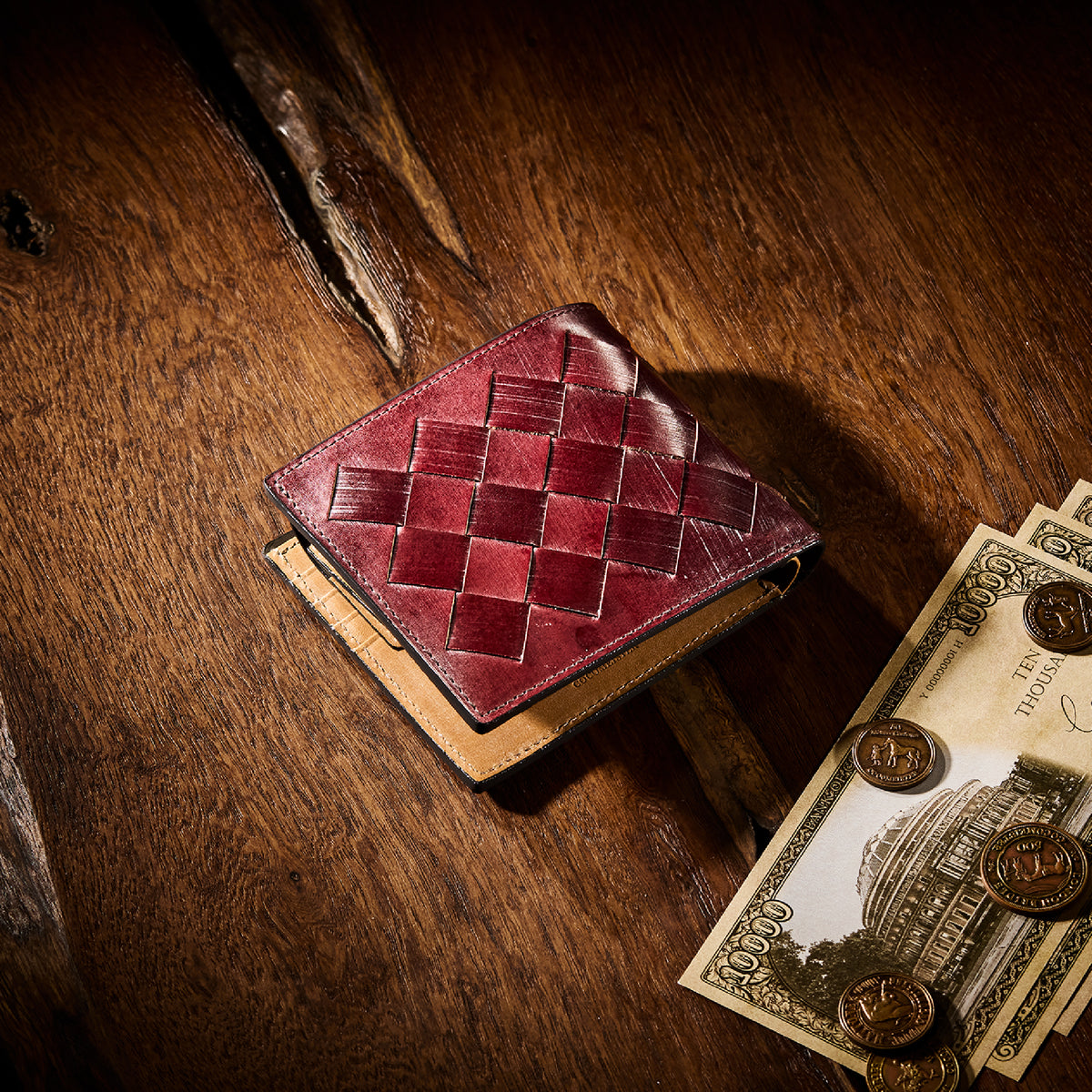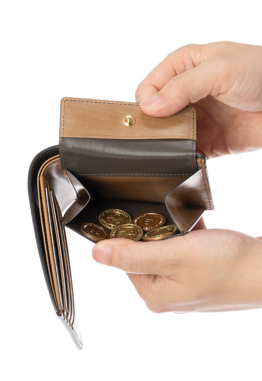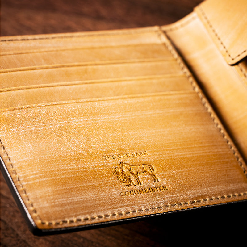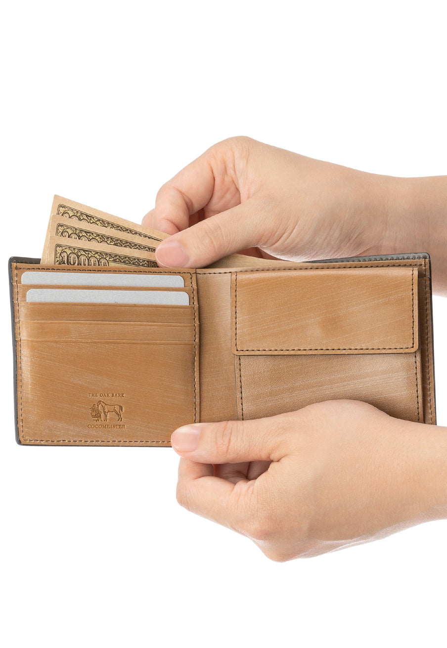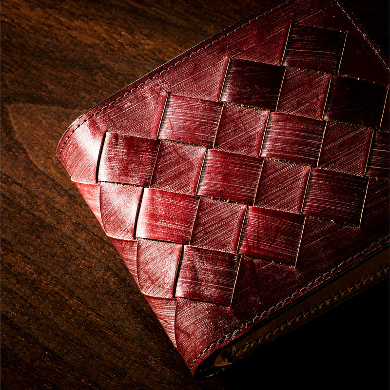 世界の海図をイメージしたオークバークレザーのイントレチャートです。日本の伝統工芸をベースとした技を使い、極太編み込みにデザイン、経年変化のグラデーションを楽しむことができます。2つ折り財布はコンパクトで使い勝手が良いバランスの取れた財布です。お札、小銭そしてカードを収納して、アクティブに動きやすい財布です。| 外寸 | 縦9.3cm×横10.8cm×厚み2.8cm |