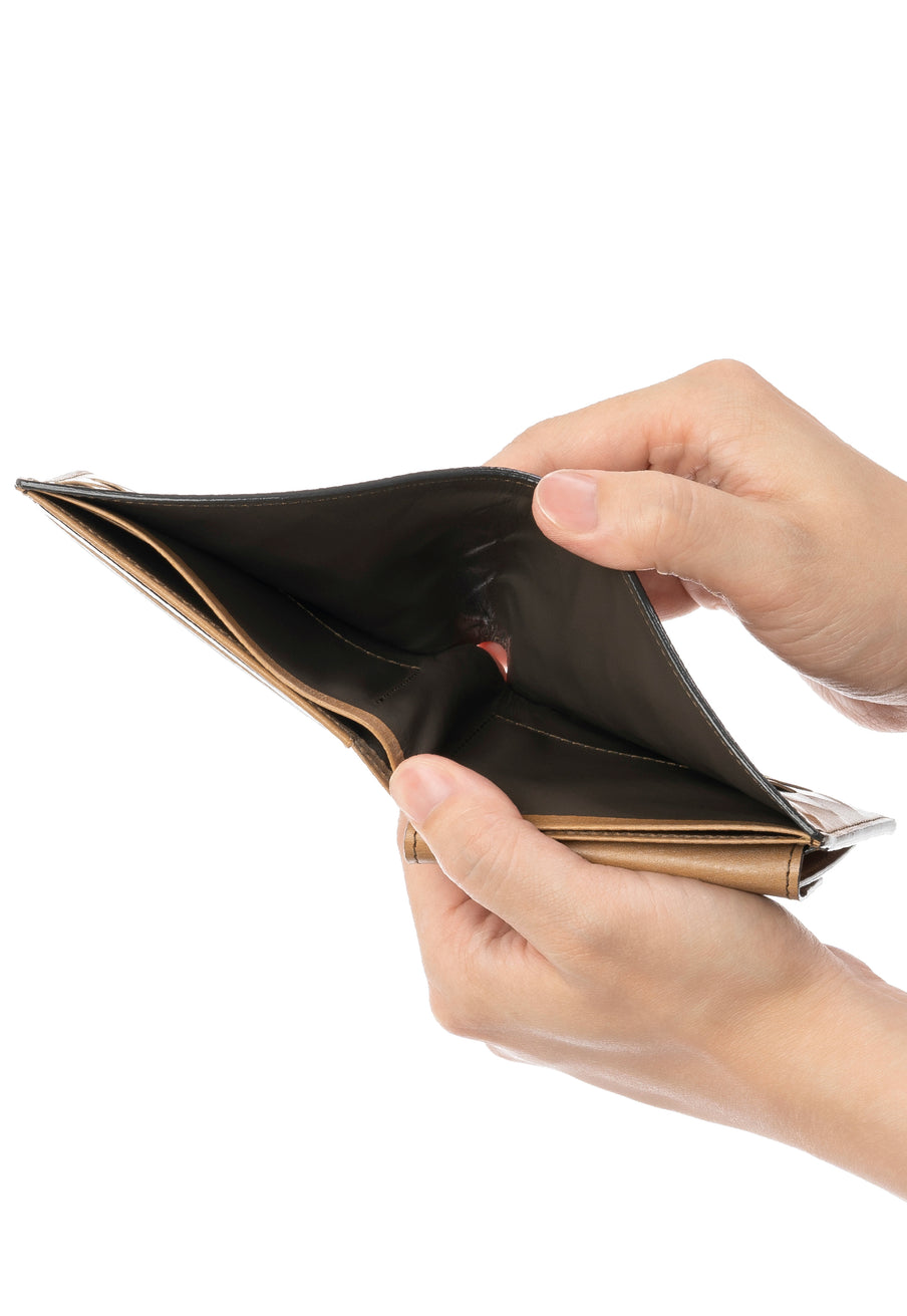 お札入れは2箇所に分かれており、1万円札や千円札で場所を分けたり、領収書専用の場所として区分けしてご利用いただくのも便利です。お札入れの中にカード入れも装備。