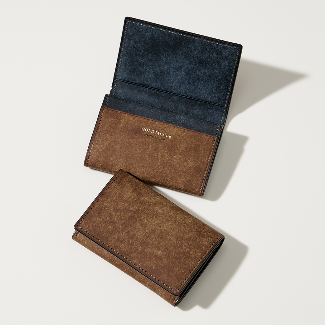 表面の起毛加工が特徴の最高級『プエブロ』レザーのエイジングを楽しむ、革を折りたたむ名刺入れ。