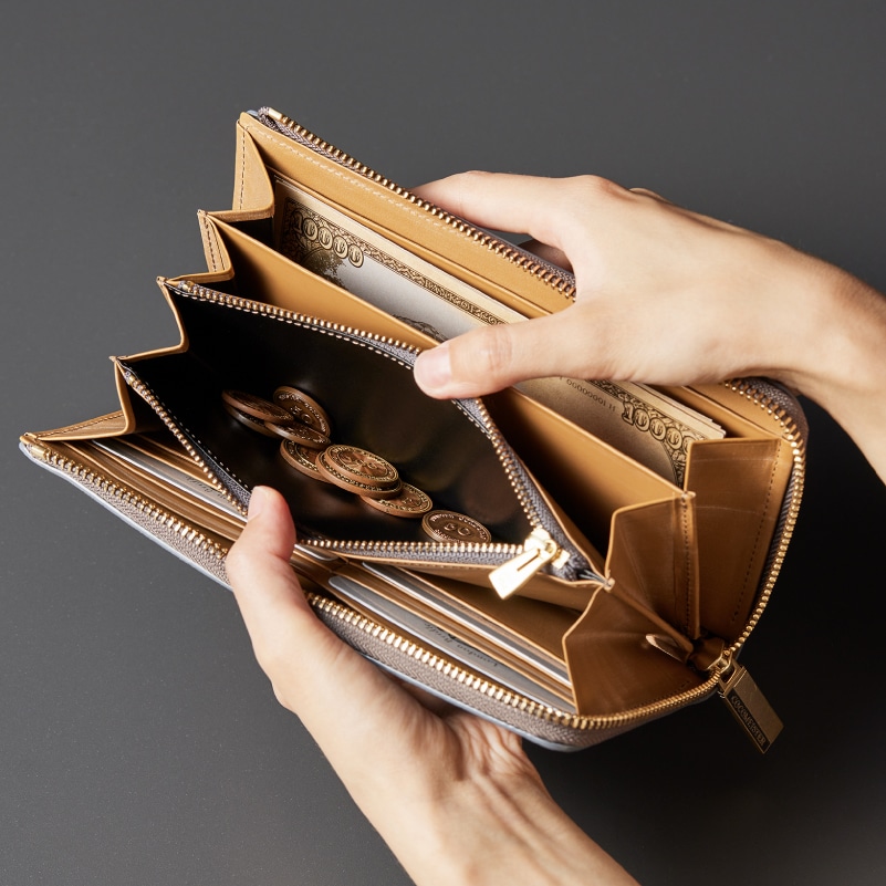 紳士物の熟練職人が丁寧に仕立てたL字型ラウンド長財布。多くの貴重品を収納できる、収納力が魅力。素材とつくりの良さを実感出来る。