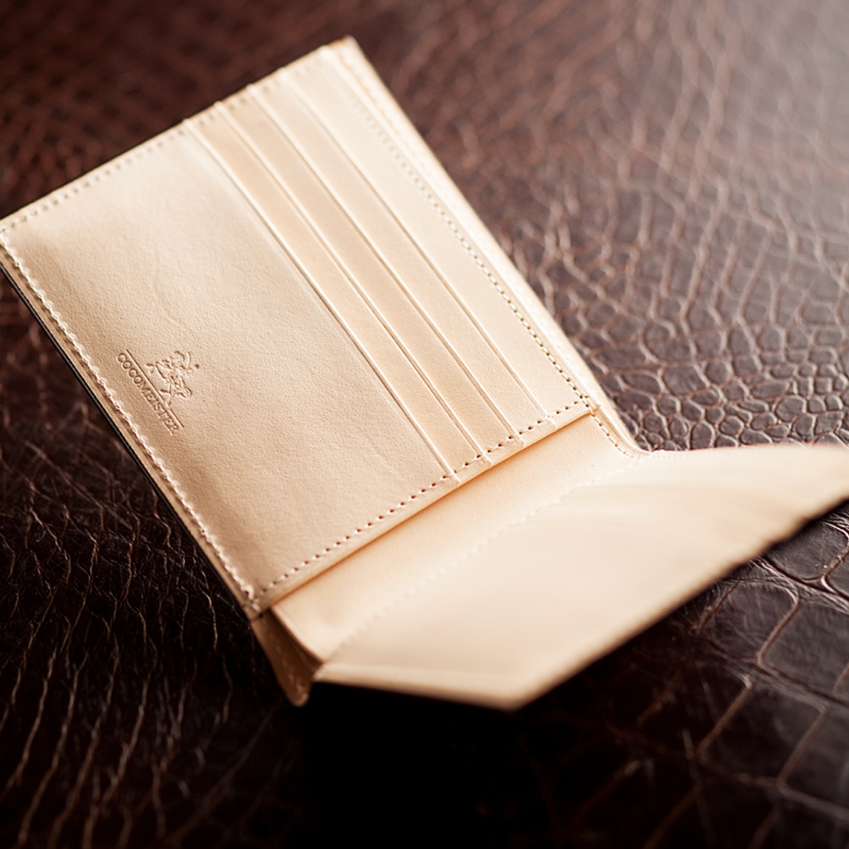 英国馬具革ブライドルレザーを外装に使用し、内装のヌメ革とのコントラストがお洒落です。外装は重厚に作り上げ、内装ヌメ革は薄く重ねることで、重厚クラシカルなフォルムを作り上げました。