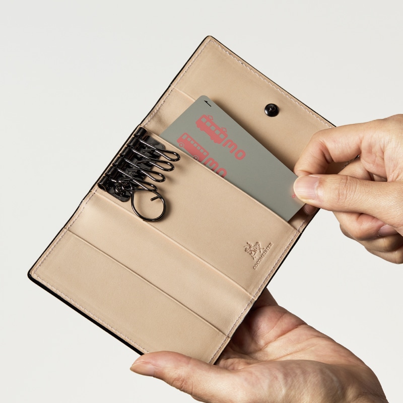 背面にはクレジットカードや電子マネーなどのカード類を収納できるのもグランドキーケースの魅力。しっかりした収納力で、日常で便利に活躍します。