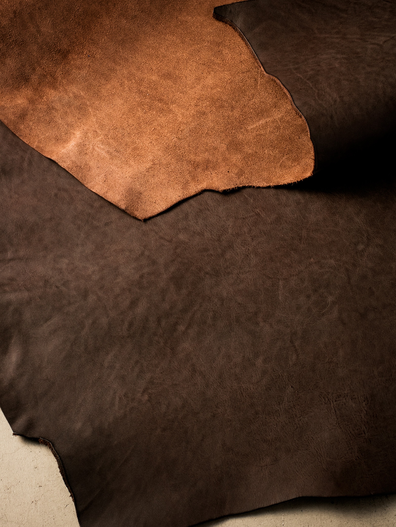滑らかな質感に、柔らかい革、それでいてシッカリとした繊維が財布から鞄まで幅広く、上品な存在感を放ちます。マットでスモーキーな風合いですが、経年変化では鏡面の様な艶感が増し、色は3トーン程深くなります。