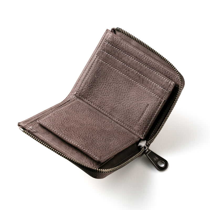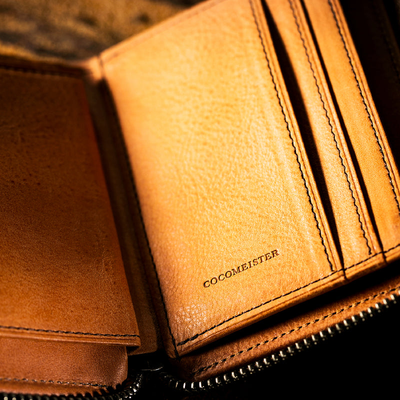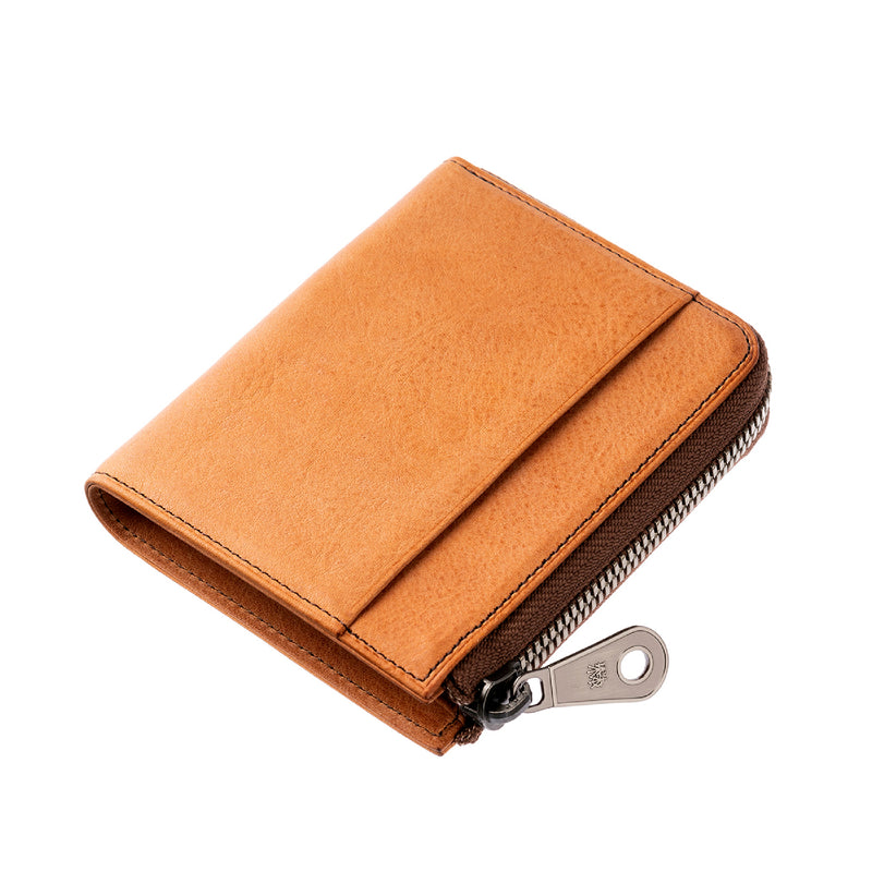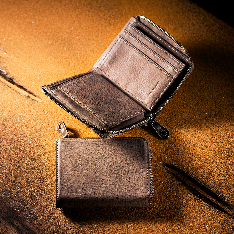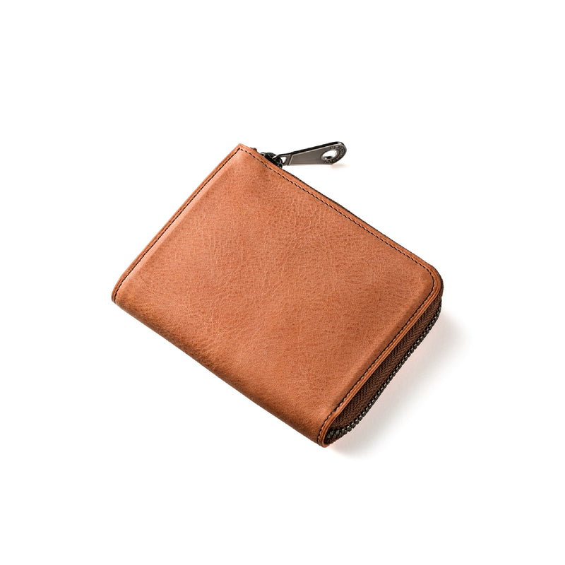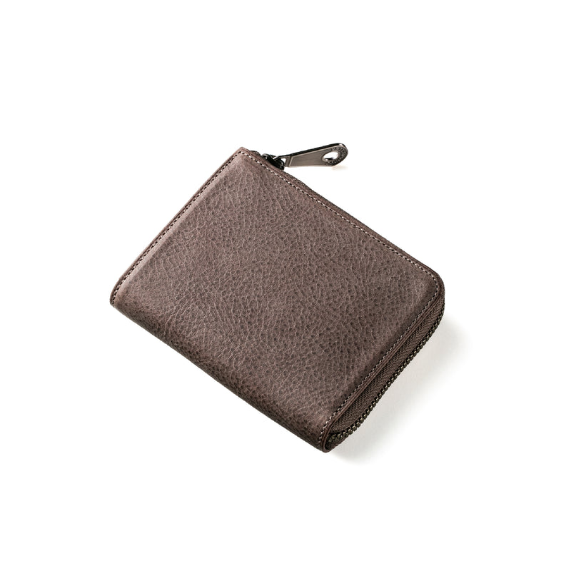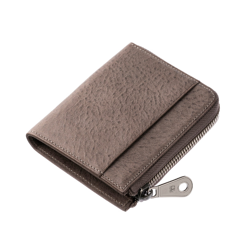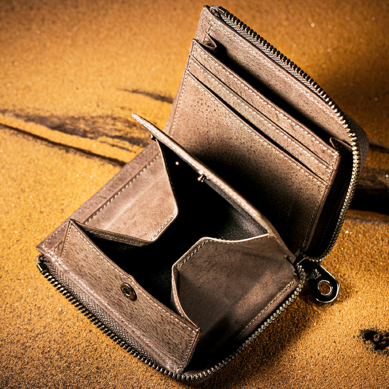 サハラ砂漠からインスピレーションしたカルドミラージュコレクション。イタリア産のバケッタレザーを使用したワイルドな風合いが魅力的、スモーキーなスタイルです。コンパクトなサイズで、お札とカード、そして小銭を収納する事ができるコンパクト財布です。革を楽しみながらコンパクトに楽しめるが魅力の財布です。| 外寸 | 縦8.6cm×横11.1cm×厚み2.1cm |