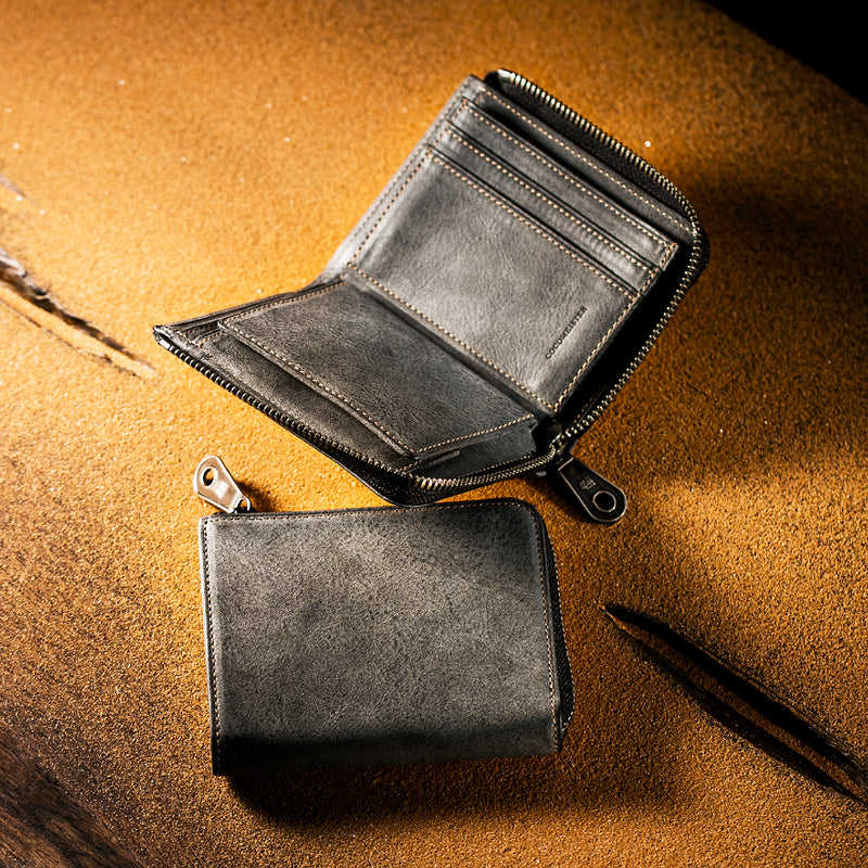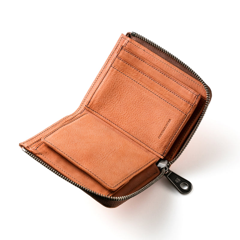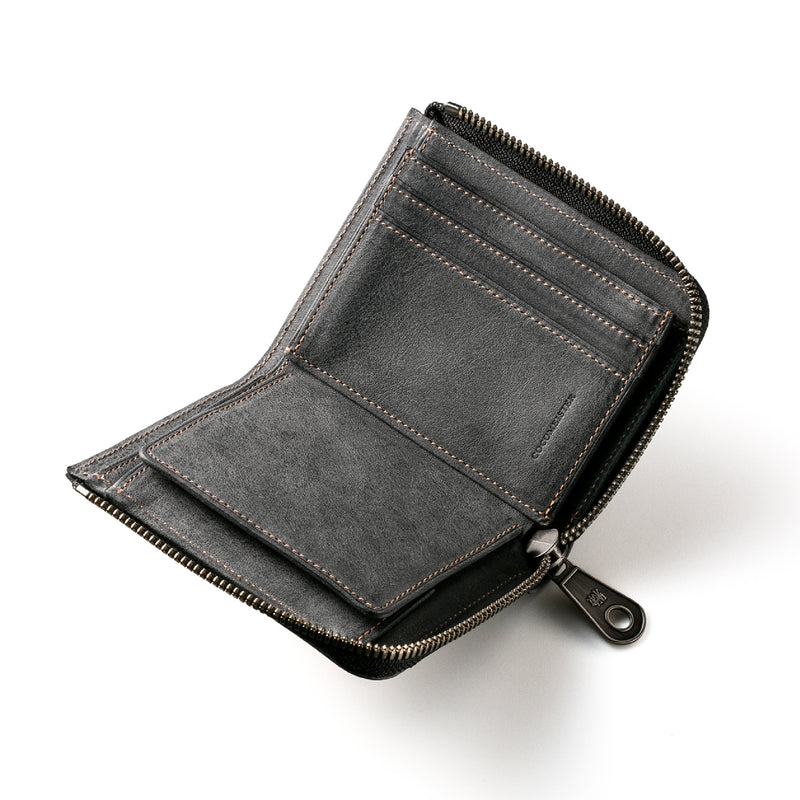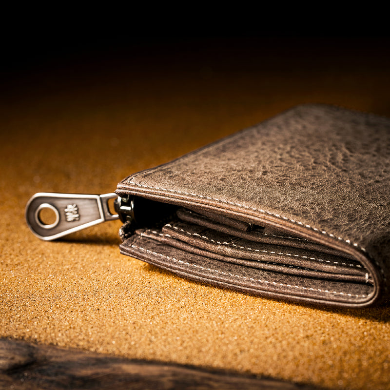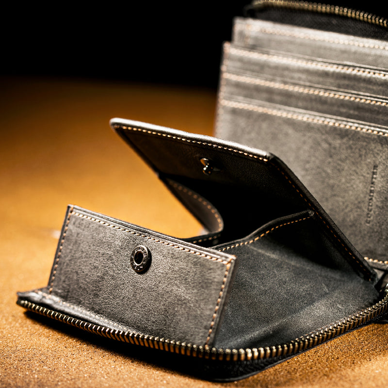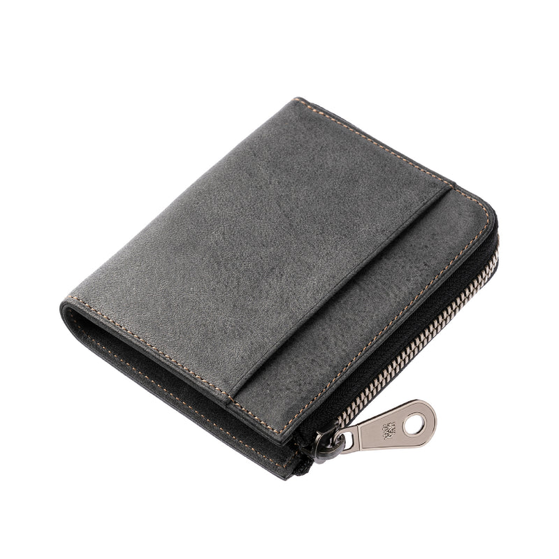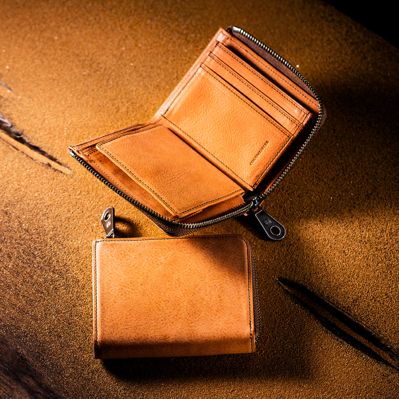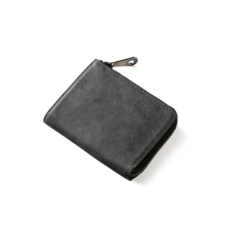 サハラ砂漠からインスピレーションしたカルドミラージュコレクション。イタリア産のバケッタレザーを使用したワイルドな風合いが魅力的、スモーキーなスタイルです。コンパクトなサイズで、お札とカード、そして小銭を収納する事ができるコンパクト財布です。革を楽しみながらコンパクトに楽しめるが魅力の財布です。| 外寸 | 縦8.6cm×横11.1cm×厚み2.1cm |