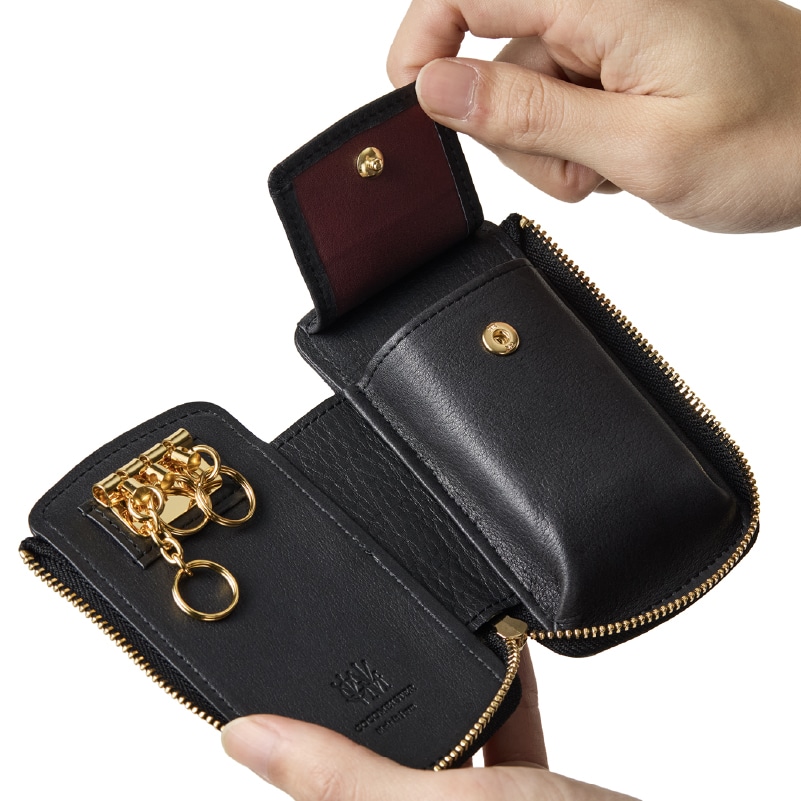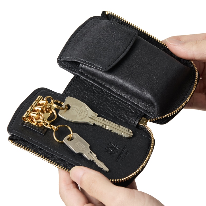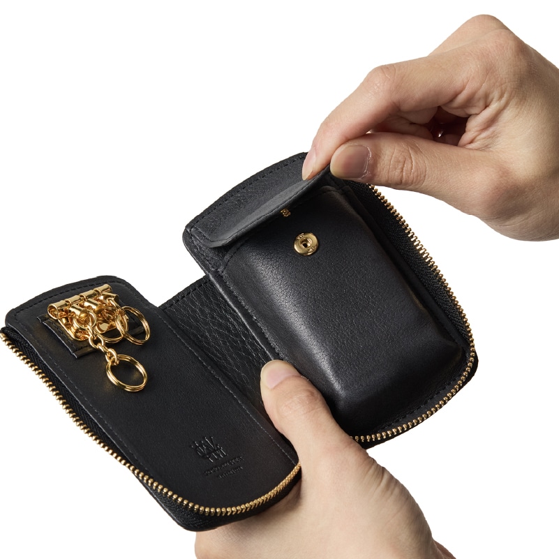 Detail 03 Detail 03ゆとりのある設計で、大きめのスマートキーも収納可能。ボタン付きポケットがしっかりとホールドし、鍵の落下を防ぎながらスマートに持ち運べる。機能性とデザイン性を両立したキーケース。