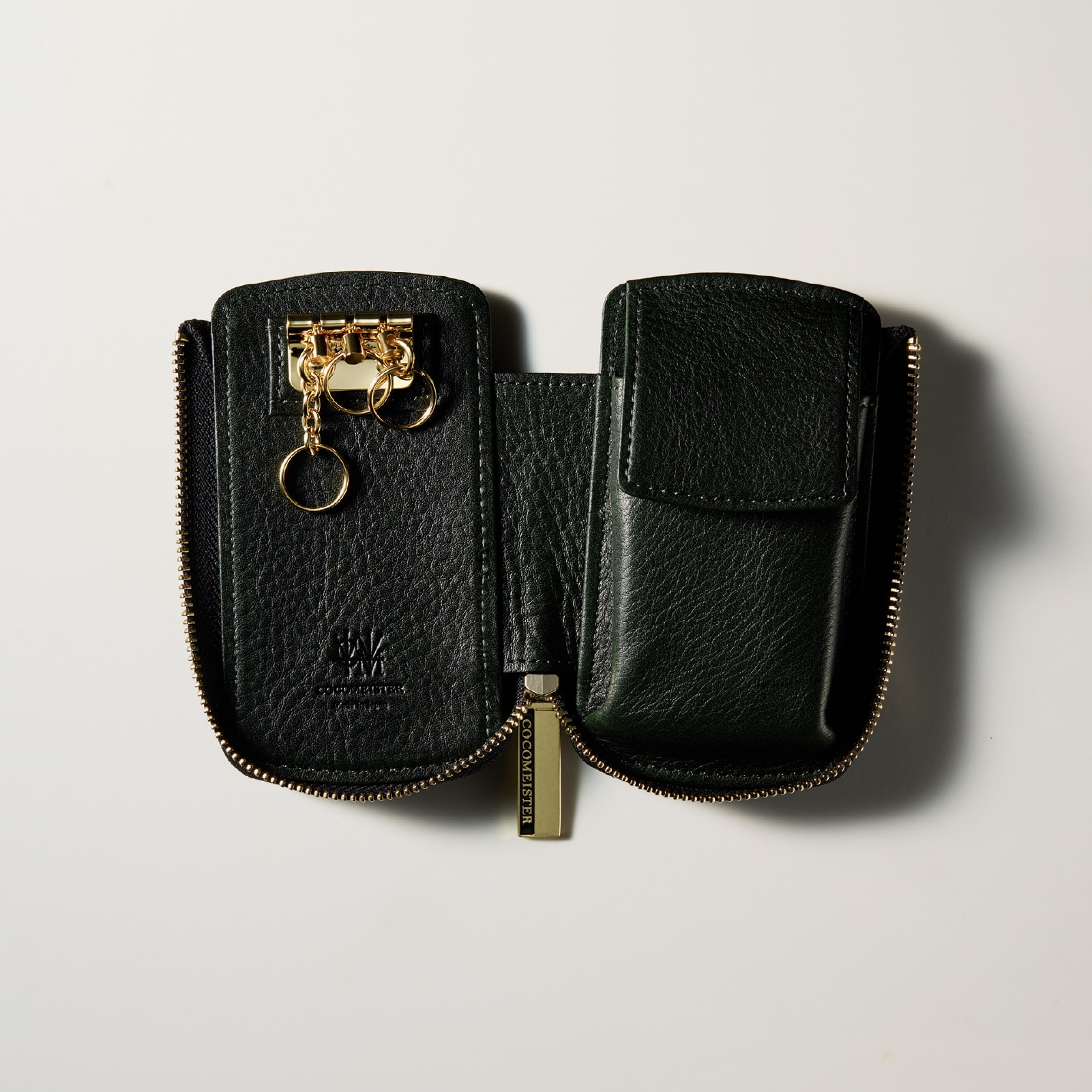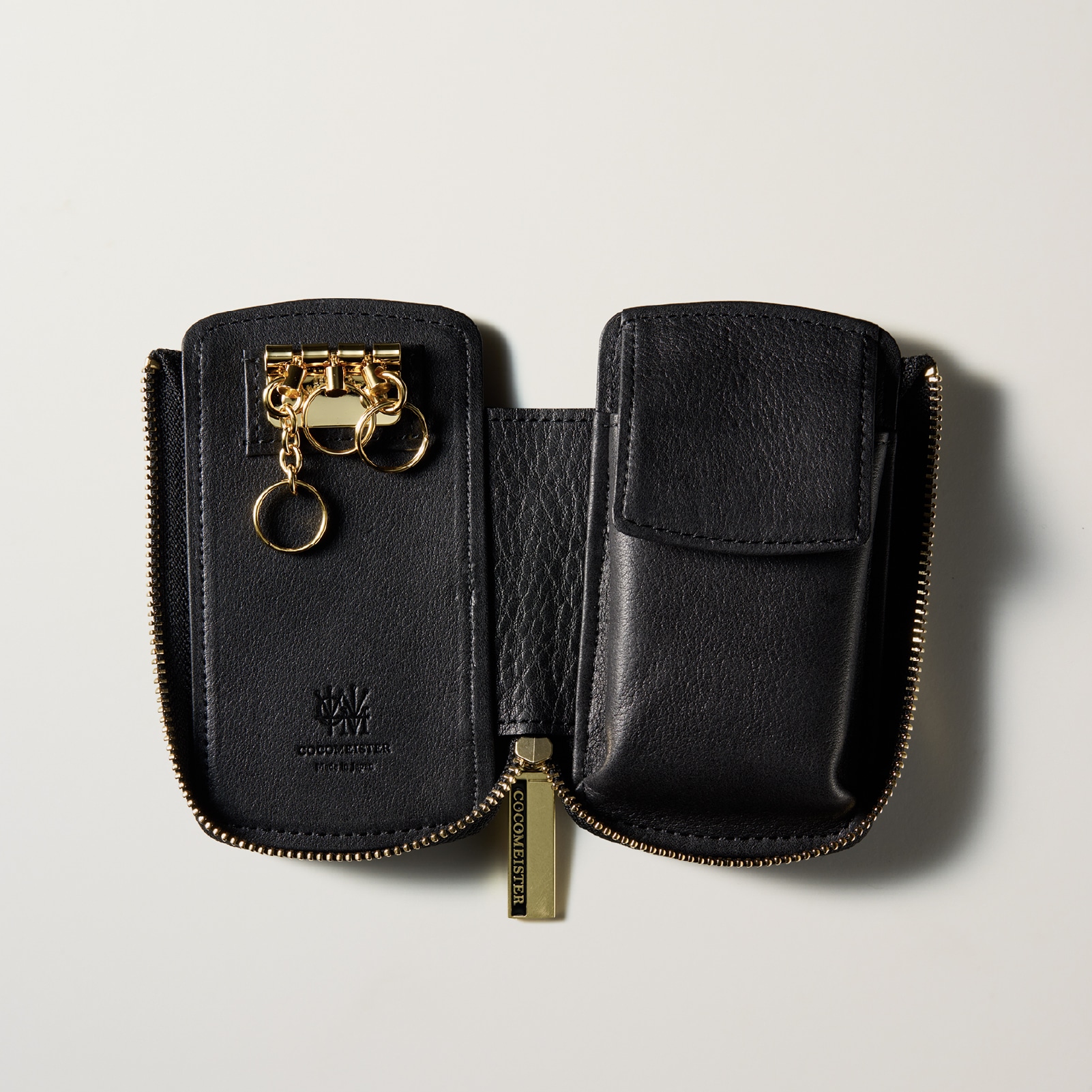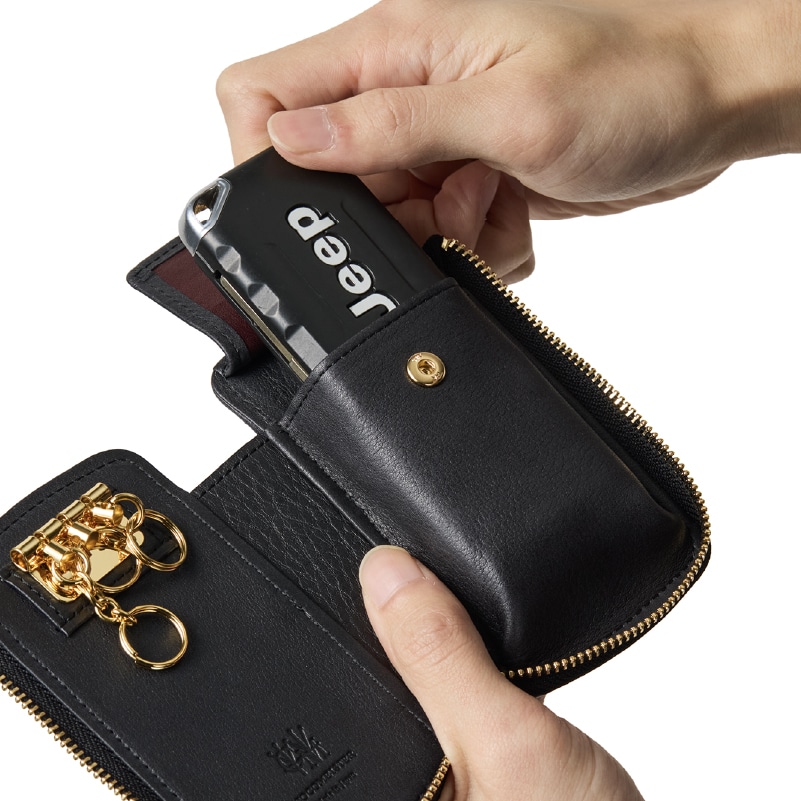 Detail 02 Detail 02大切な鍵をしっかりホールドする、ボタンで固定する安心設計。スマートキー専用ポケット付きで、紛失を防ぎながらコンパクトに持ち運べる。上質なレザーとゴールドの金具が、高級感を引き立てる。