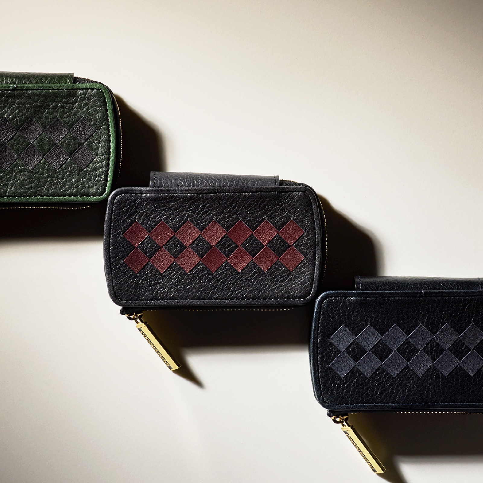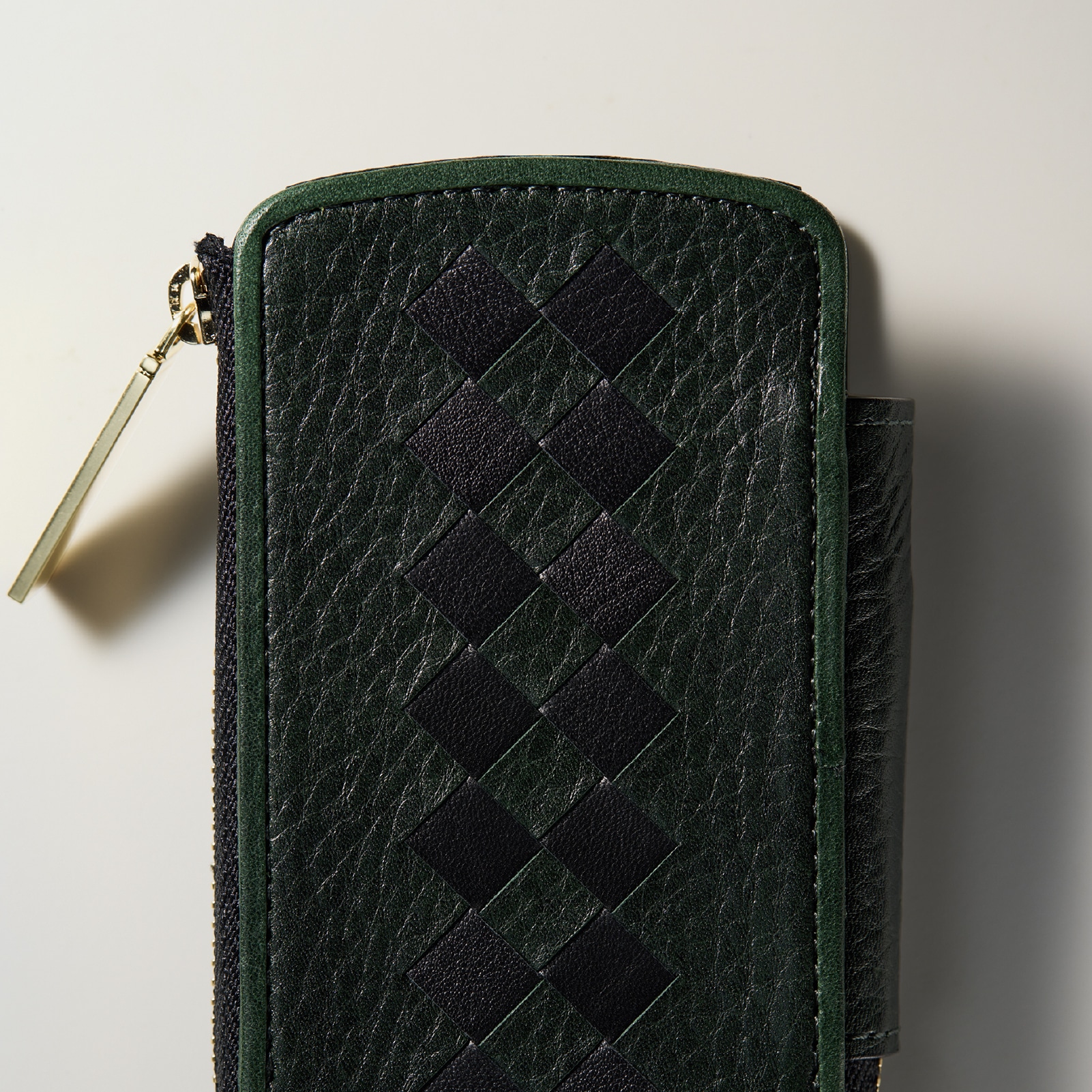 ディープグリーンのボディにブラック色の編み込みで引き締めました。グリーンを楽しみながらも、アクセントでブラックを使用し、大人の重厚感を演出しました。