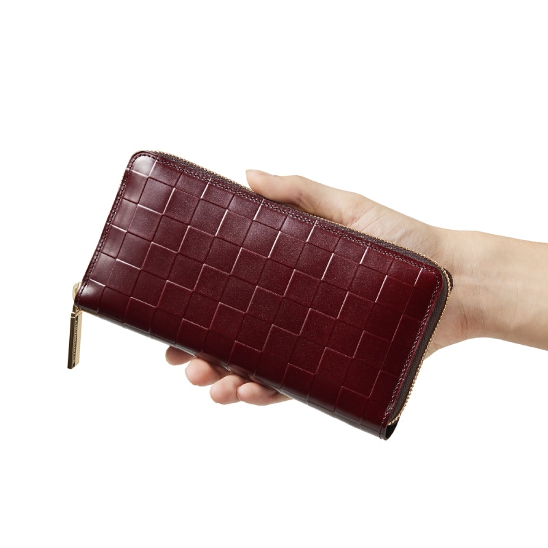 最高級の日本製オイルコードバンに、チェス盤模様をプレスオン加工を施した、遊び心満載のコレクション。内装にはイタリア千年伝統のマットーネレザーを使用し、遊び心がありながら、本格派の仕立てが魅力です。大きめのラウンドジップ型の長財布で3部屋構造になっています、通常のラウンドジップ財布と比べるとサイズが少し大きく、仕分けスペースもあり、使い勝手が良いのが魅力です。