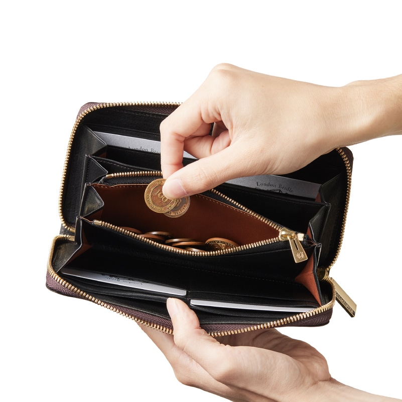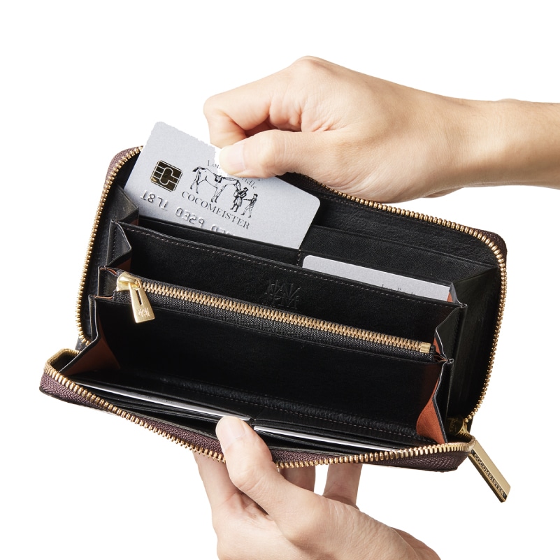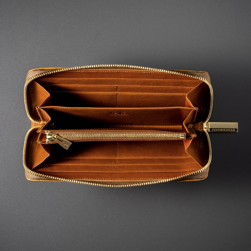 ハイエンドなオーダー製品を製作していた職人が丁寧に仕立てた大きめのラウンド長財布です。多くの貴重品を収納できる、収納力が魅力です。随所に、使用しても完成度の高さを実感できます。*ブラフマー色は内装ビターチョコ。