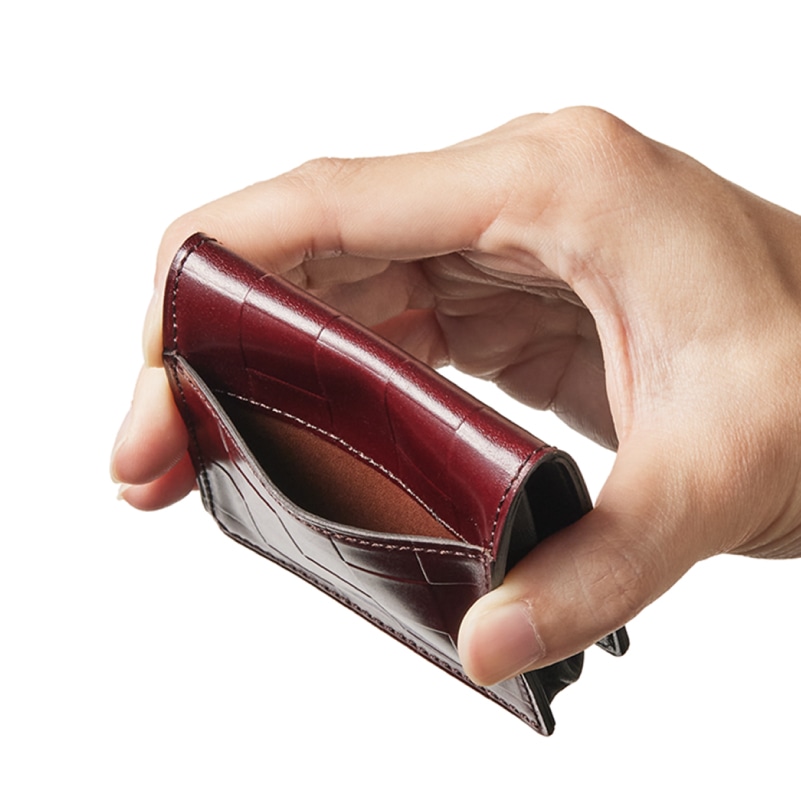最高級の日本製オイルコードバンに、チェス盤模様をプレスオン加工を施した、遊び心満載のコレクション。内装にはイタリア千年伝統のマットーネレザーを使用し、遊び心がありながら、本格派の仕立てが魅力です。職人技が冴えるBOX型の小銭入れ、中身が見やすく取り出しやすい。機能性も高く、全体の仕上がりがとても美しい、スタイリッシュな大人の小銭入れです。