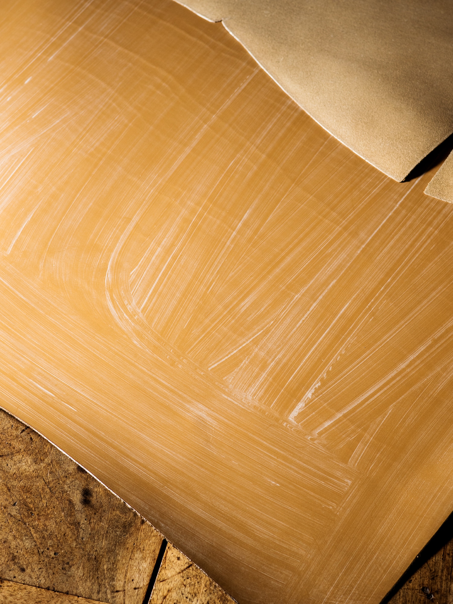 100%植物タンニンで鞣した後に、ロウを革の深部にまで入れ、さらにオイルを浸透させています。その上からガゼイン加工という、卵の白身の部分の成分を使用し、グレージング加工というツヤを上げていく仕上がりを行います。その際に、瑪瑙(メノウ)石という石で、革の表面を何度も滑らせて平らにし、表面を均一にしていく加工を施しています。