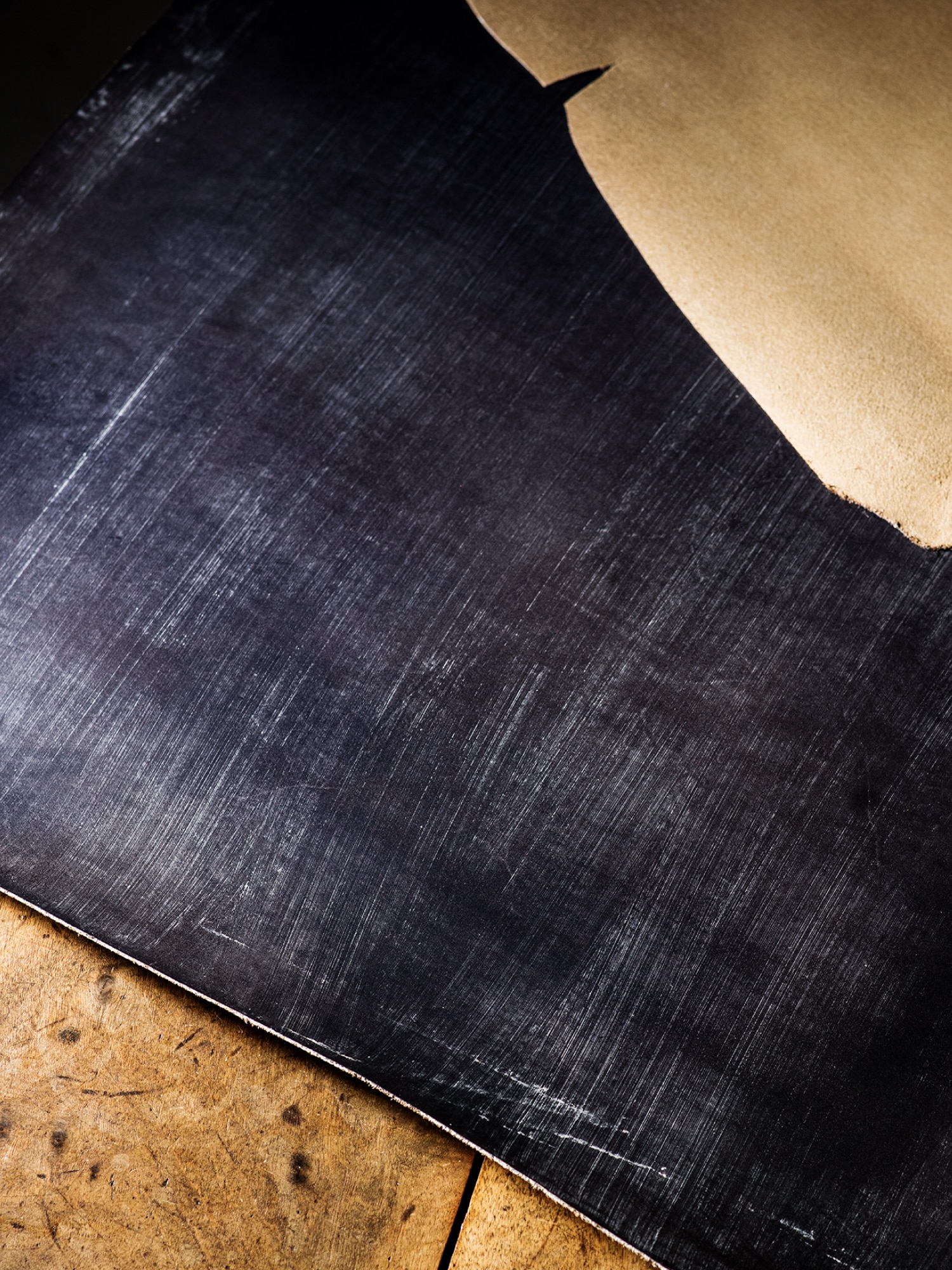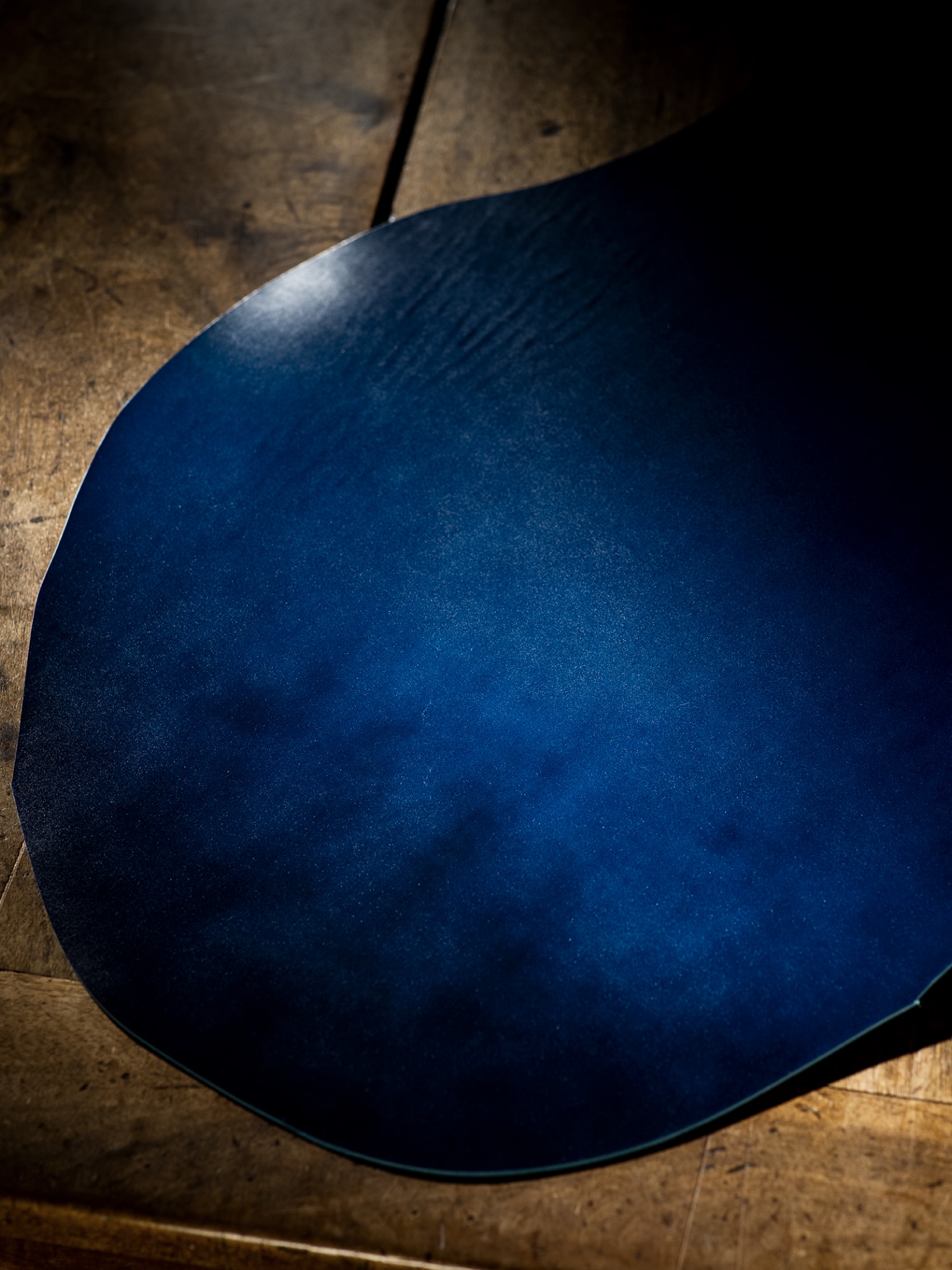 濃いブルーに染め上げたシークインブルーです。独特のムラ感は天然皮革ならでは、湖のようなグラデーションはとても美しく、使う味も楽しめます。