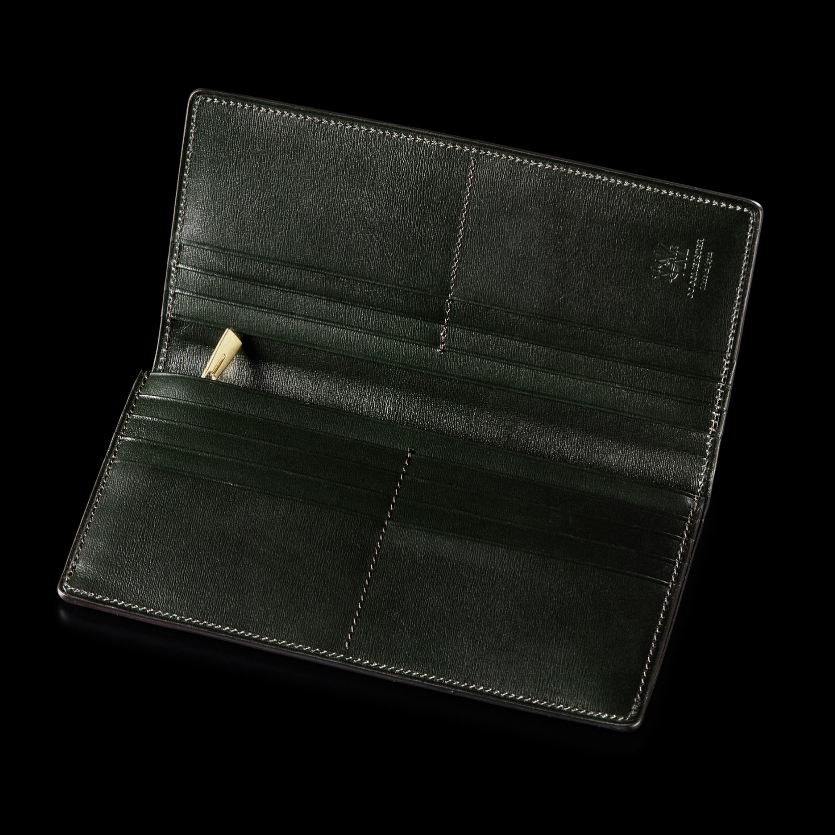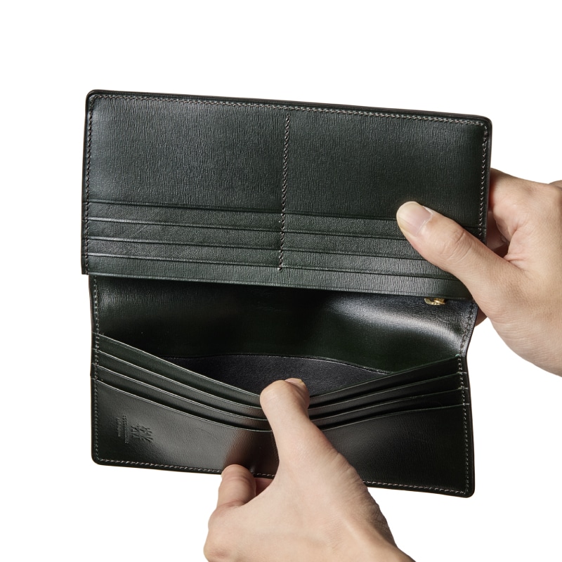 日本の伝統的な製法である“ササマチ”タイプの長財布です。横から見るとV字マチに見える部分がササマチの特徴です。スタイリッシュで洗練されています。カード入れが全て横向きになっているのも特徴です。
