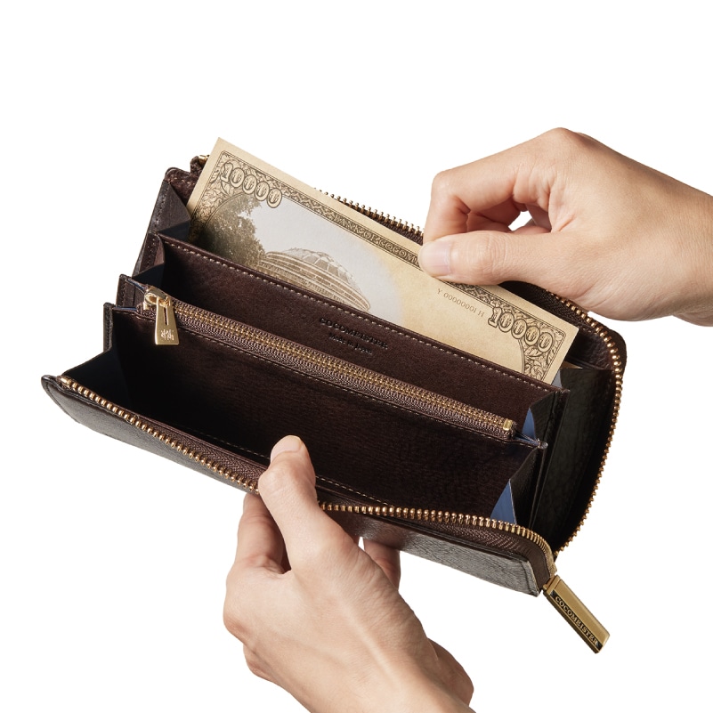 Detail 01手に持っても様になる重厚なフォルムがこのラウンドジップ長財布の人気の秘訣です。手に持って歩いてもお洒落、鞄に入れても格好よく手に馴染む革の質感もお洒落です。