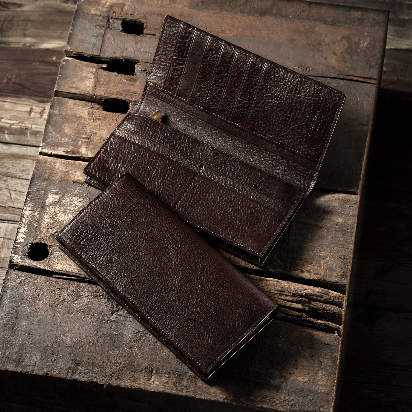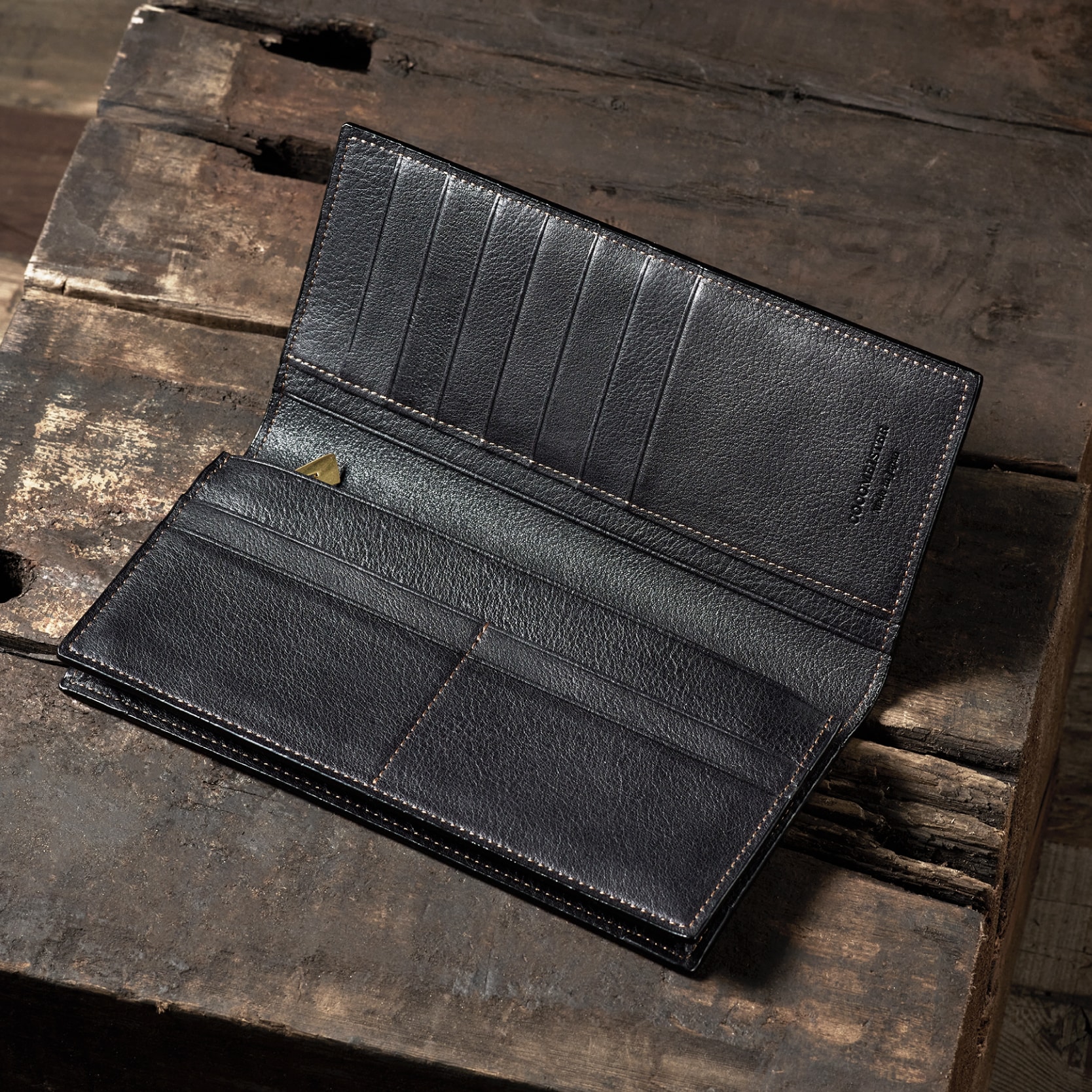 イギリスの高級革靴ブランド・ビスポークシューズ用のレザーを製作しているタンナーが、革靴レザーの技術を駆使して開発した、英国純正オイルレザー。圧倒的に洗練されたツヤと大人の渋さが魅力のコレクション。クラシカルタイプの長財布は、財布を開けばすぐにカードやキャッシュにアクセスすることができる便利さと、重厚なフォルムが魅力です。マチ部分に職人技を感じます。