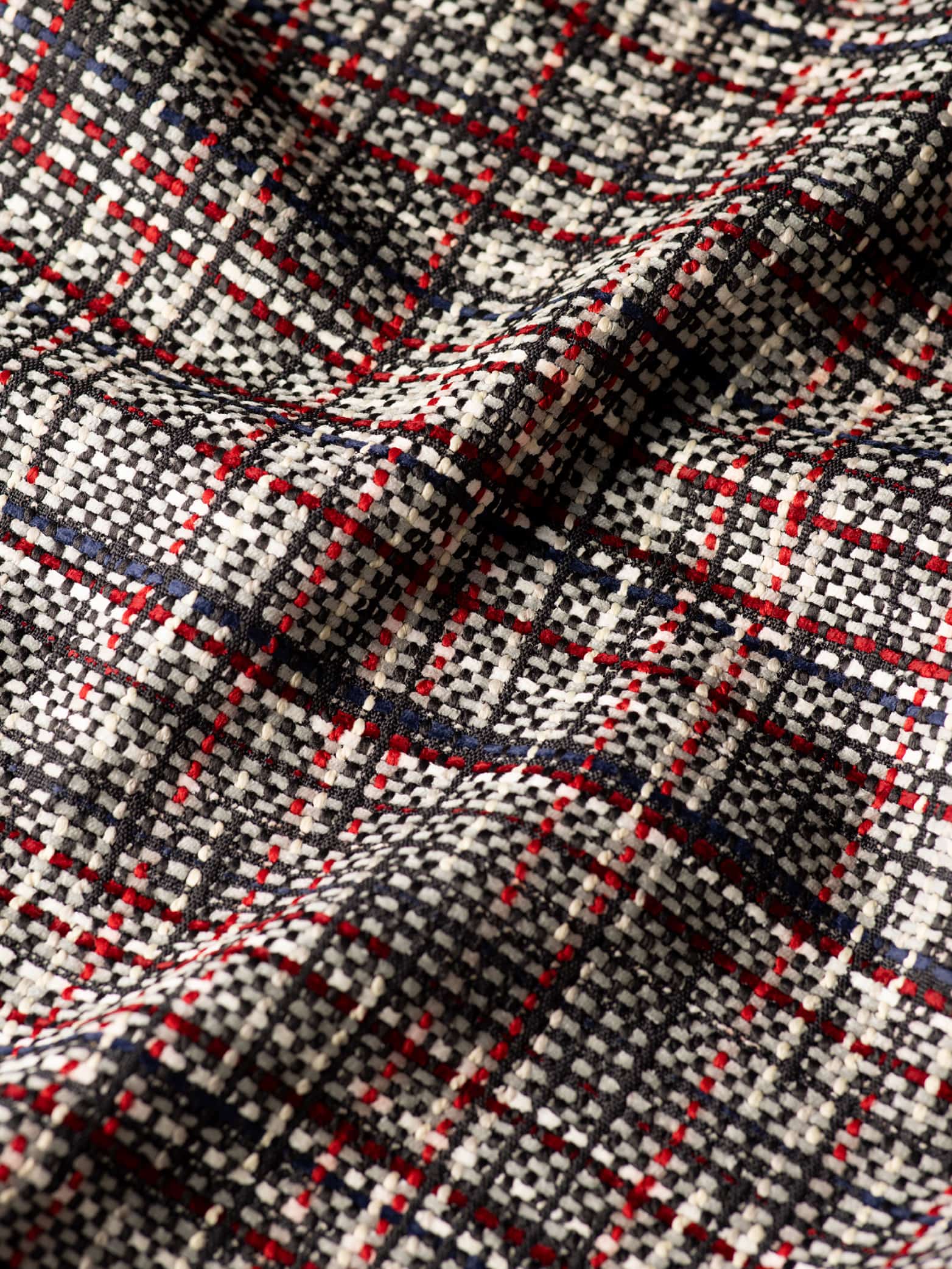 白を基調とし、レッド&ブルーの糸を立体的に織り込みました。主張の強い色を組み合わせていますが、とても上品でお洒落な仕上がりです。