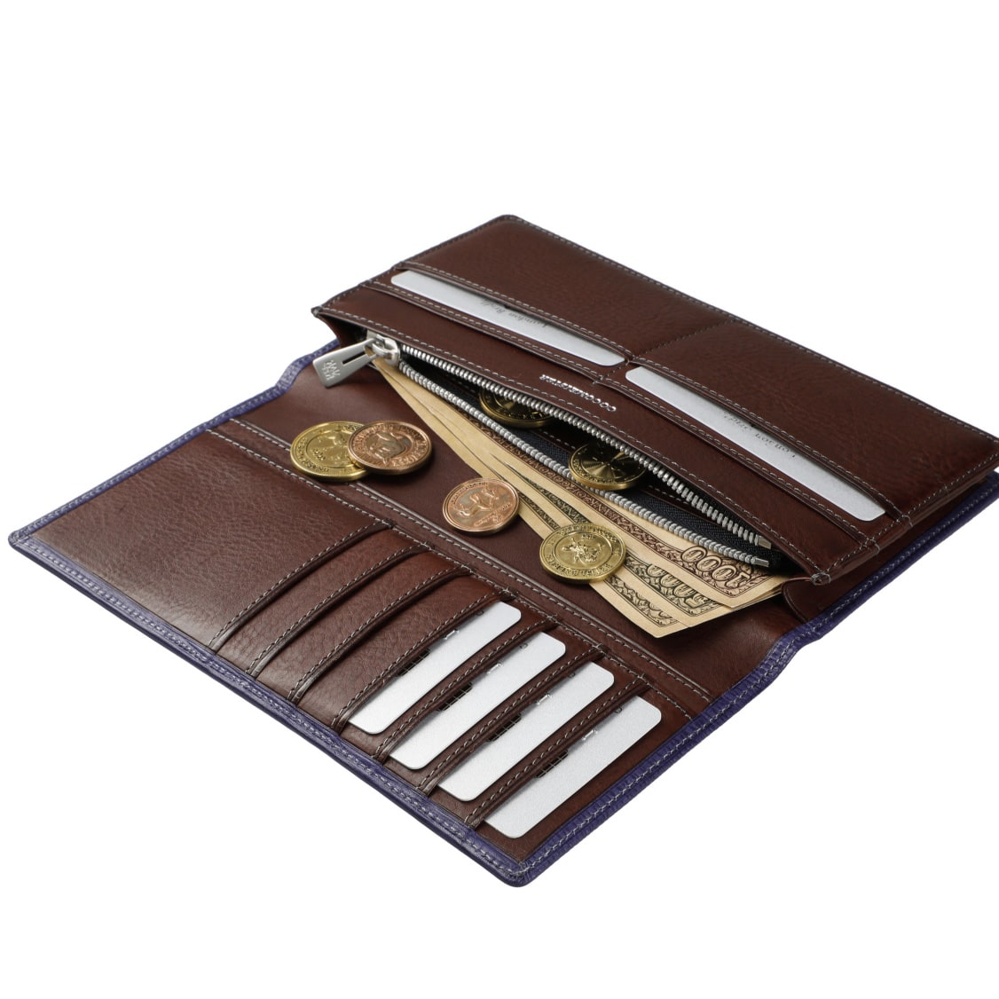 銀河からインスピレーションしたギャラクシーコレクションです。ゆらめく宇宙を感じさせる色味が魅力的、本格的なレザーを使用し、上品でお洒落な革製品に仕立てています。通しマチという製法で作られた長財布です。財布を開けばすぐにカードやキャッシュにスマートにアクセスできます。切れ端部分はヘリ返しという技術で製作しています。