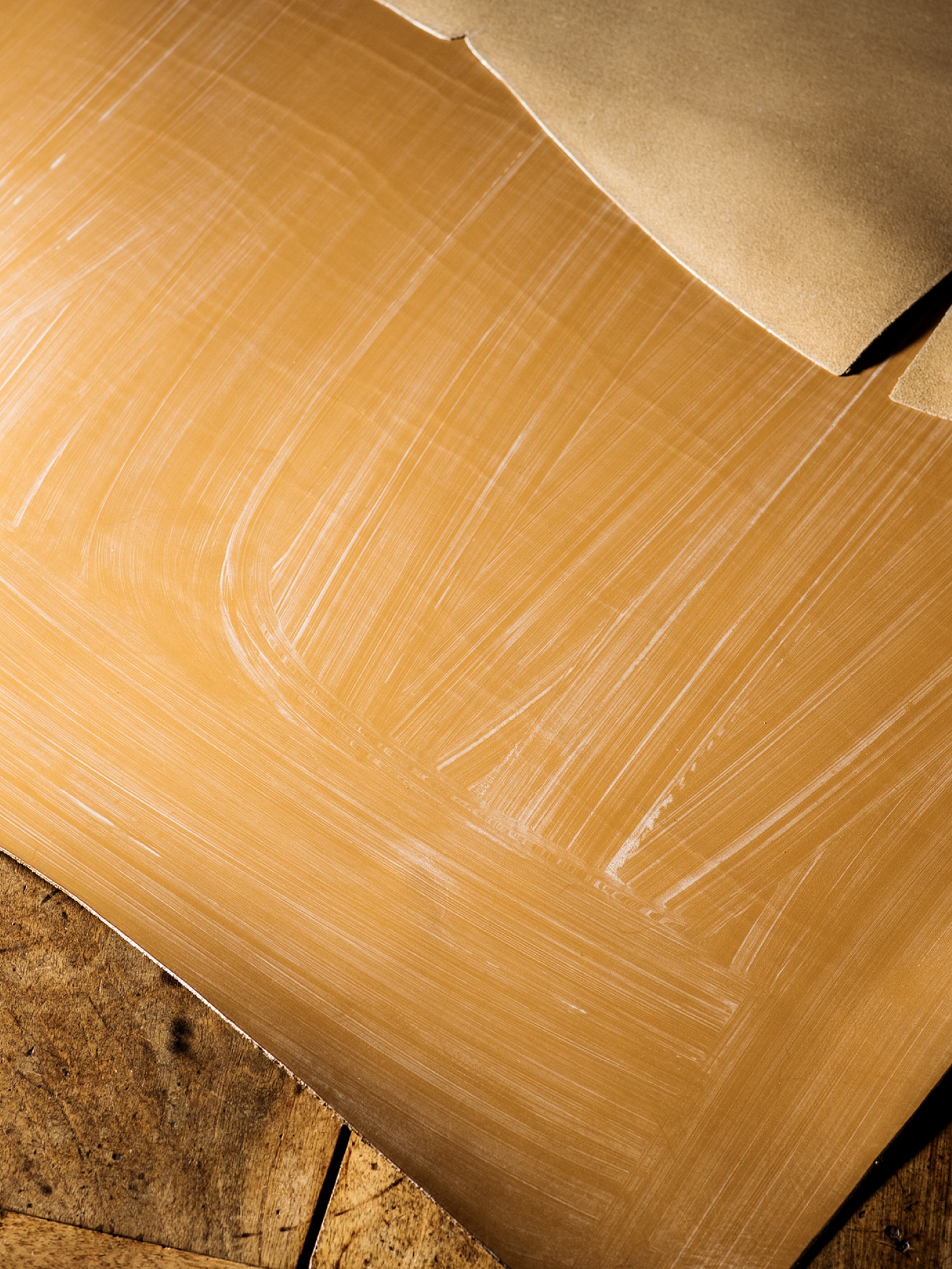 紀元前のヴィンテージレザーは高い耐久性の為、製作難易度が高い。素材の良さを生かしながら、美しい革製品へと仕立てる。ロウが繊維の奥にまで染み込んだオークバークは、とても高い技術を必要とする。プレスオンされたゴースト仕上げは、外装に凹凸があり、仕上げには高い集中力と技術が必要不可欠。