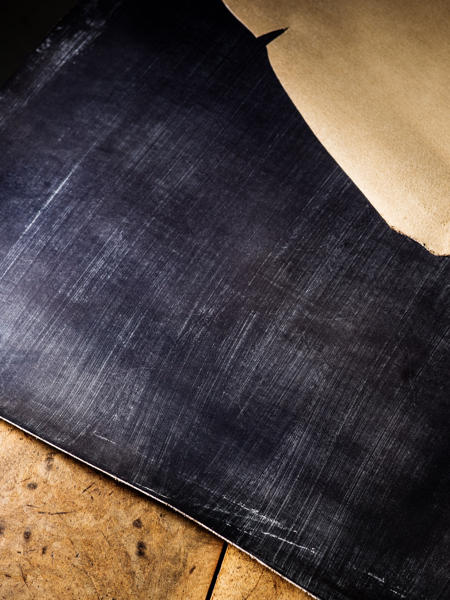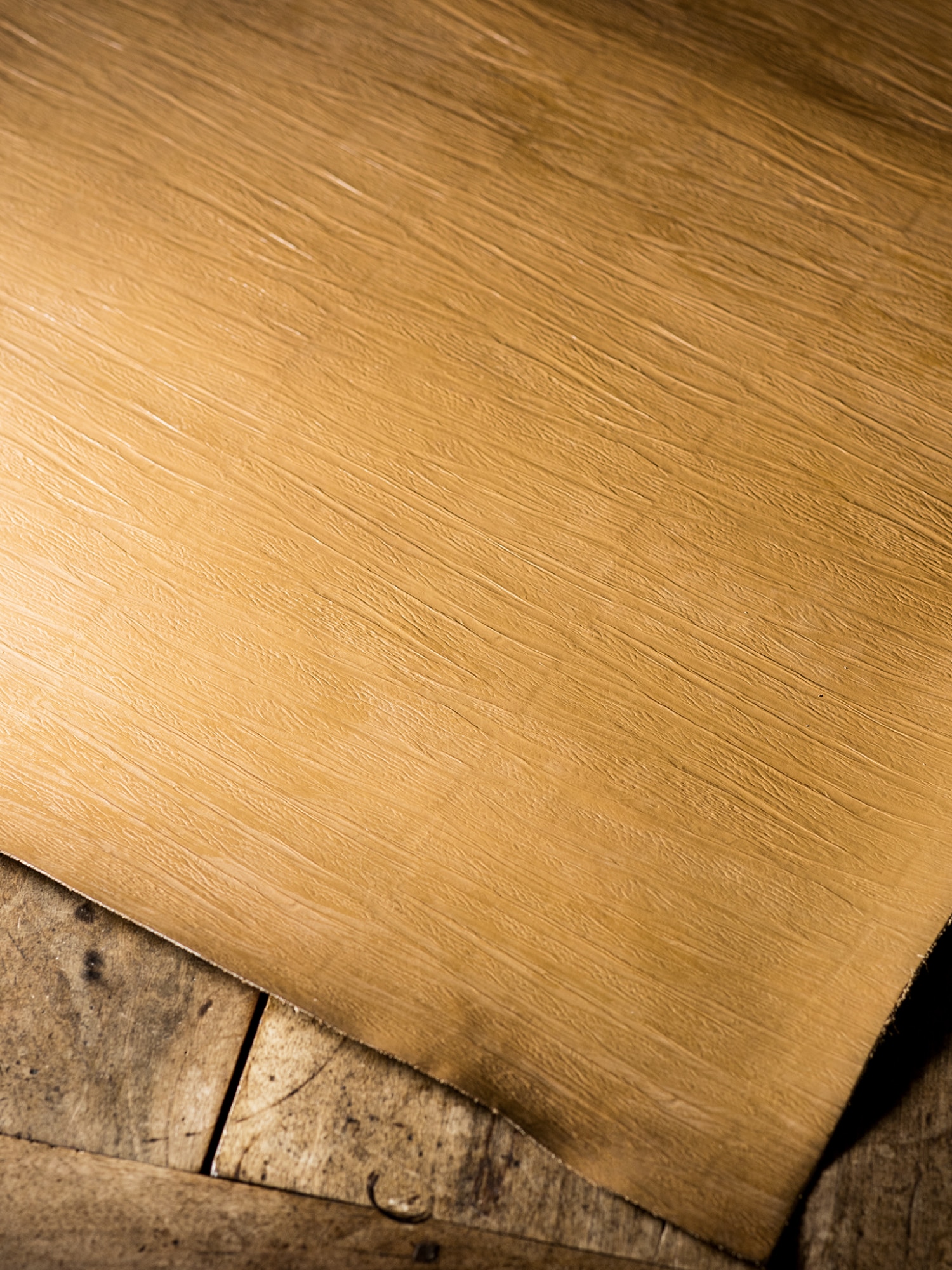 表面はオーク材“そのもの”にも見える表情です。紀元前ルーツの天然皮革オークバークだから実現できる、ナチュラルかつお洒落な風合いです。一般的な傷や生地悪さを隠す型押しでは無く、上質なオークバークレザーにプレスオンすることで、完成度にもこだわり、圧力や熱量を徹底的に管理・時間を掛けることで、この完成度を実現しています。