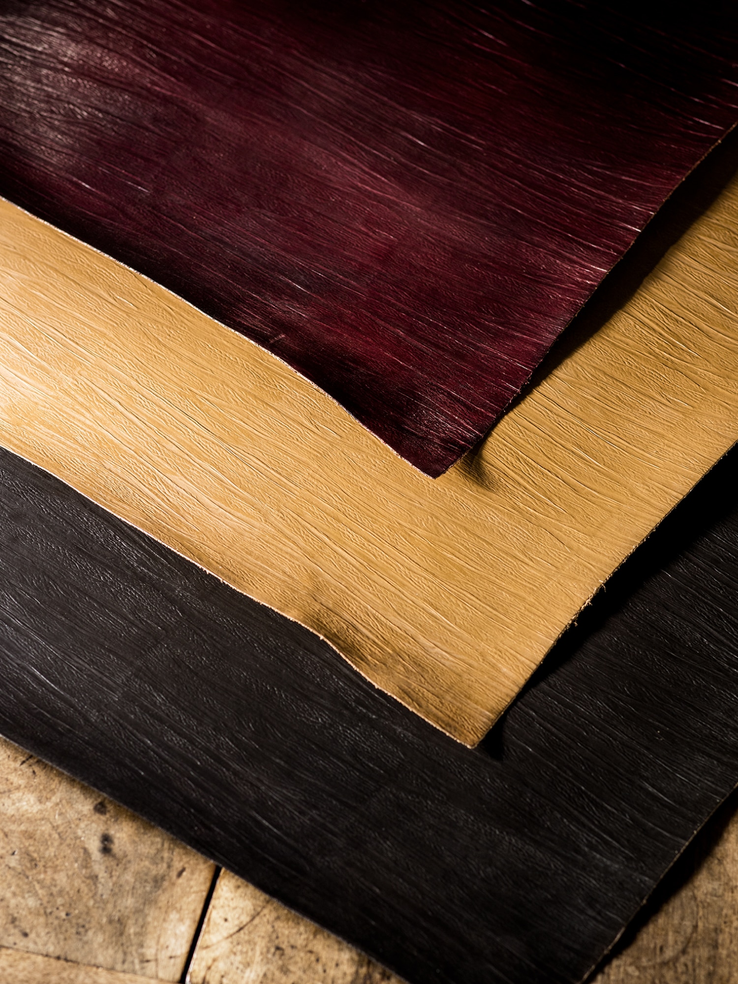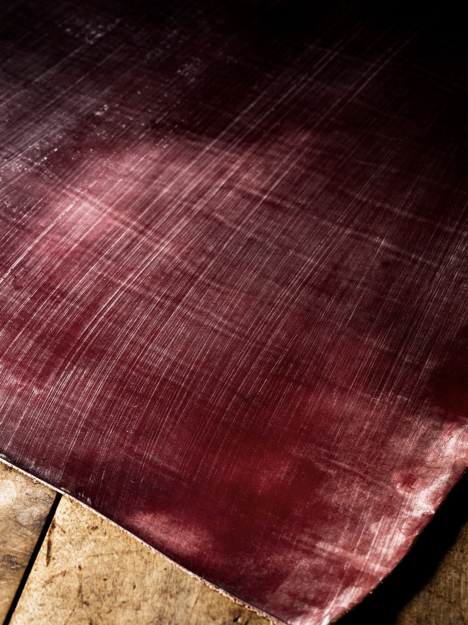 ボルドーの深い色味が特徴的。赤ワインの透き通る濃厚感をレザーで実現しています。ワイン樽と同じく、オークの木と混ぜて染色しており、とても深く芳醇な赤ワイン色を堪能出来ます。不気味に燃える森をイメージした色味。