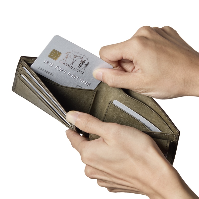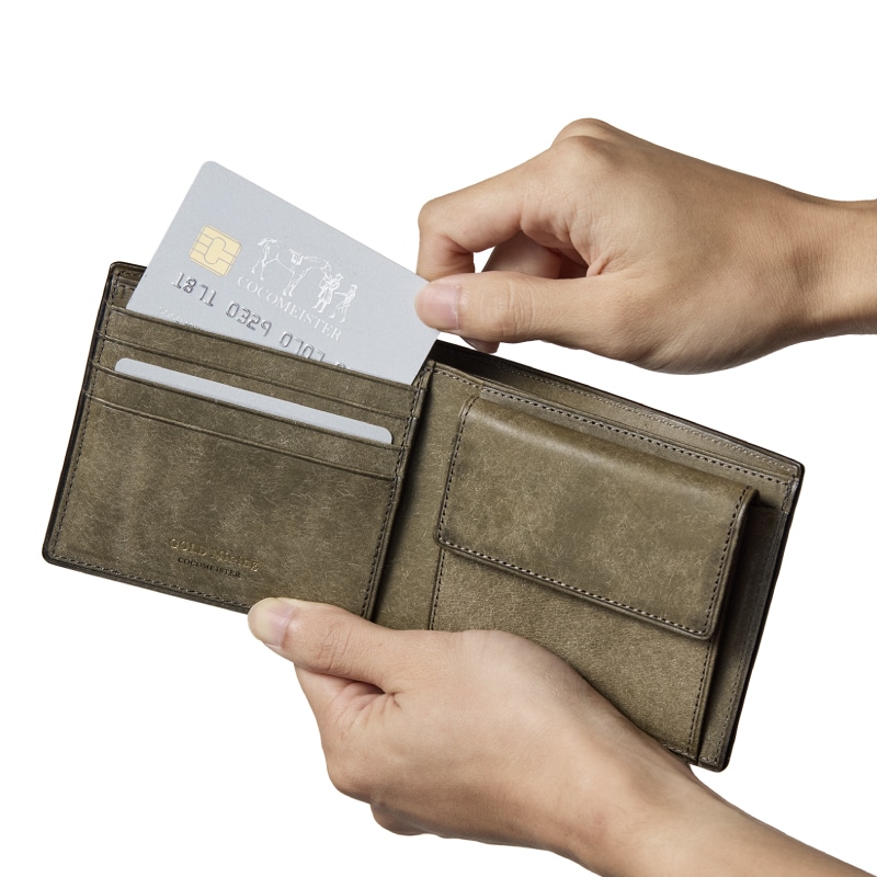 クラシカルで洗練された2つ折り財布です。細部まで丁寧に作り込み、お札は仕切りを付けて2部屋に分け、カードも2枚お札入れの中に収納できます。革を薄くし重ねて作り上げる2つ折り財布は芸術的です。