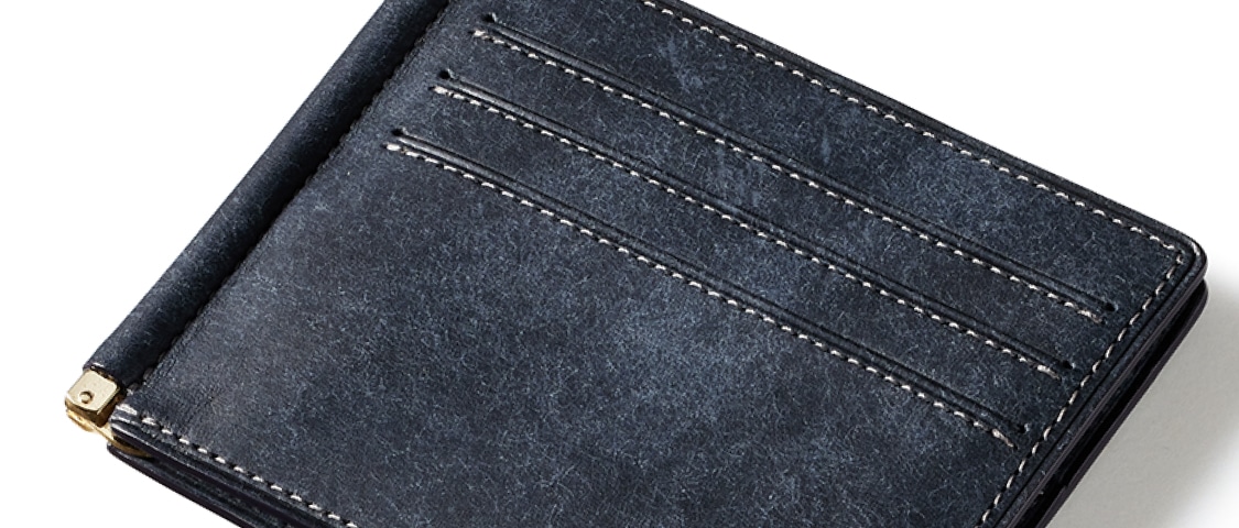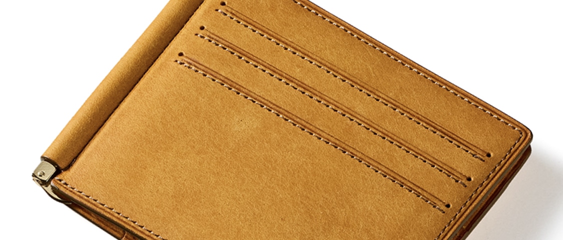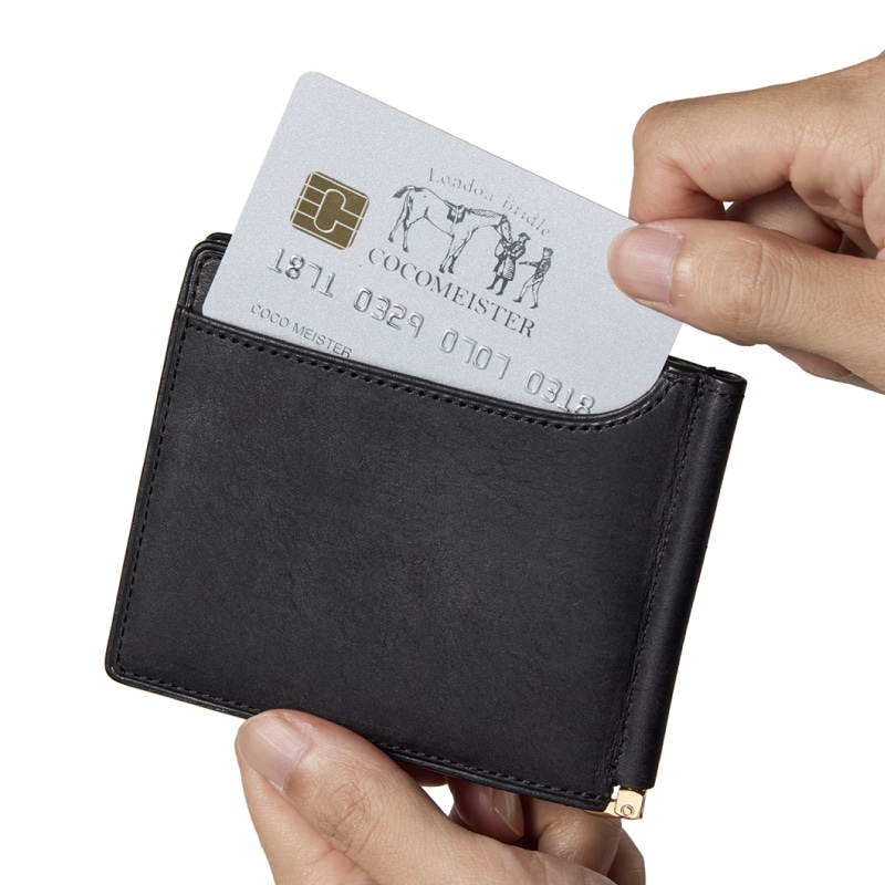 ゴールド色の金具がアクセントのマネークリップです。カード入れを多く装備し、薄くスタイリッシュな仕上がりながら、しっかりとしたレザー感をお楽しみいただけます。
