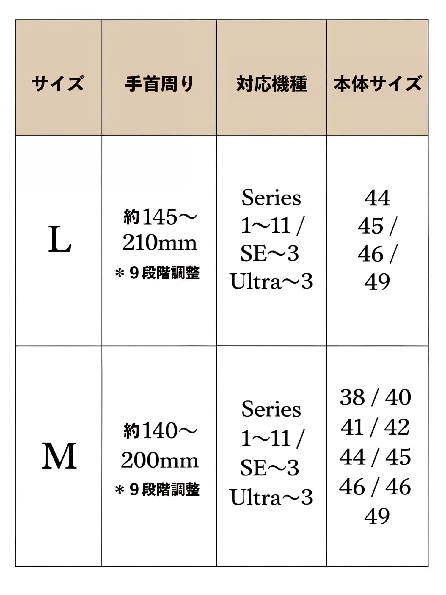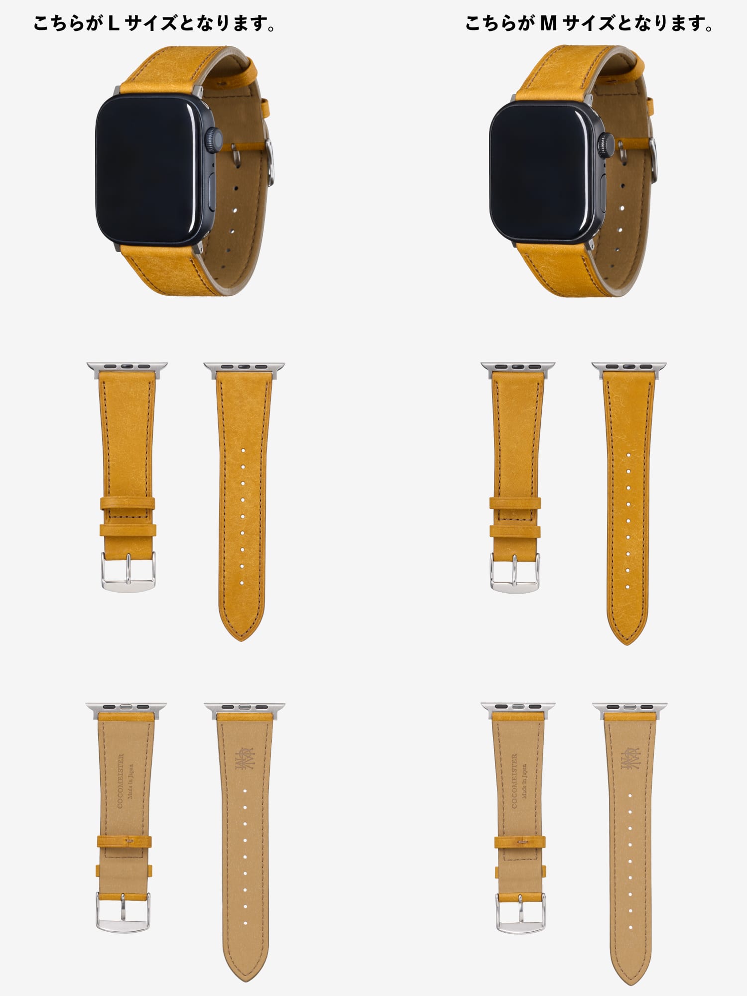 Apple Watchバンドは M・L の2サイズをご用意しています。大きな違いは、本体サイズに合わせて設計された“アタッチメント幅”です。M サイズは 38・40・41mm に加えて 49mm まで装着可能。L サイズは 44・45・46・49mm に最適化された仕様です。