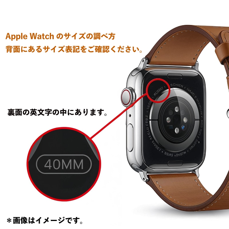 Detail 04Apple Watch 本体裏面に刻印された「40mm」「44mm」などの表記をご確認ください。表記サイズに合ったバンドをお選びいただけます。