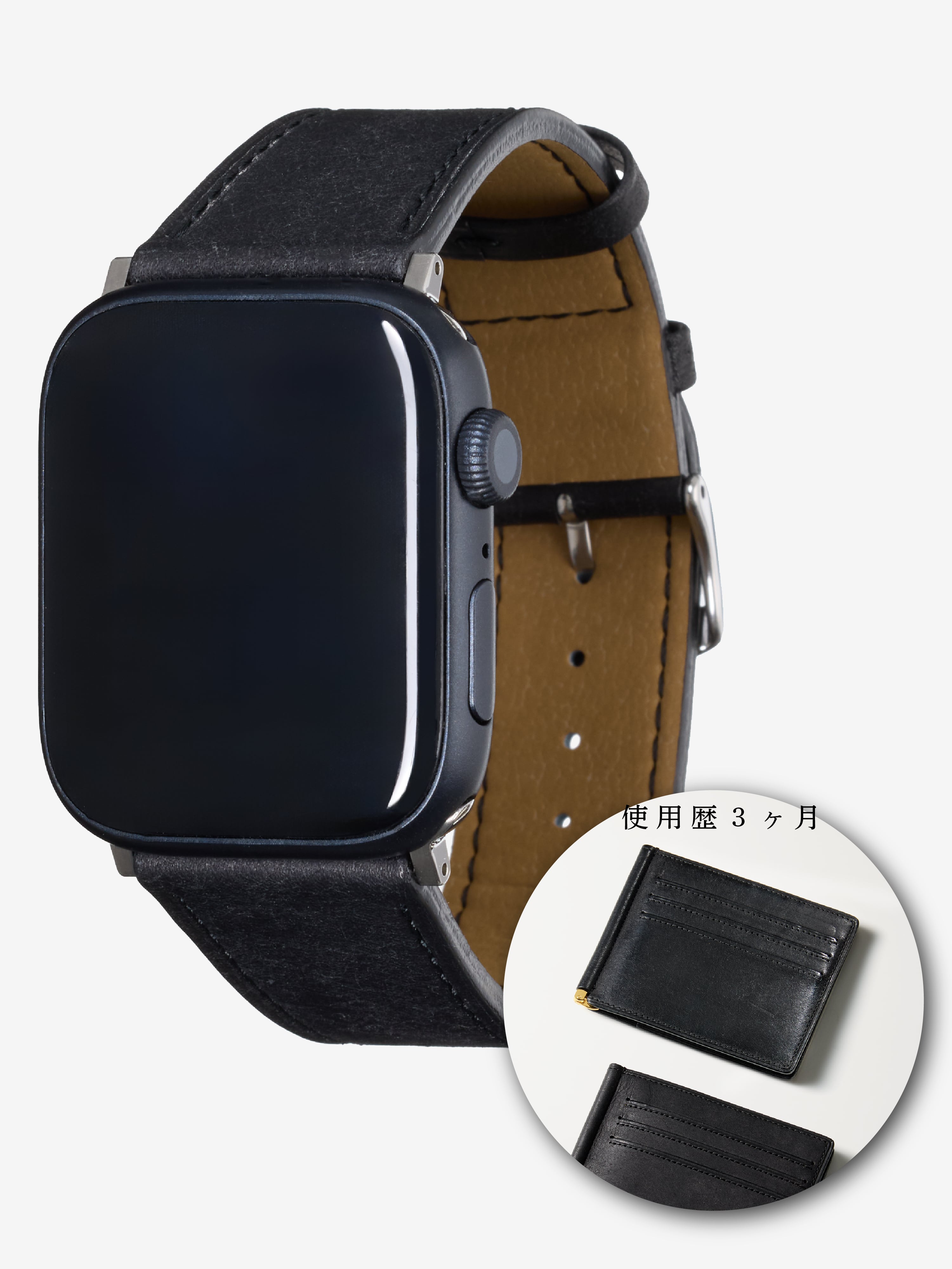 マットな風合いの黒色から、艶のある黒色へと変化する。重厚感と美しさが調和した極上のブラックです。プエブロレザーの黒の魅力を最大限に引き出し、手元のApple Watchに圧倒的な存在感を与えてくれます。使うほどに深みが増し、唯一無二の黒へ育ちます。