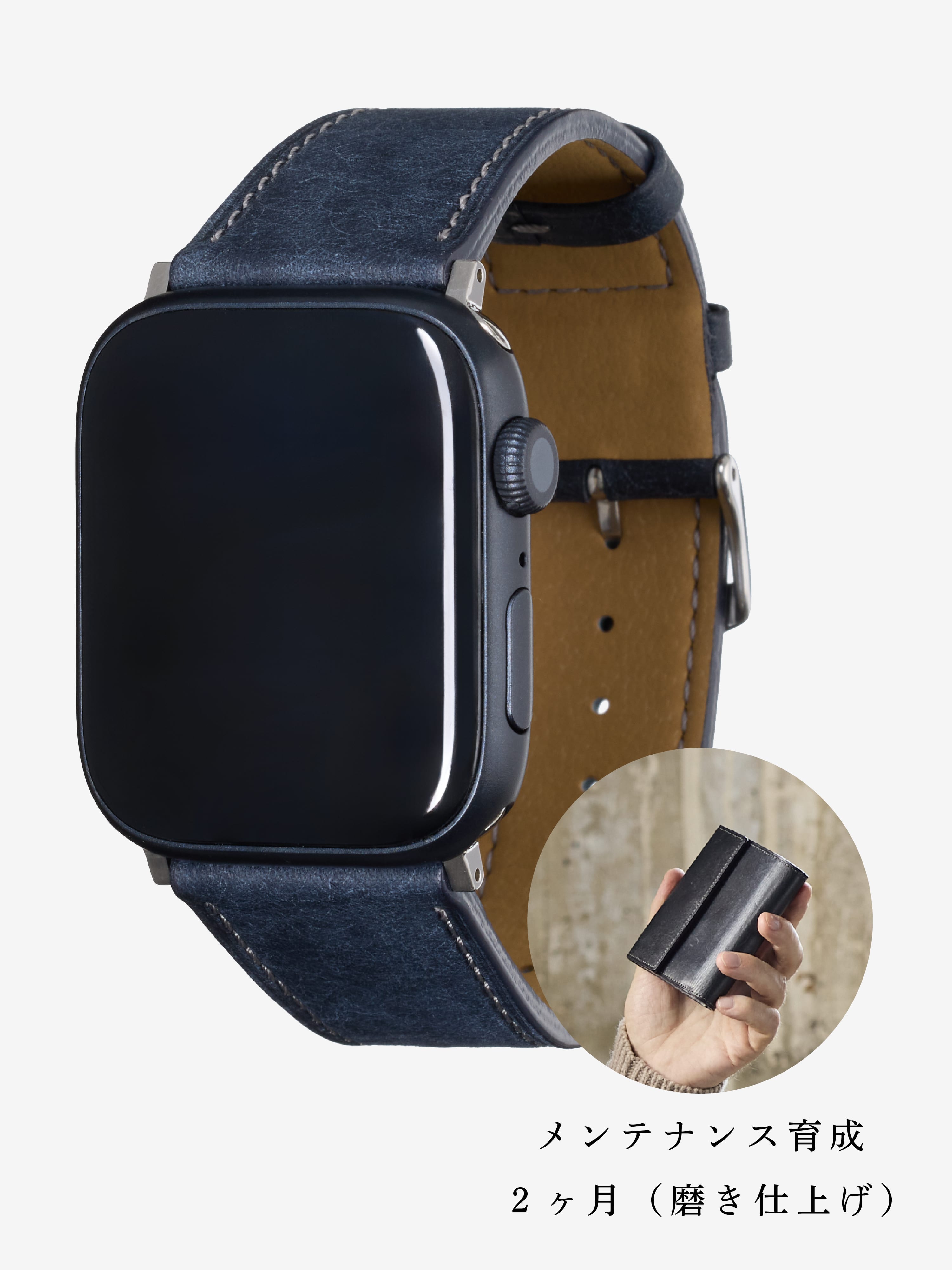 砂金を抽出する水をイメージしたウォーターウォッシュ。深みのある落ち着いた青色が魅力で、Apple Watchに上品なアクセントを添えます。表裏の統一感も美しく、経年変化すると青の深度が増し、艶が大幅に向上。高級感あふれる成熟した表情へと育ちます。