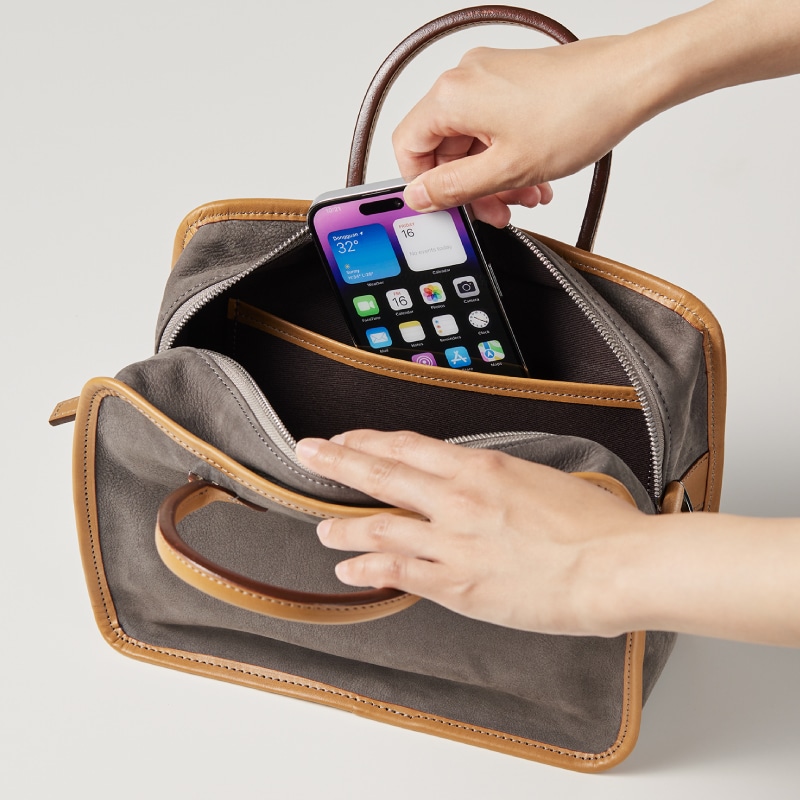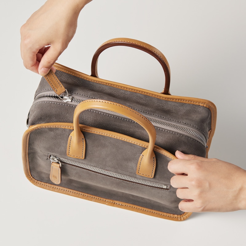 質感にこだわり抜いた極上スペインヌバックを本体に使用し、希少皮革オークバークをフチや持ち手に採用しクラシカルな風合いを取り入れたミニバッグ。特別な熟練工が仕立てることで実現した、絶妙なフォルム。素材の組み合わせ。ショルダーベルトを装着し休日を優雅に持ち運ぶ、ショルダースタイルを基本とし、ベルトを外すことでセカンドバッグとしてもお洒落に使えます。