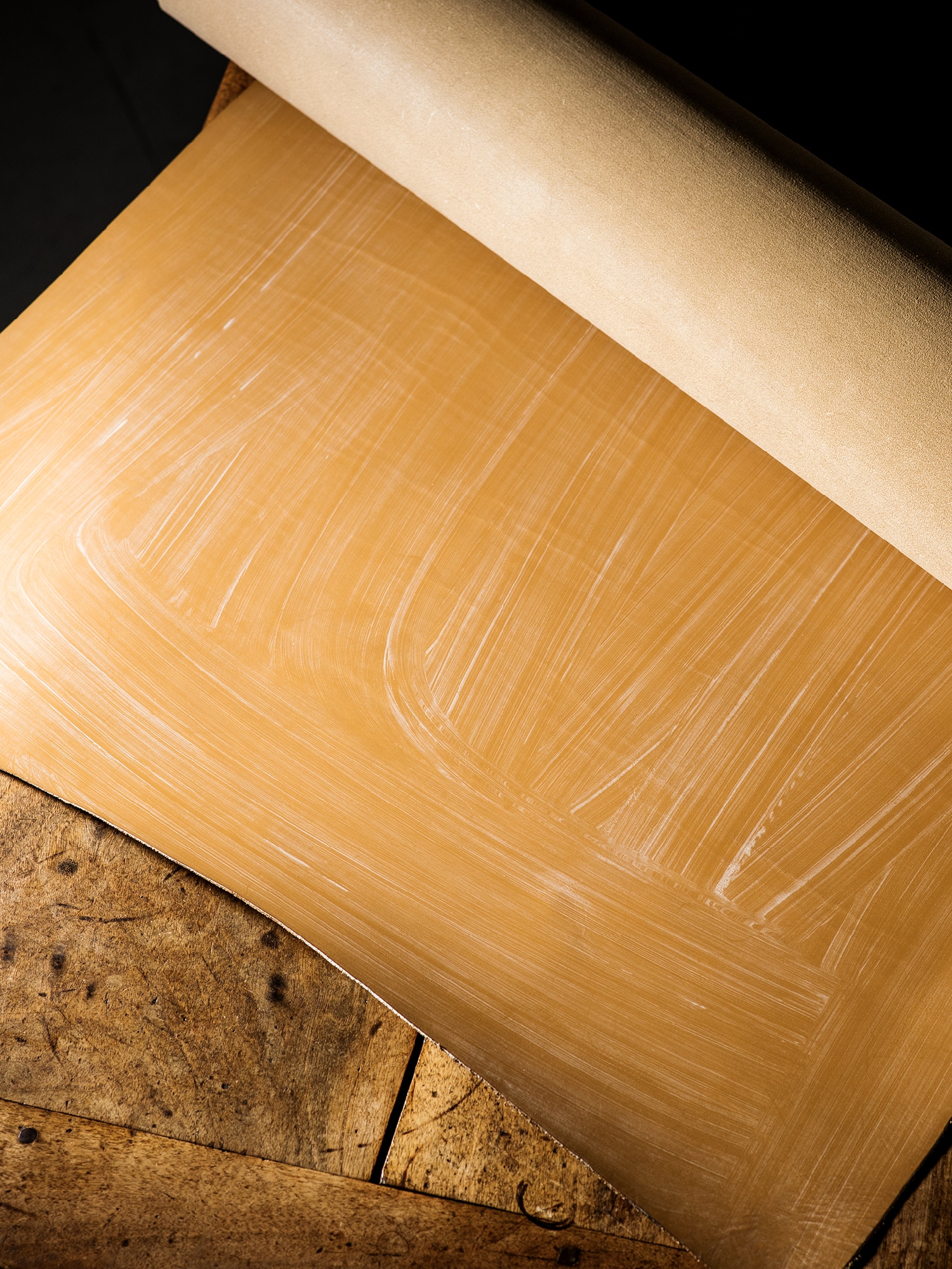 古き良き伝統を実現する上で、オークバークレザーは必要不可欠。365日と1日を掛けて、紀元前ルーツの製法で作られたヴィンテージレザーが、財布を引き立てる。