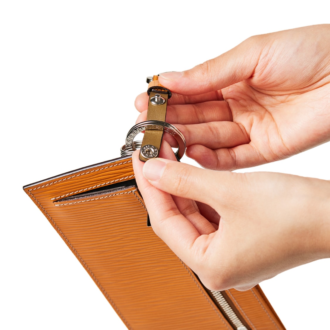 Detail 01薄型のコインカードホルダーに、キーリングの要素と日本札を収納できるスペースをご用意。ナスカン付きミニベルトで鞄にも装着が可能、また、ミニベルトを本体からも取り外し可。