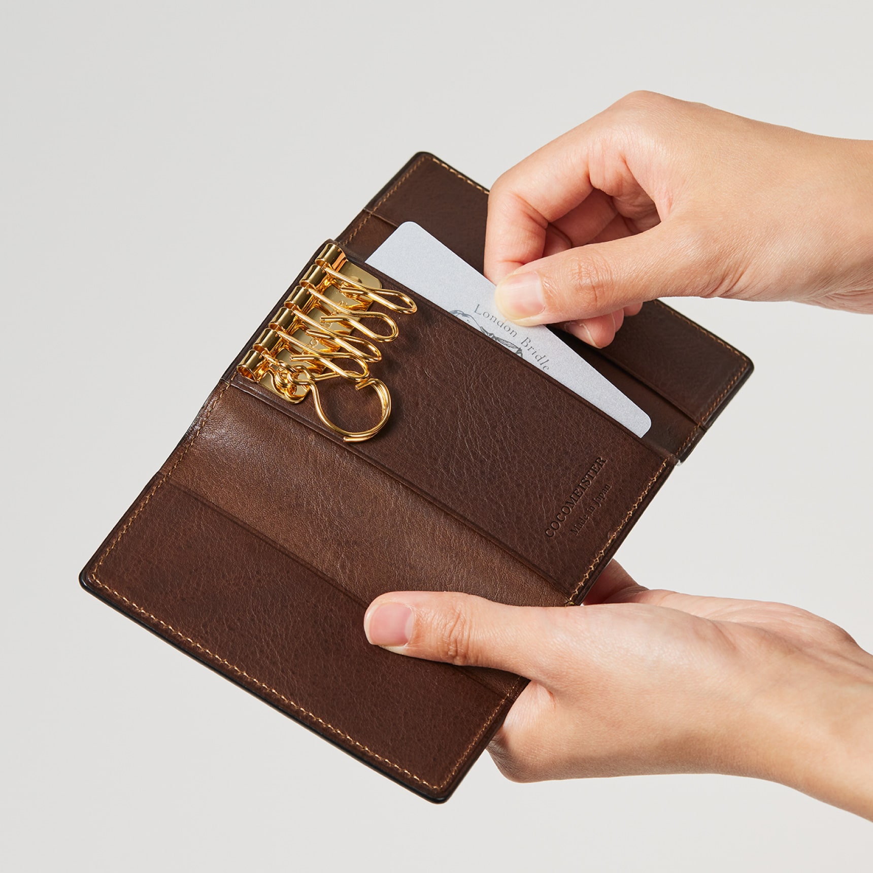 最高級のオイルレザーを使用し、ヴィンテージな風合いのキーケースを楽しめます。キーリングは5連、一番左側に大きなリングが付いています。キーリングの裏側にはカードを収納できるスペースがあります。革を薄く漉き、キーケースとしても高い完成度を実現しました。